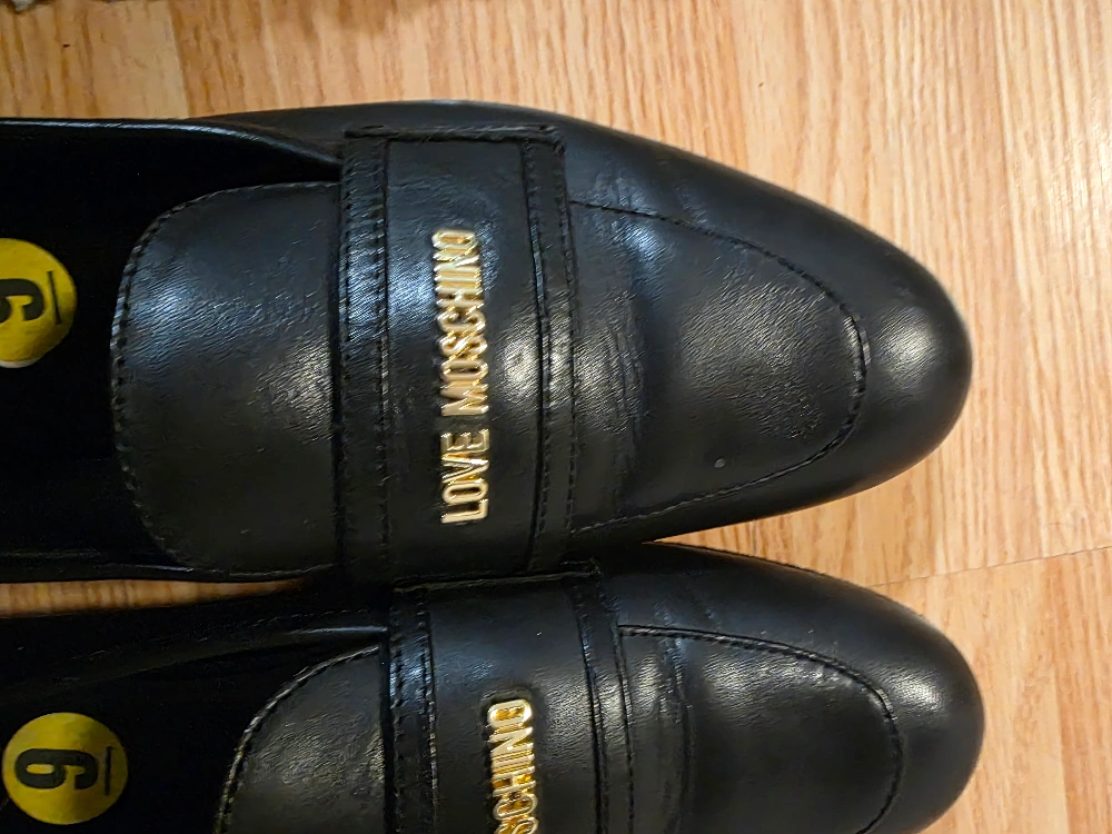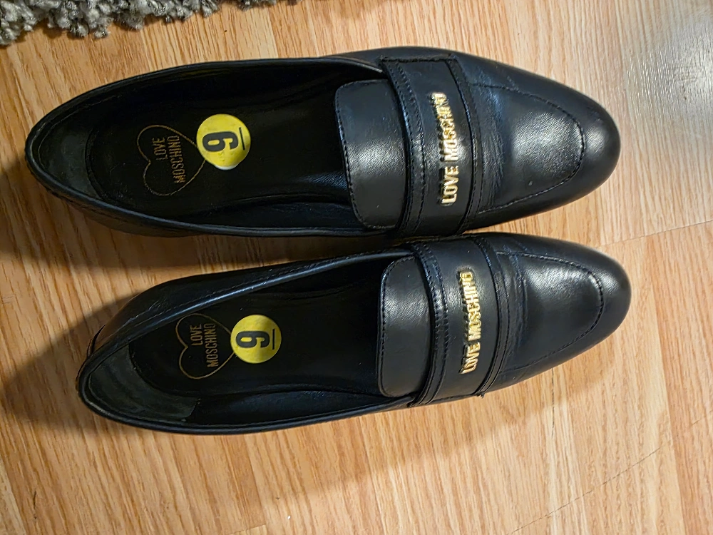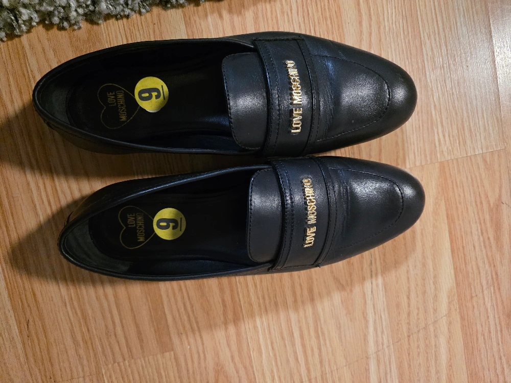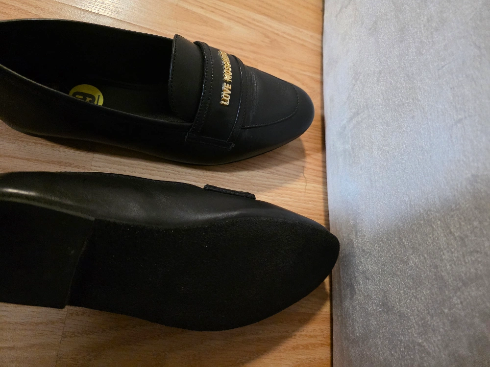 Selling a pair of Love Moschino loafers in black. They are a size 9. The shoes have the Love Moschino logo on the front strap. They are in good condition and ready for a new home!