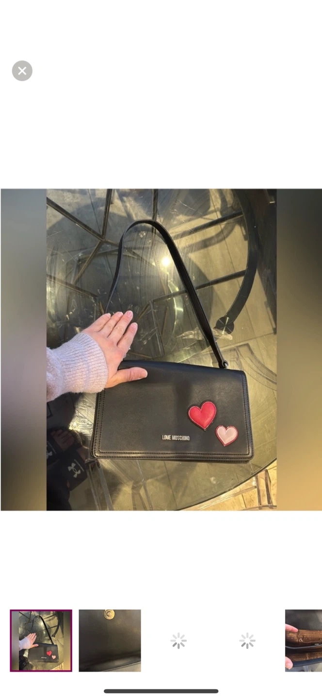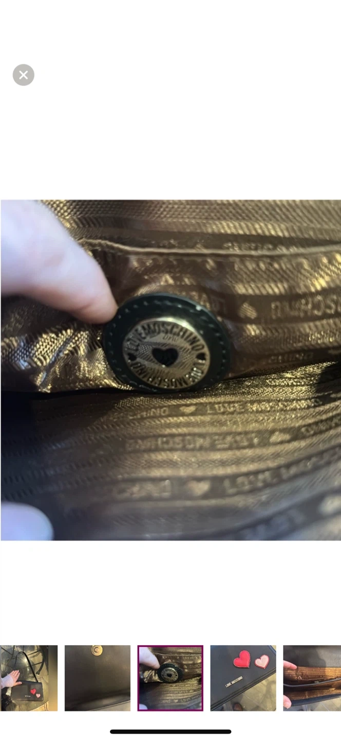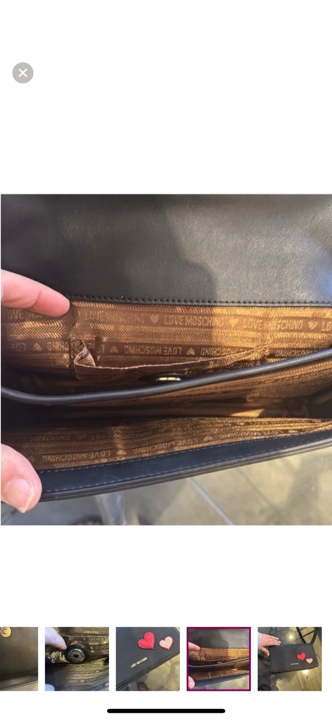 11Selling a Love Moschino shoulder bag in black! It has cute heart details on the front. The interior lining has the Love Moschino logo printed throughout. It's in great condition and ready for a new home