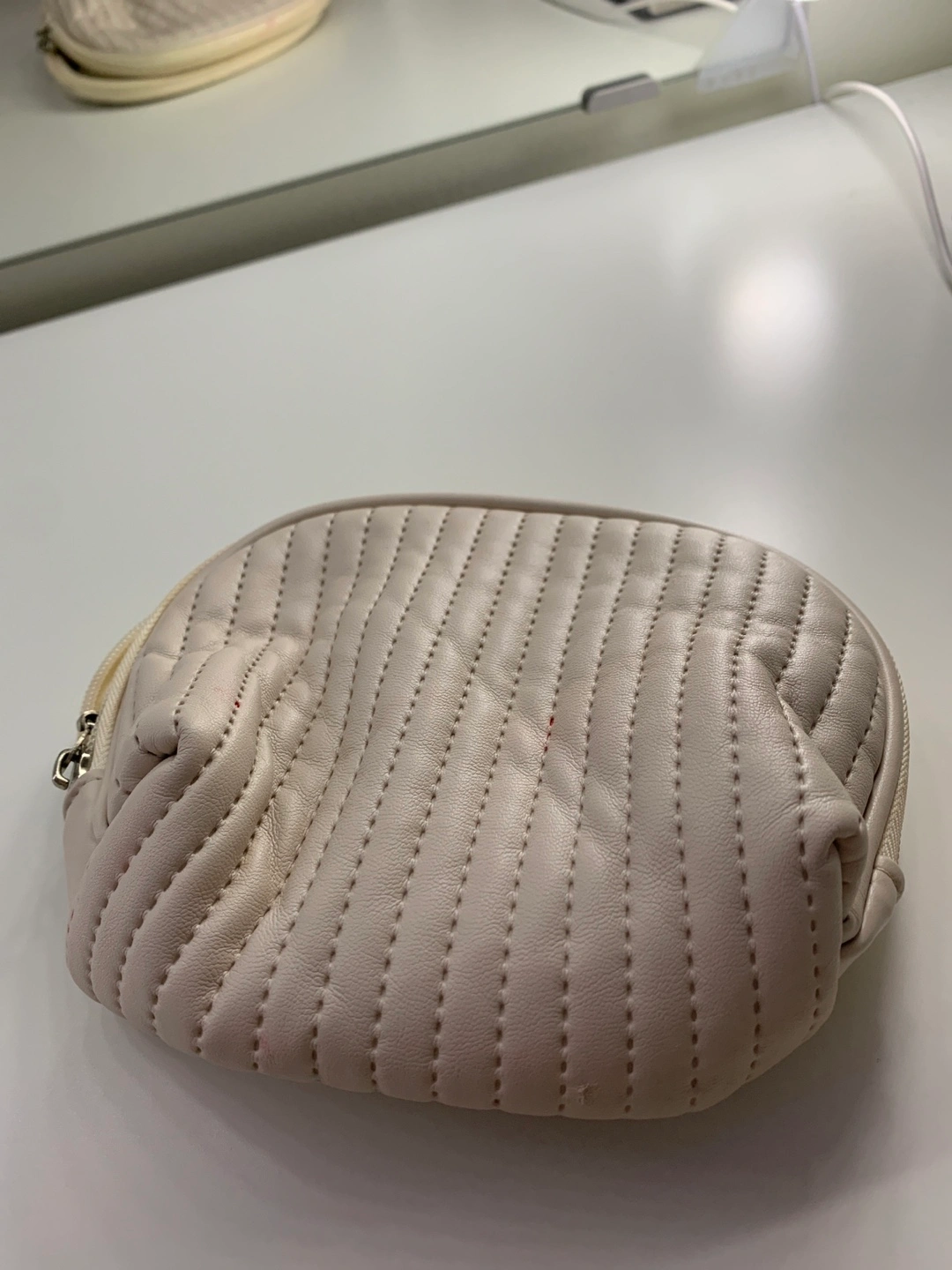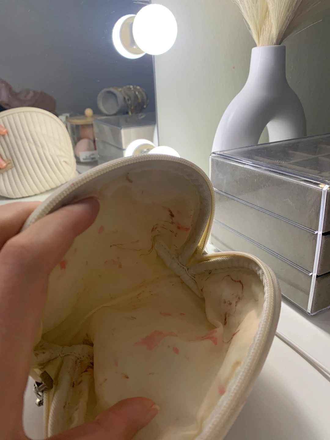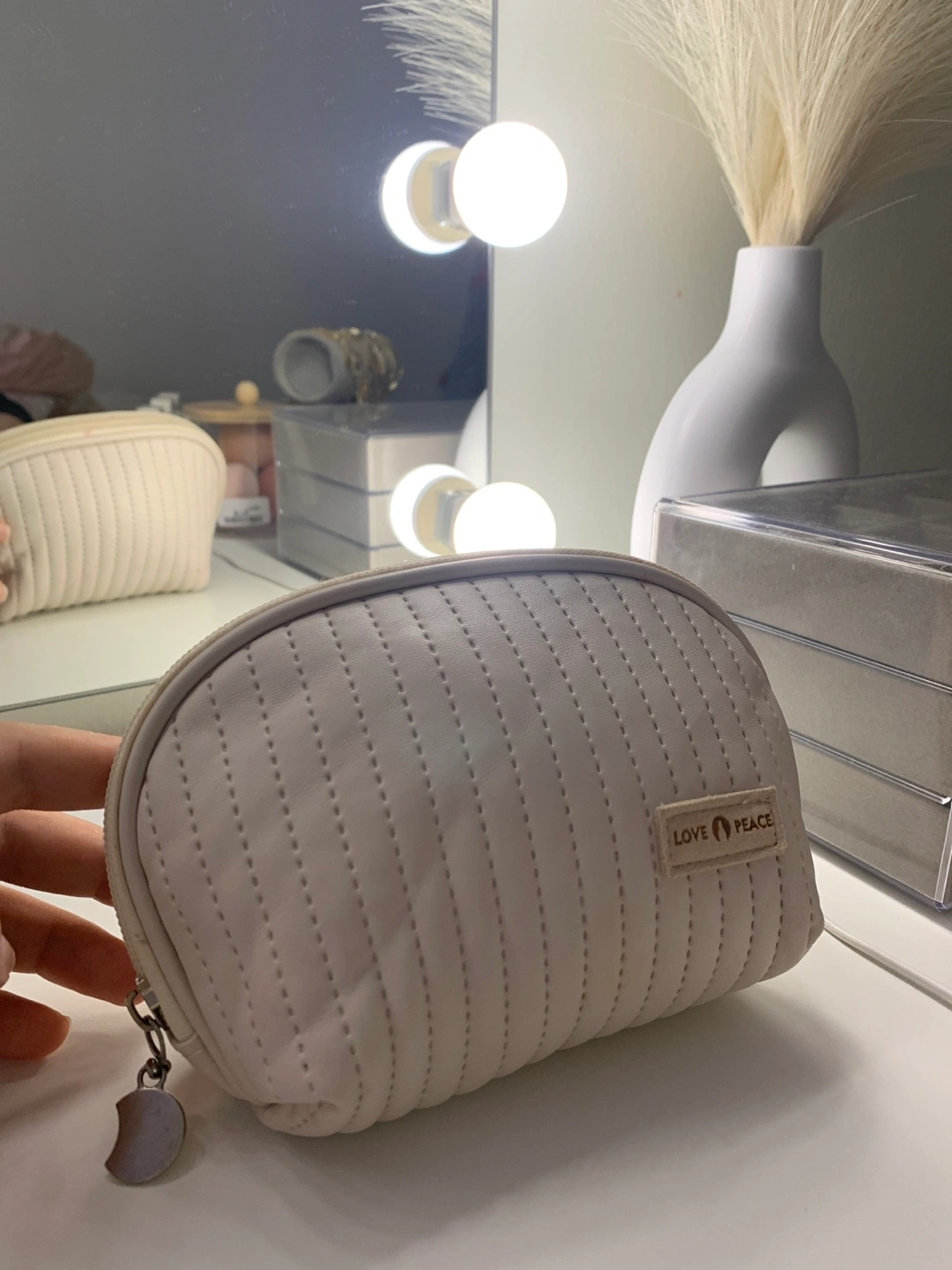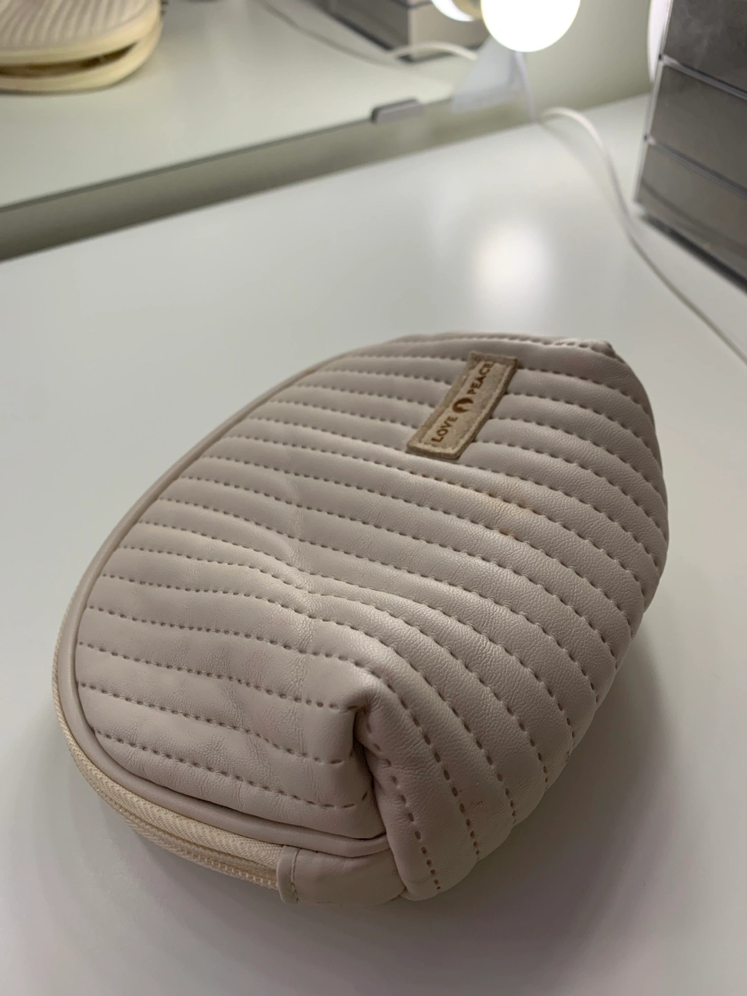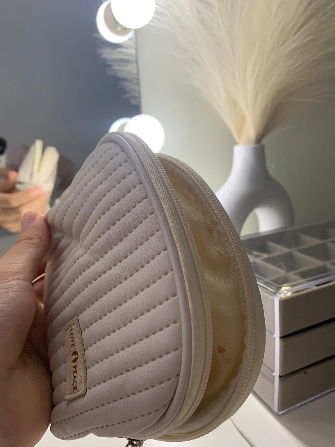 Selling a LOVE & PEACE makeup bag. It's a quilted design and a light, neutral colour. There are some stains inside the bag.