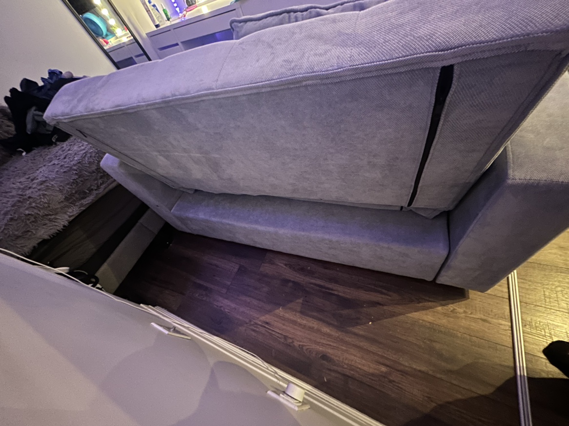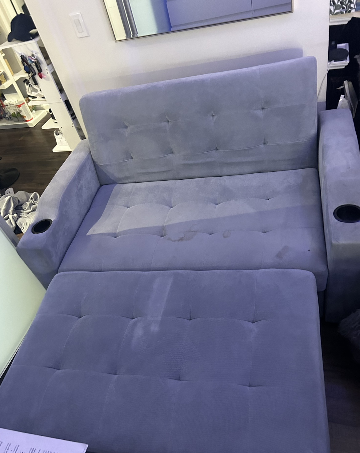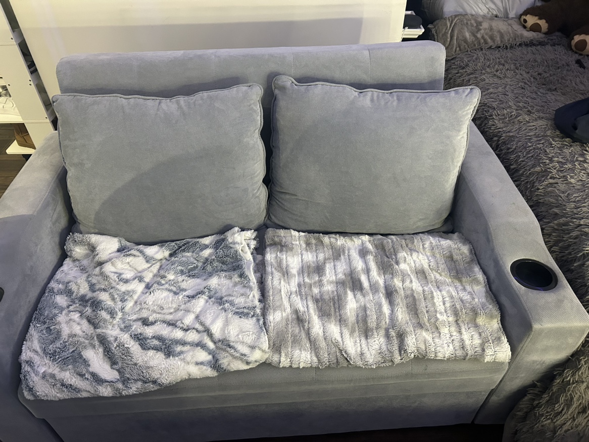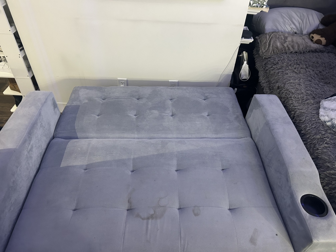 33I bought this for sale for 500 but going price was 1000. It has a stain on it that i’m working on getting out and hopefully will. Price is negotiable. Stain can be covered with a cute blanket like I did in the photo. Has pocket at the back that can be for storage with small items. It can pull out as just a foot rest or fully down into a bed. Can fit 2 ppl sleeping and is great for guests!