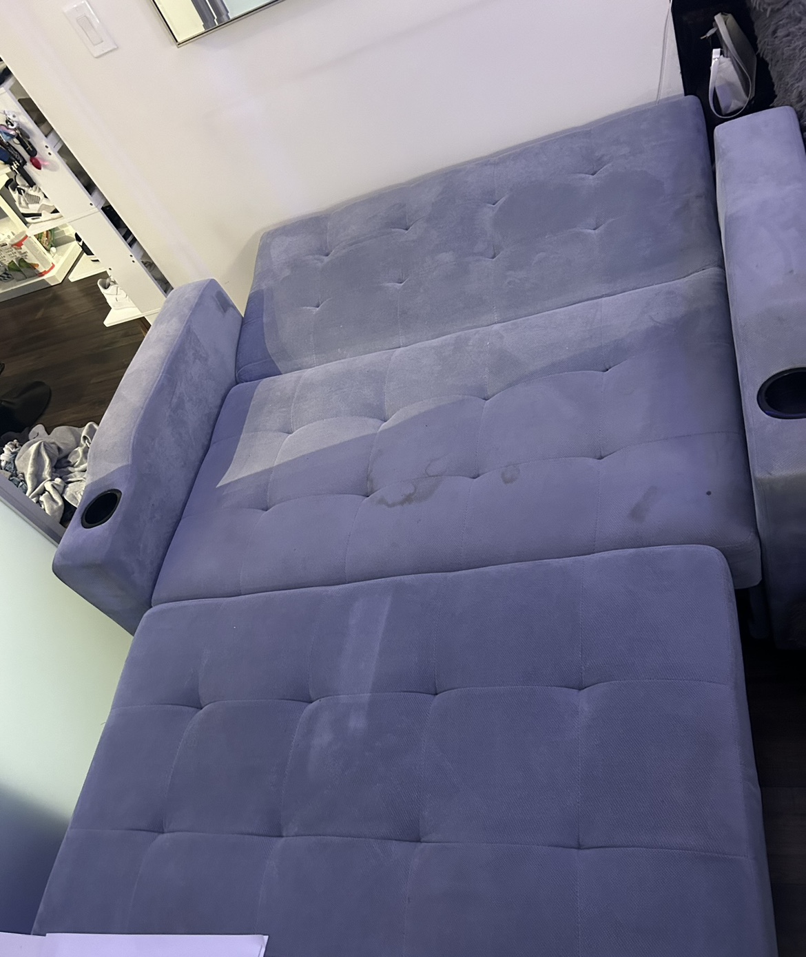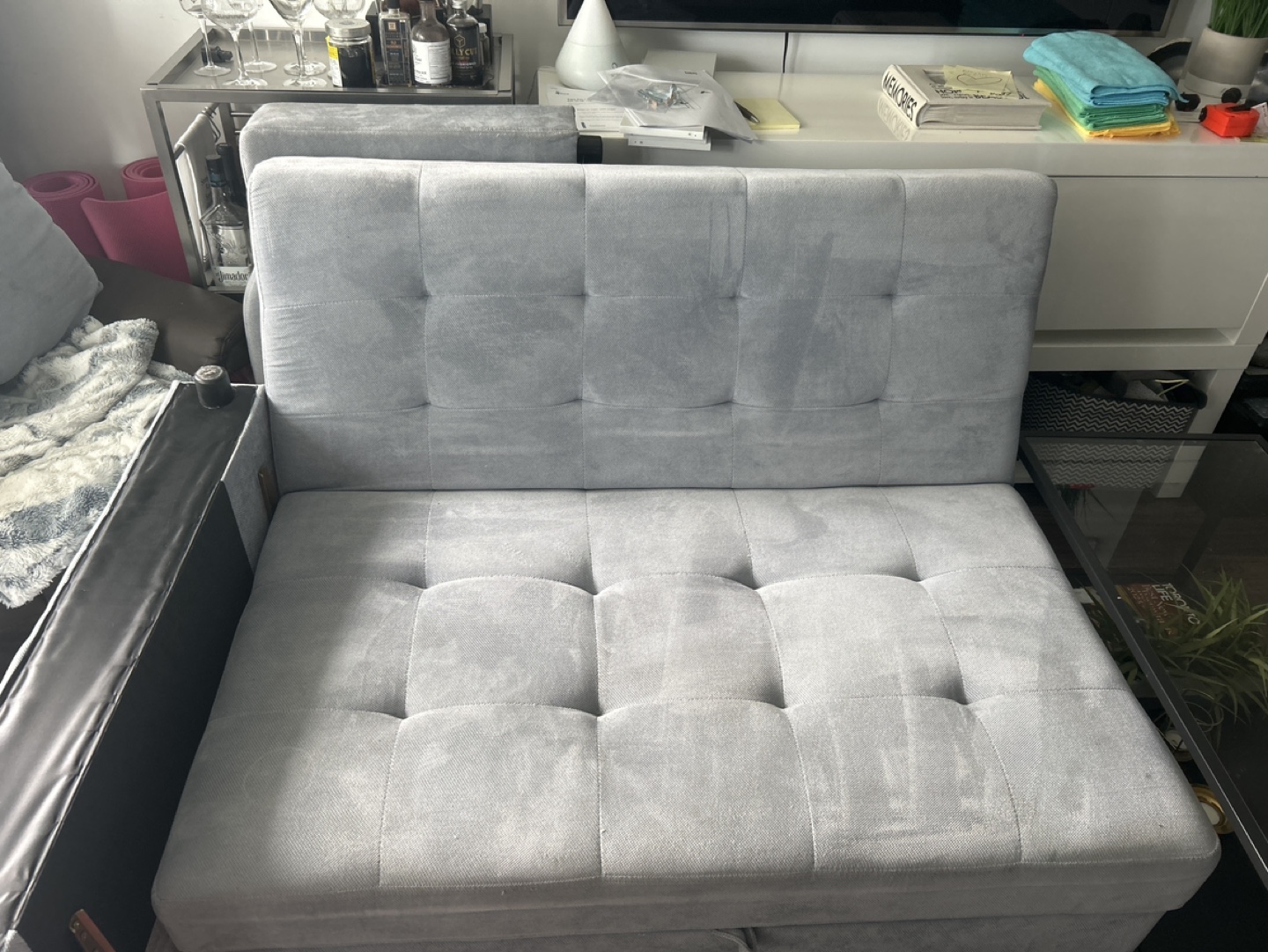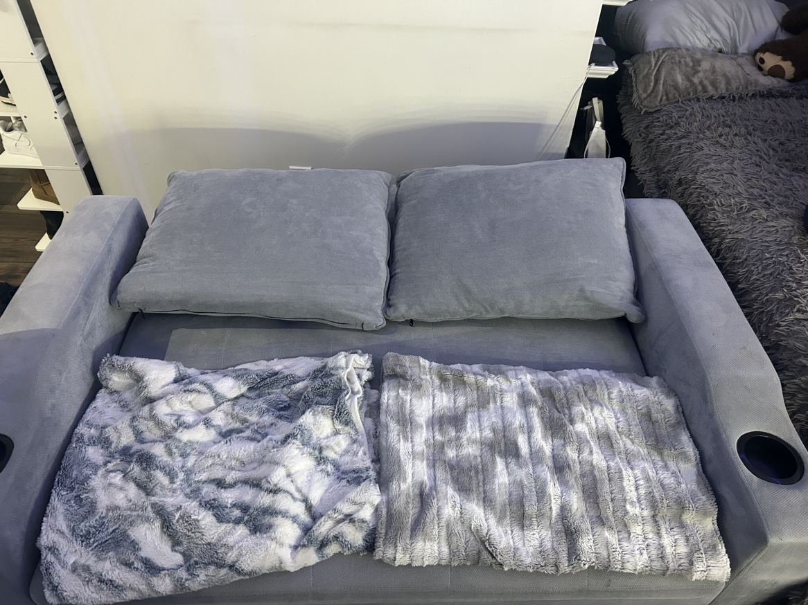 33I bought this for sale for 500 but going price was 1000. It has a stain on it that i’m working on getting out and hopefully will. Price is negotiable. Stain can be covered with a cute blanket like I did in the photo. Has pocket at the back that can be for storage with small items. It can pull out as just a foot rest or fully down into a bed. Can fit 2 ppl sleeping and is great for guests!