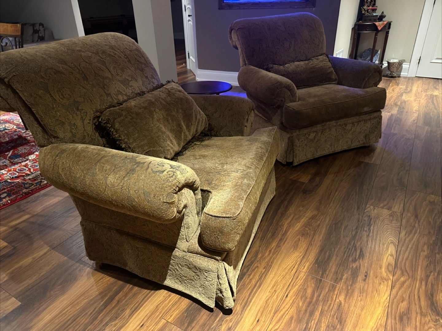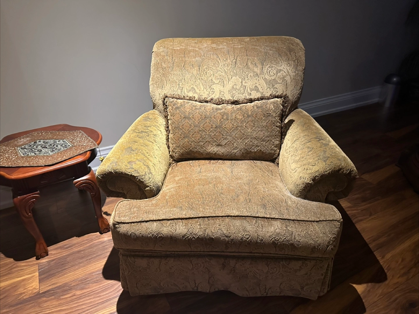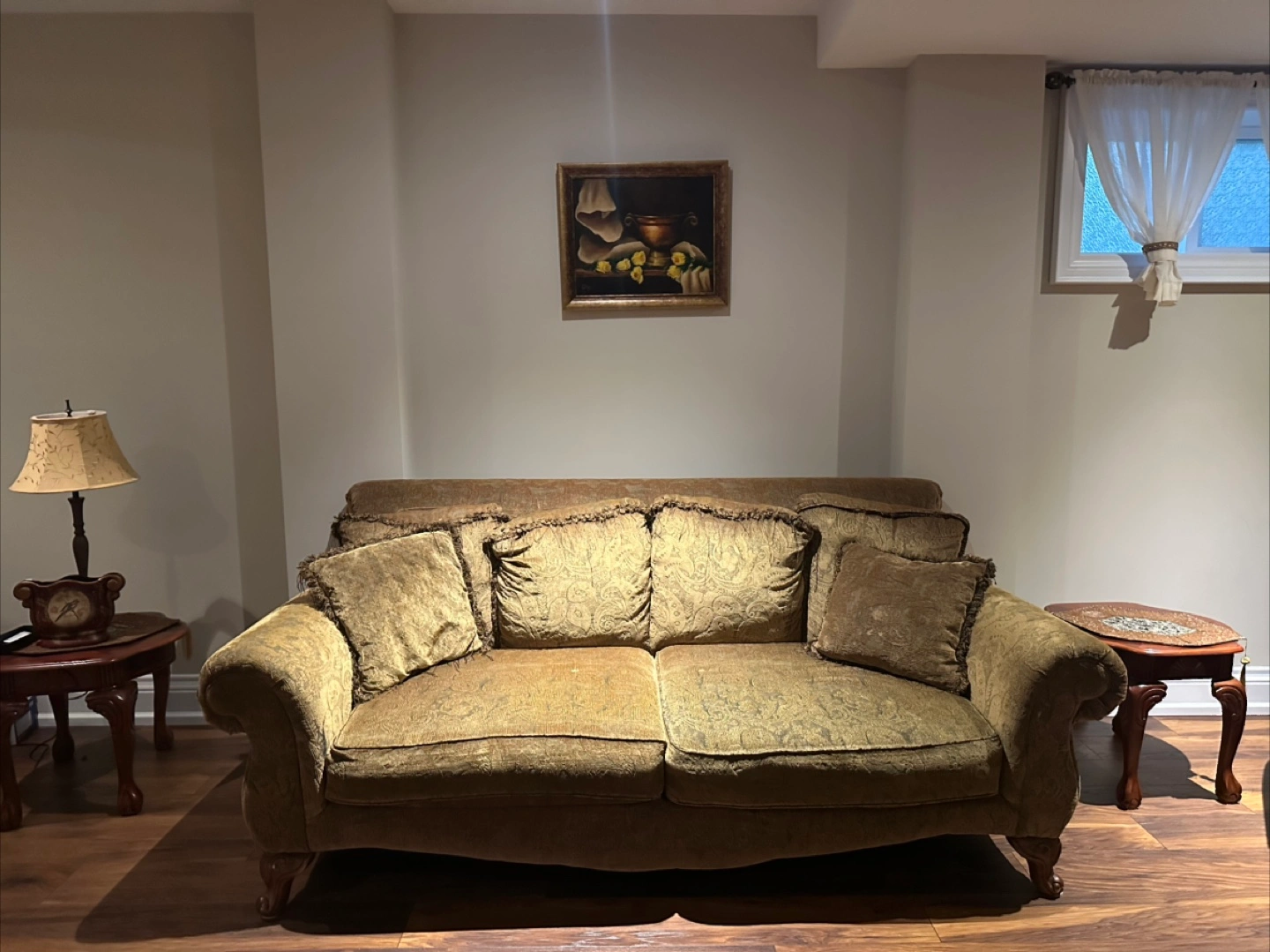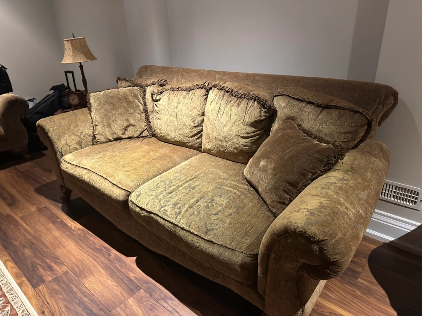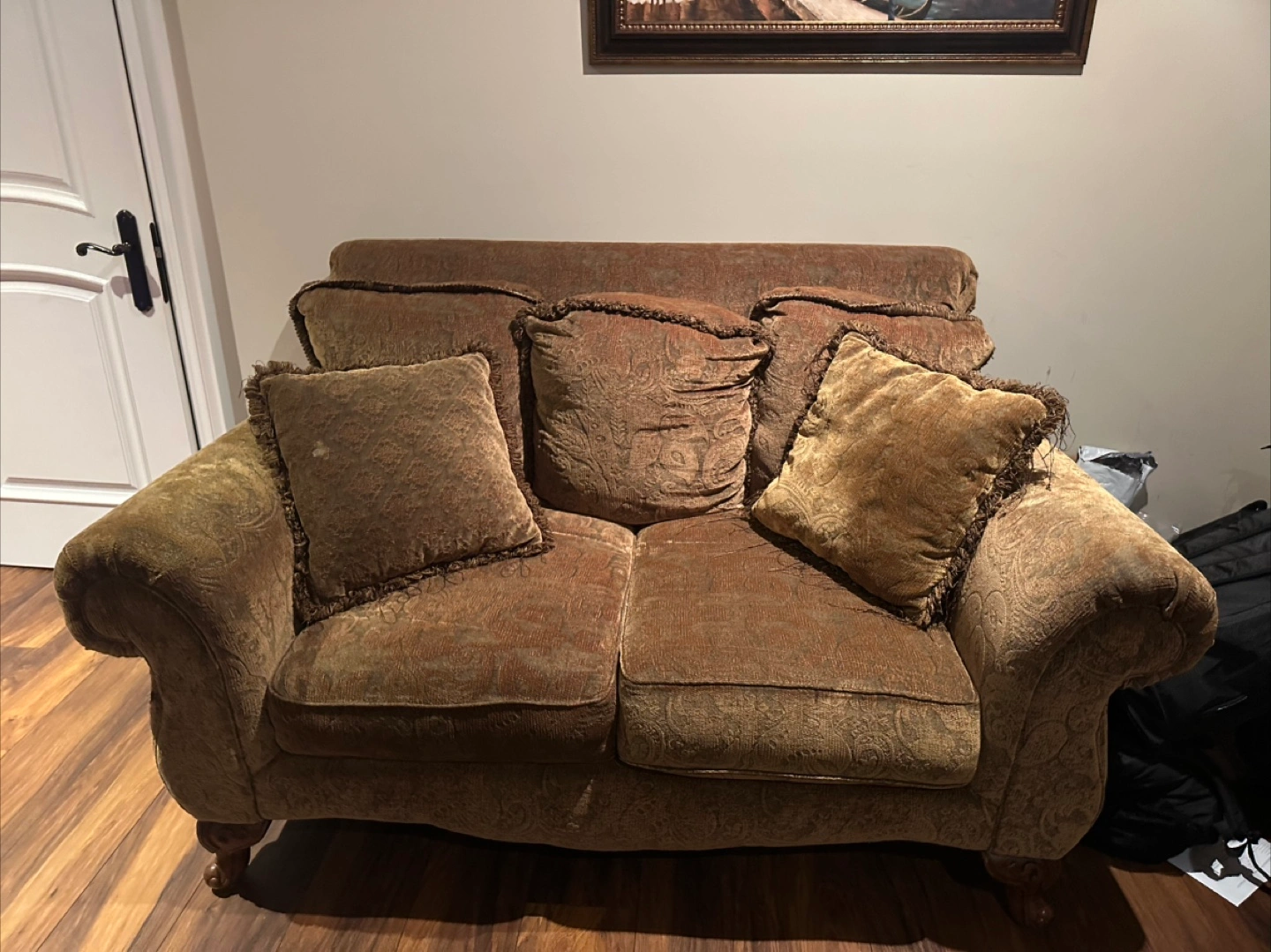 Comfy and antique loveseat, 3 seater sofa and matching 3 armchairs set available (5 total items) includes accent pillows! They're in good condition and would be a great addition to any living room or family room. Set can be sold separately upon request.