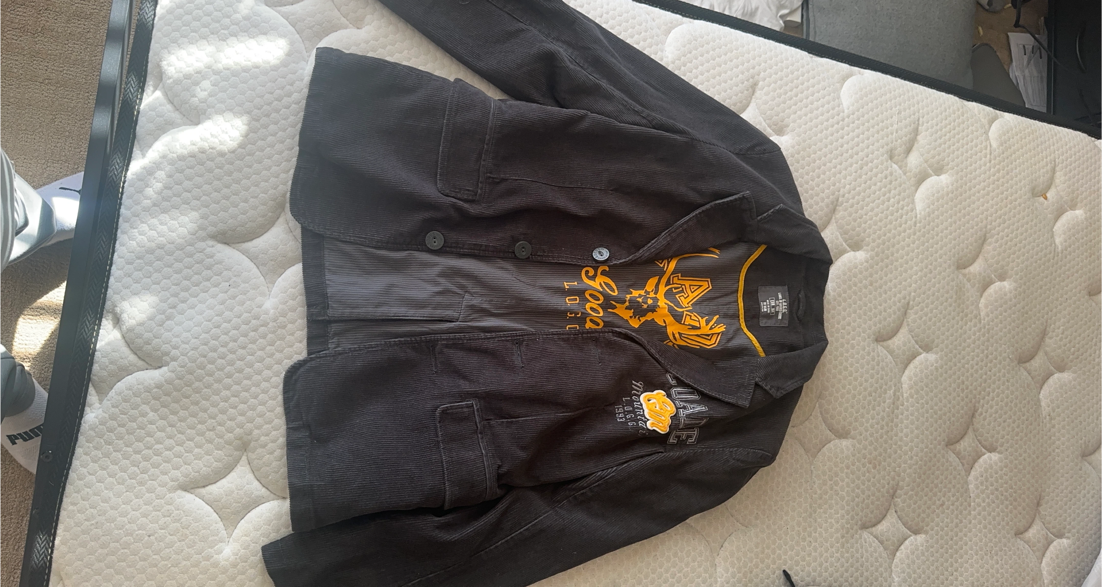 Selling a Lucc corduroy jacket. It's a stylish black colour and size EUR 48. The jacket features unique logo detailing on the front and inside lining. Perfect for adding a touch of flair to your wardrobe!