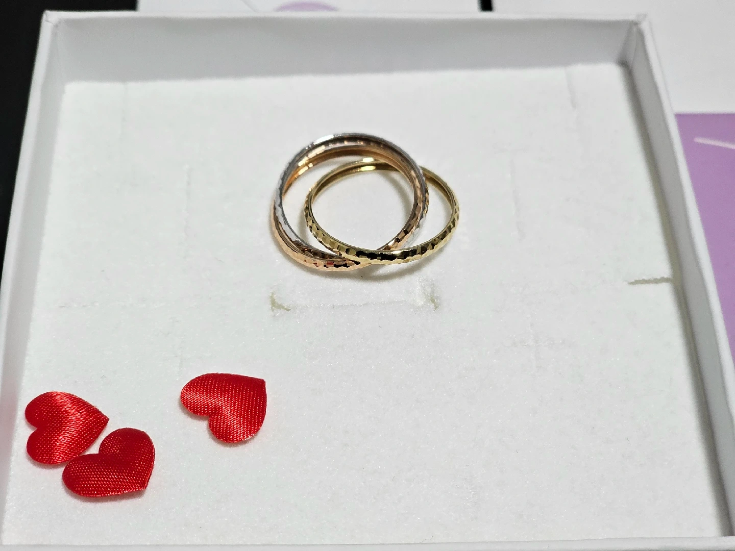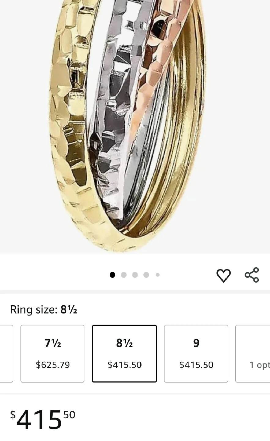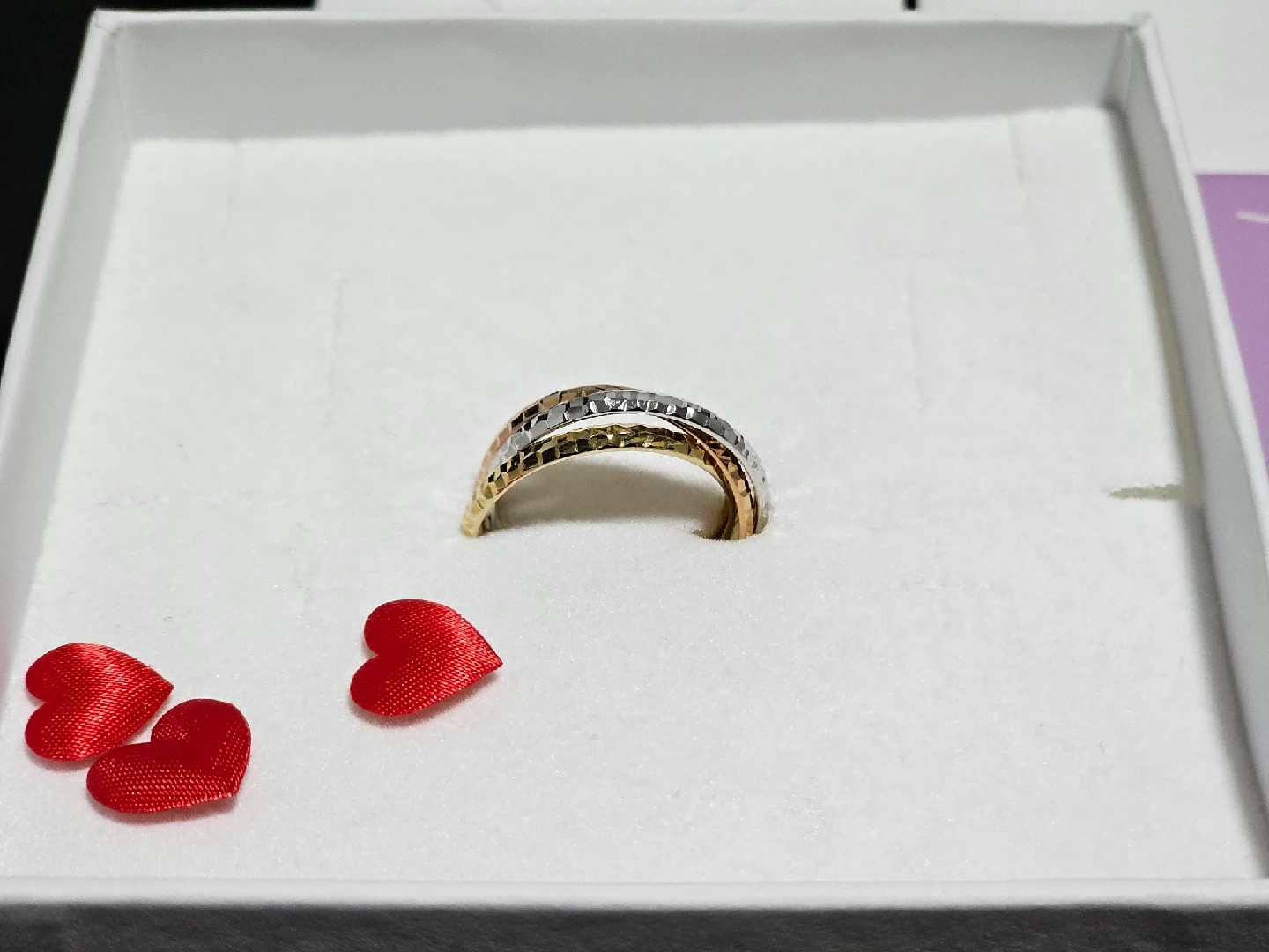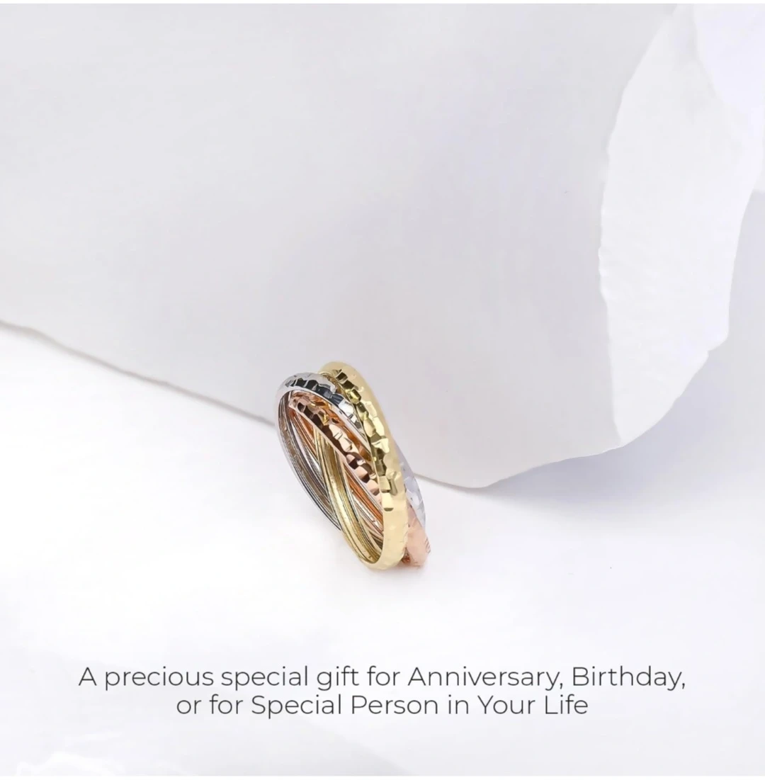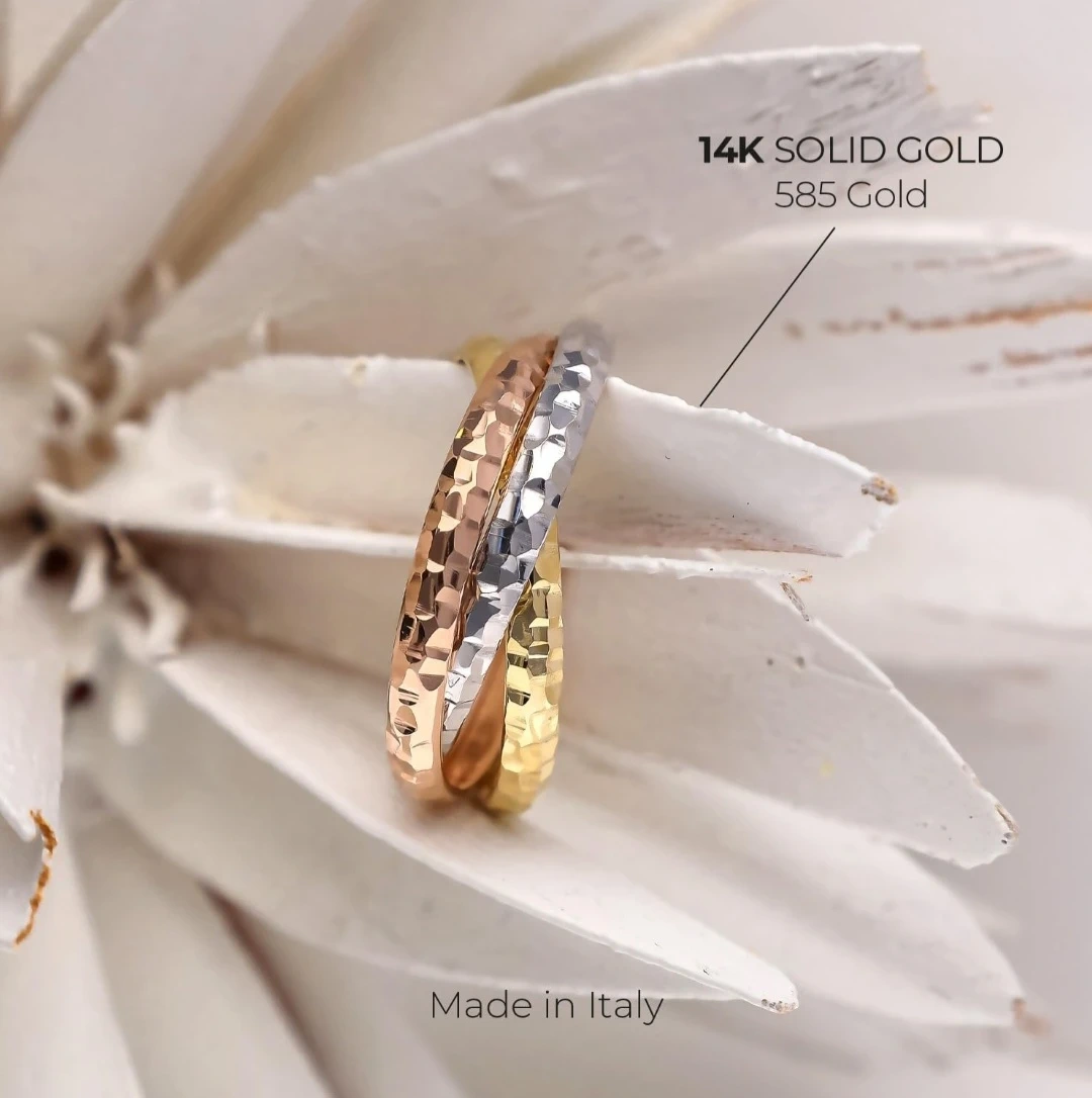 118Ring size: 8½ Material: Gold Metal type: Tri-color-gold Country of originItaly: Italy About this item | Italian Style | : this Look@585 Collection item is expression of Italian elegance and design. It's dedicated to the woman who loves a unique and intimate 14 karat gold jewel | 14k Pure Gold | : the precious metal authenticity is guaranteed by the goldsmith hallmark. The goldmark 14k Italy is stamped on its surface. NO gold plated. NO gold-filled. It's all Real Fine Gold. | Authentic Italian Jewelry | : these are certified Italian gold earrings. We produce wholly every piece of jewelry in our factory located in Vicenza near Venice. Unique item made by highly skilled craftsmen. You buy a jewel that is an expression of Italian excellence, luxury and premium quality | Technical Info | : the rings have a size of 8½, total metal weight 2.80 gr. | To make Shine | : the ideal gift to make people smile and excite, unveiled and appreciated in one of the most important moments of the year such as a birthday, an anniversary, Valentine's Day, Mother's Day or Christmas. | Look @ me, that's For Me! | : as soon as you open the elegant and precious package and meet the jewel for the first time, you will never want to leave it!