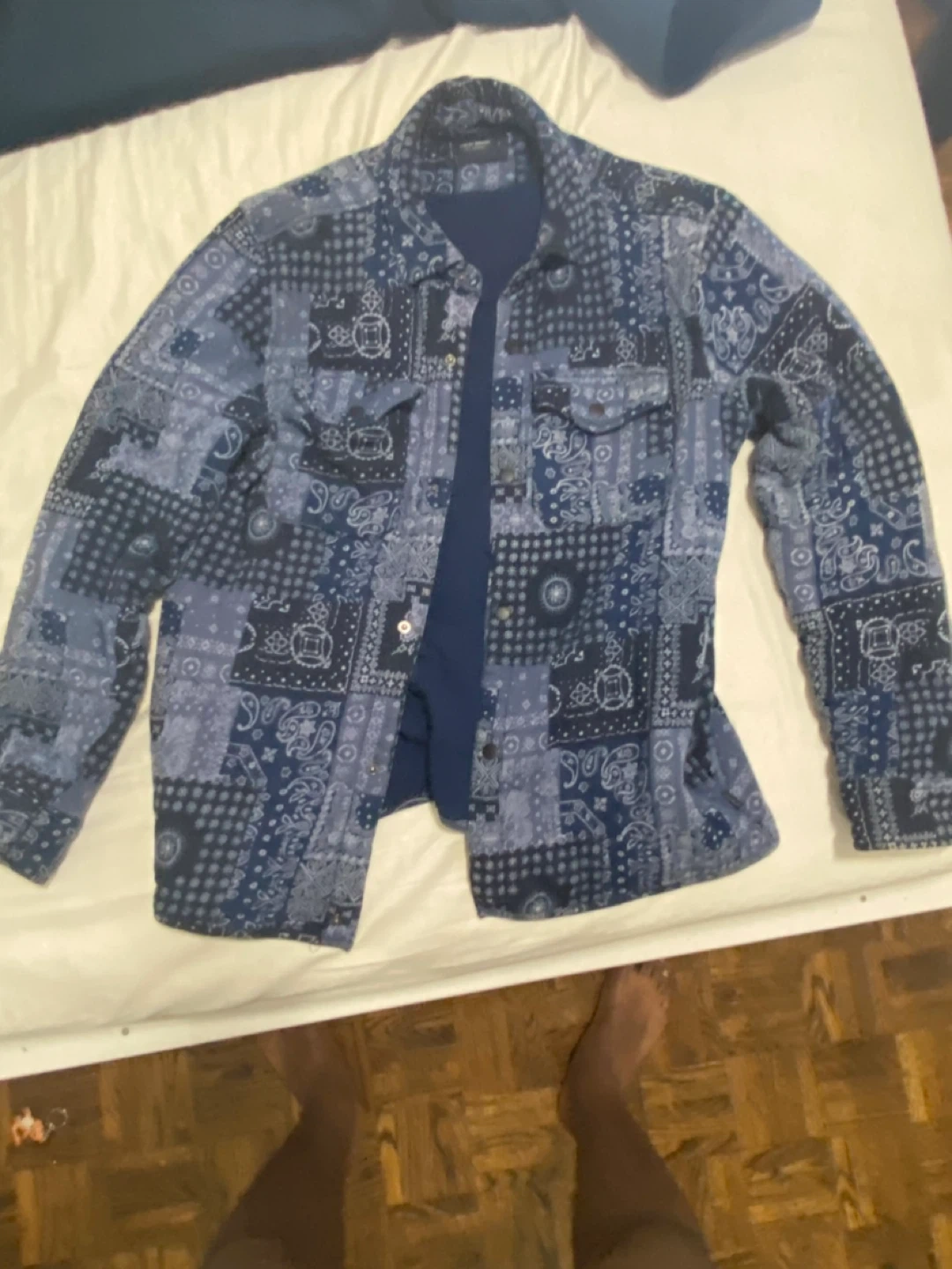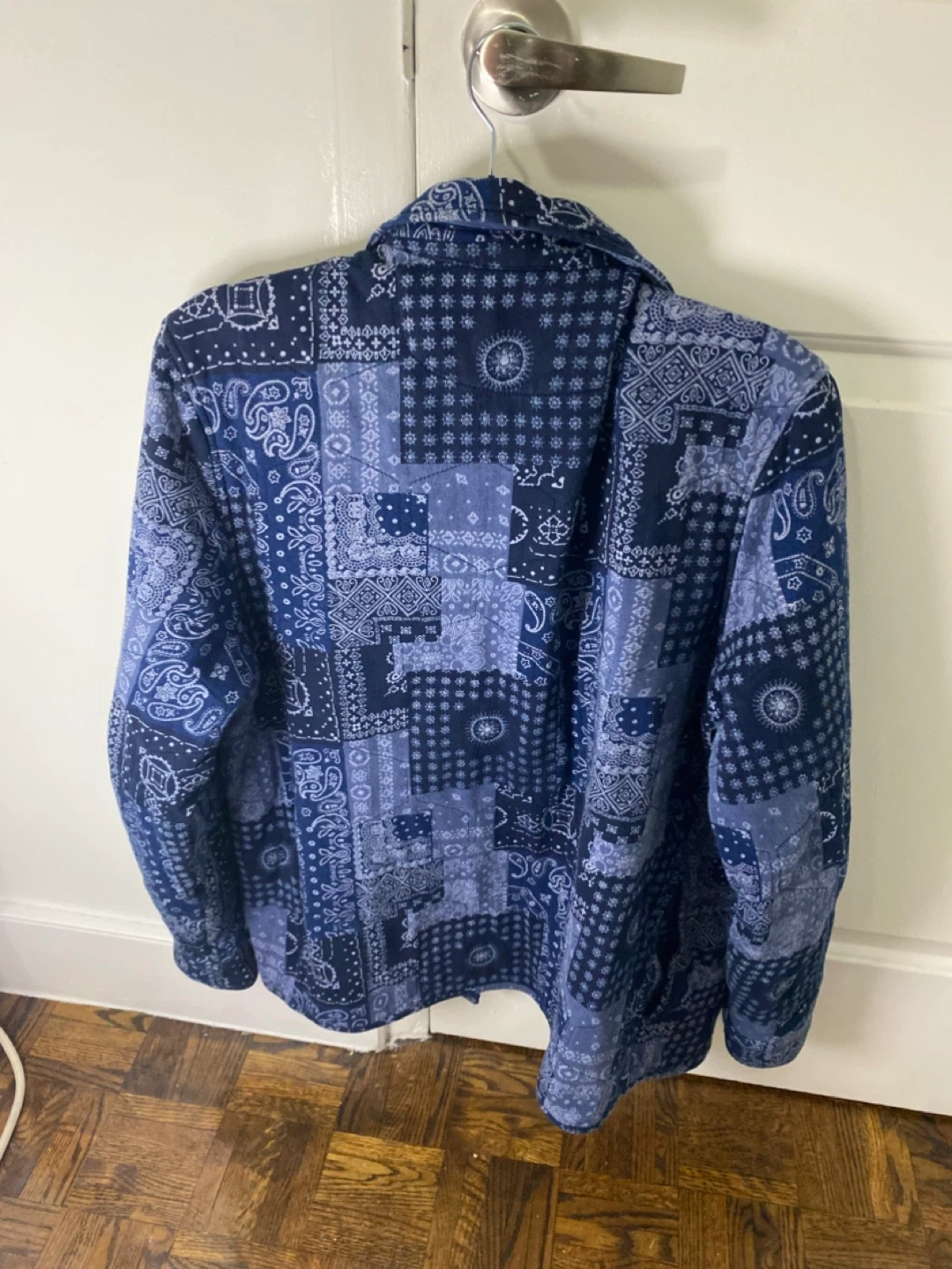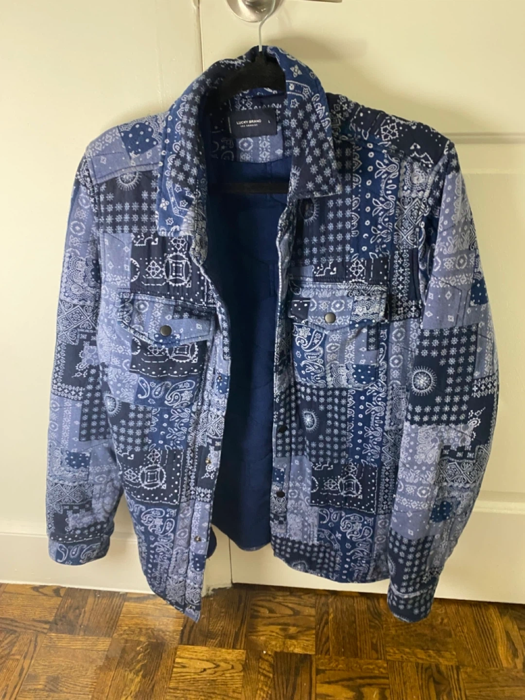 27Selling a Lucky Brand quilted shirt jacket in a stylish blue bandana pattern. It's in great shape and ready for a new home. Perfect for layering or wearing on its own!