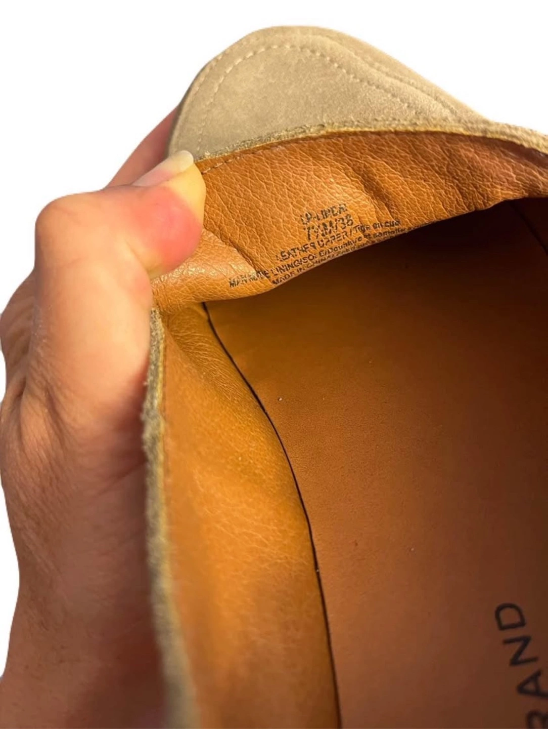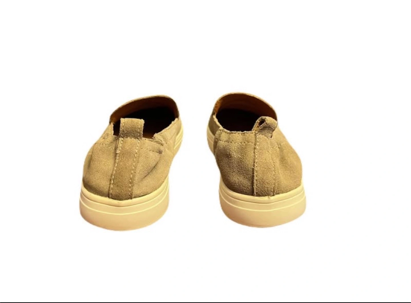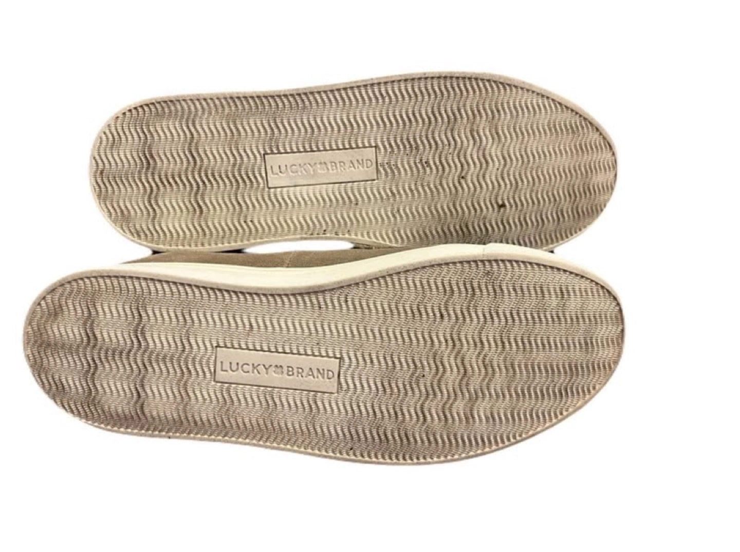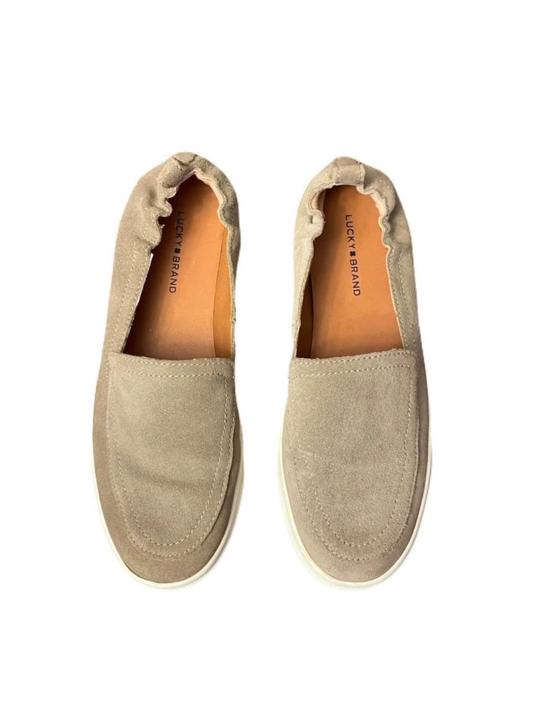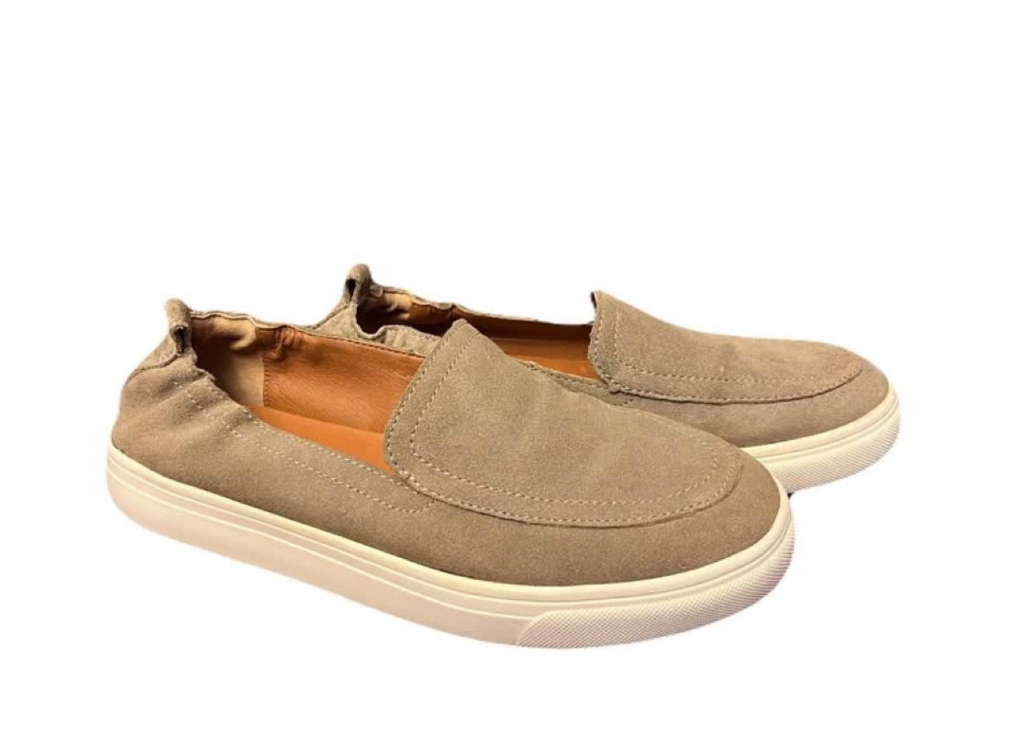 Excellent condition. Taupe/tan suede leather upper, and off-white rubber sole. Cushioned padded footbed. Rounded toe. Heel pull tab. Pickup in Oshawa - Harmony/Rossland area