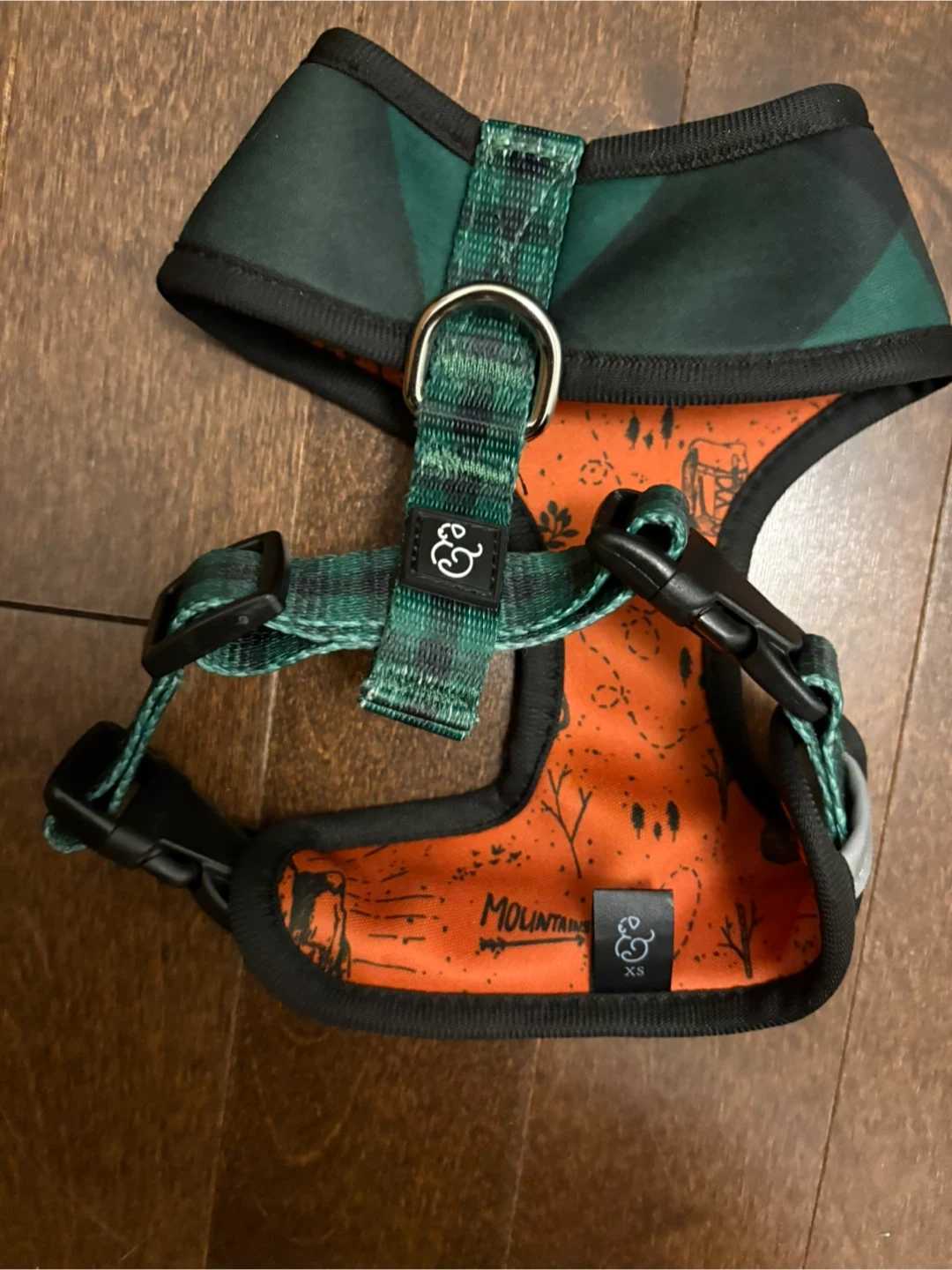 Selling a Lucy & Co. dog harness in size XS! It features a green and black plaid pattern on one side and an orange pattern with trees and mountains on the other side