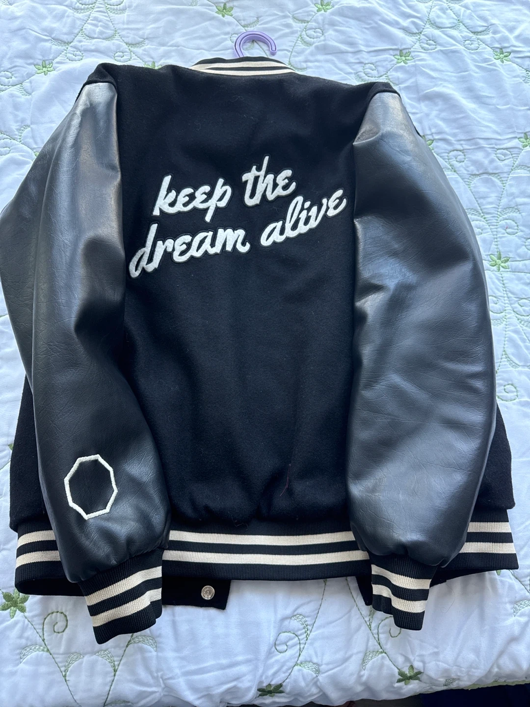 Selling a Lugz varsity jacket in great condition! It's black with leather-look sleeves and an orange quilted lining. The back has the words 'keep the dream alive' embroidered on it. Perfect for adding some retro style to your wardrobe!