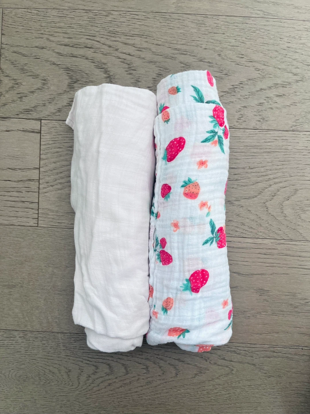 Two soft swaddle blankets for your little one! One is a solid light pink from Lulujo, made from 70% viscose from bamboo. The other is from Little Unicorn, 100% cotton featuring a cute strawberry print. Both are in great condition and ready for a new home