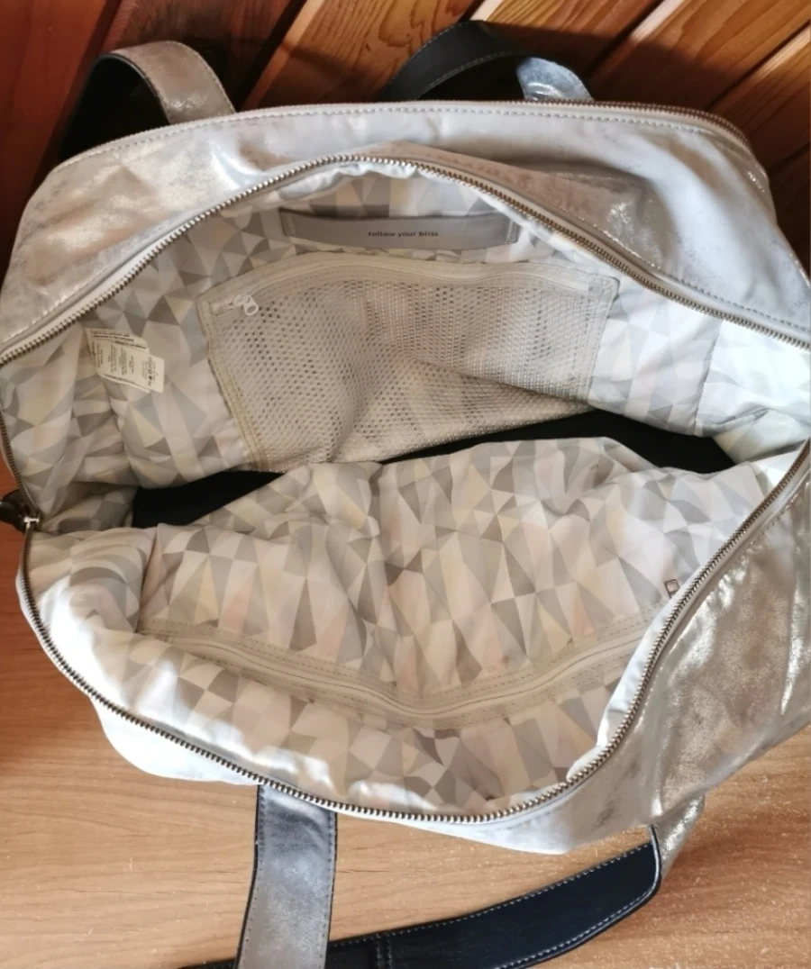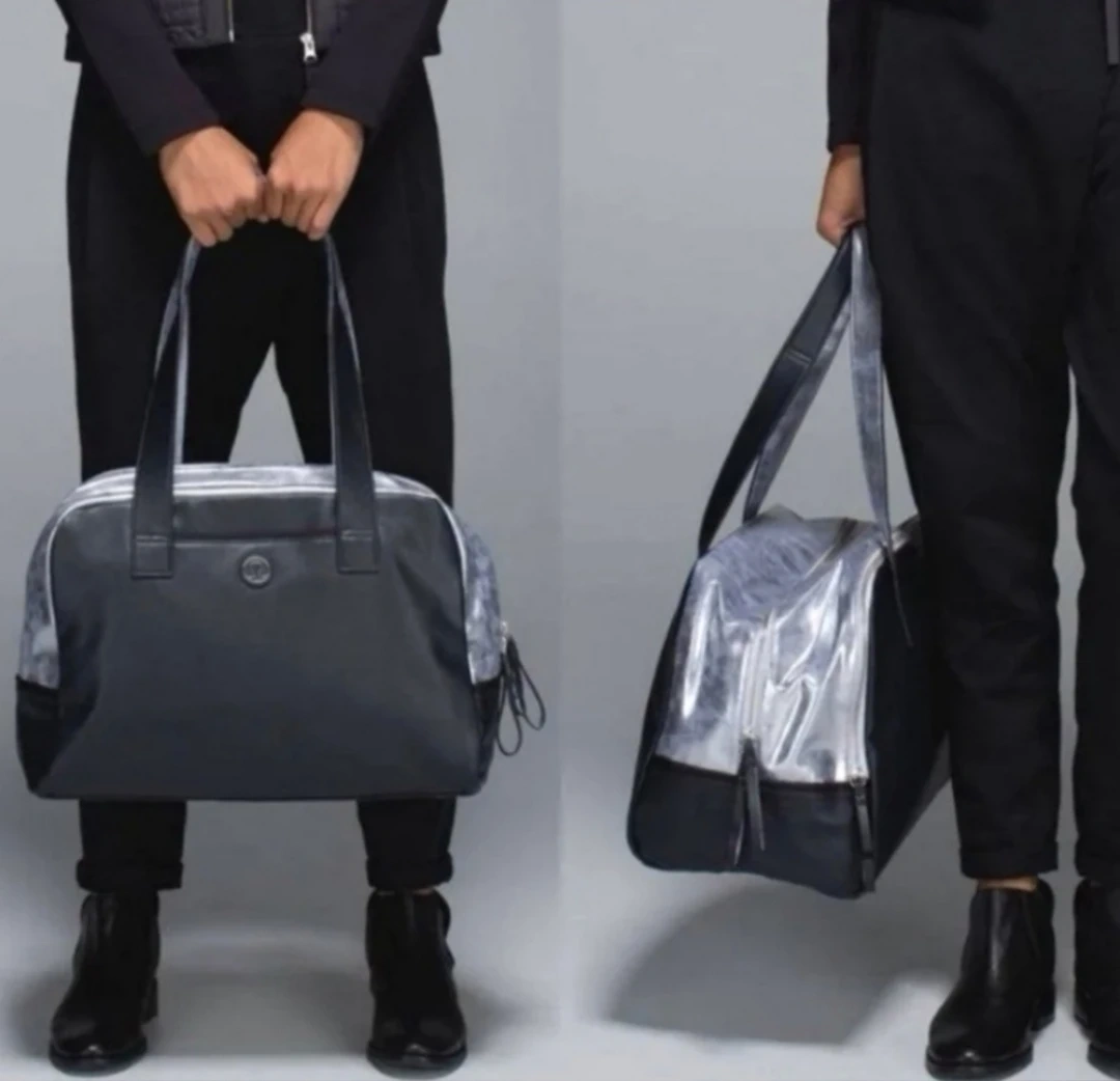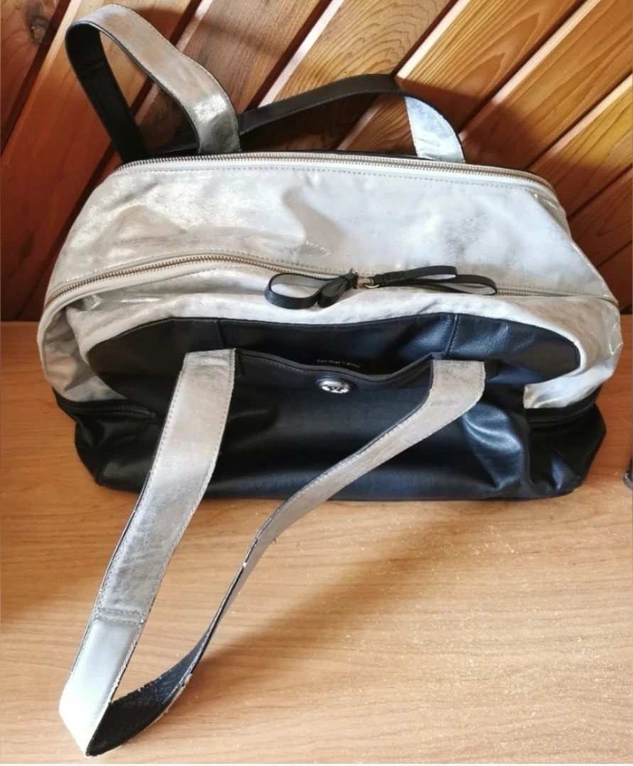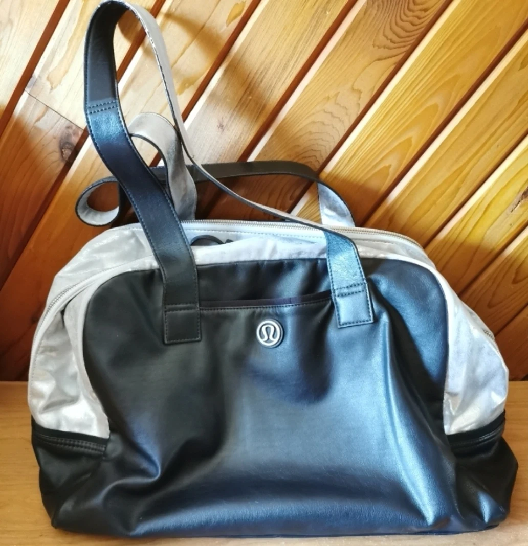 94Lululemon Black/Silver Bag Previously pre-owned but still in great condition, easy to clean, lots of storage, including laptop, tiny signs of wear on handles, reason price is reduced, see all the pictures Size about 18 inch long, 13 inch tall, no stains/dirt. Pick up downtown Calgary, parking available, cash only please