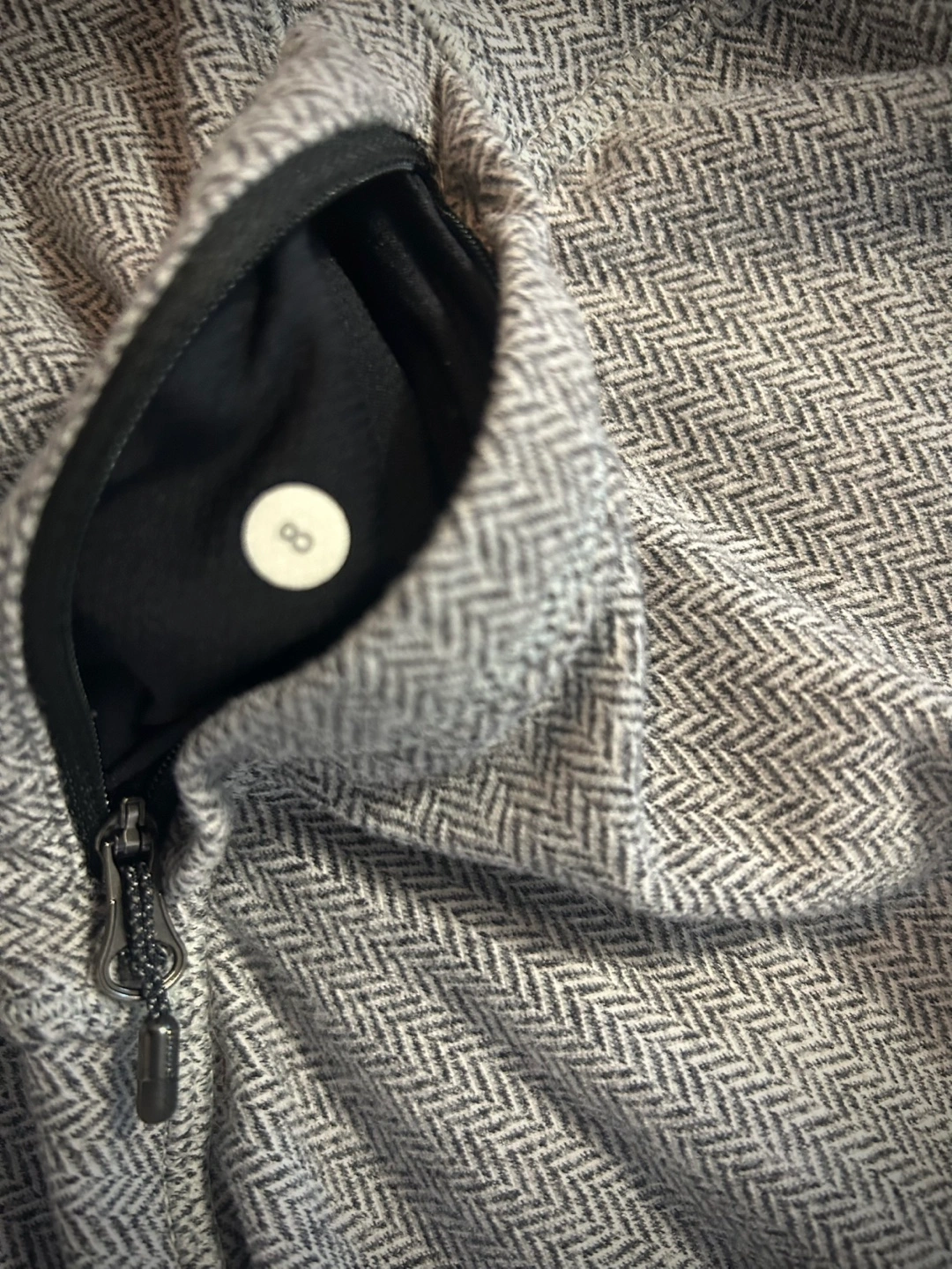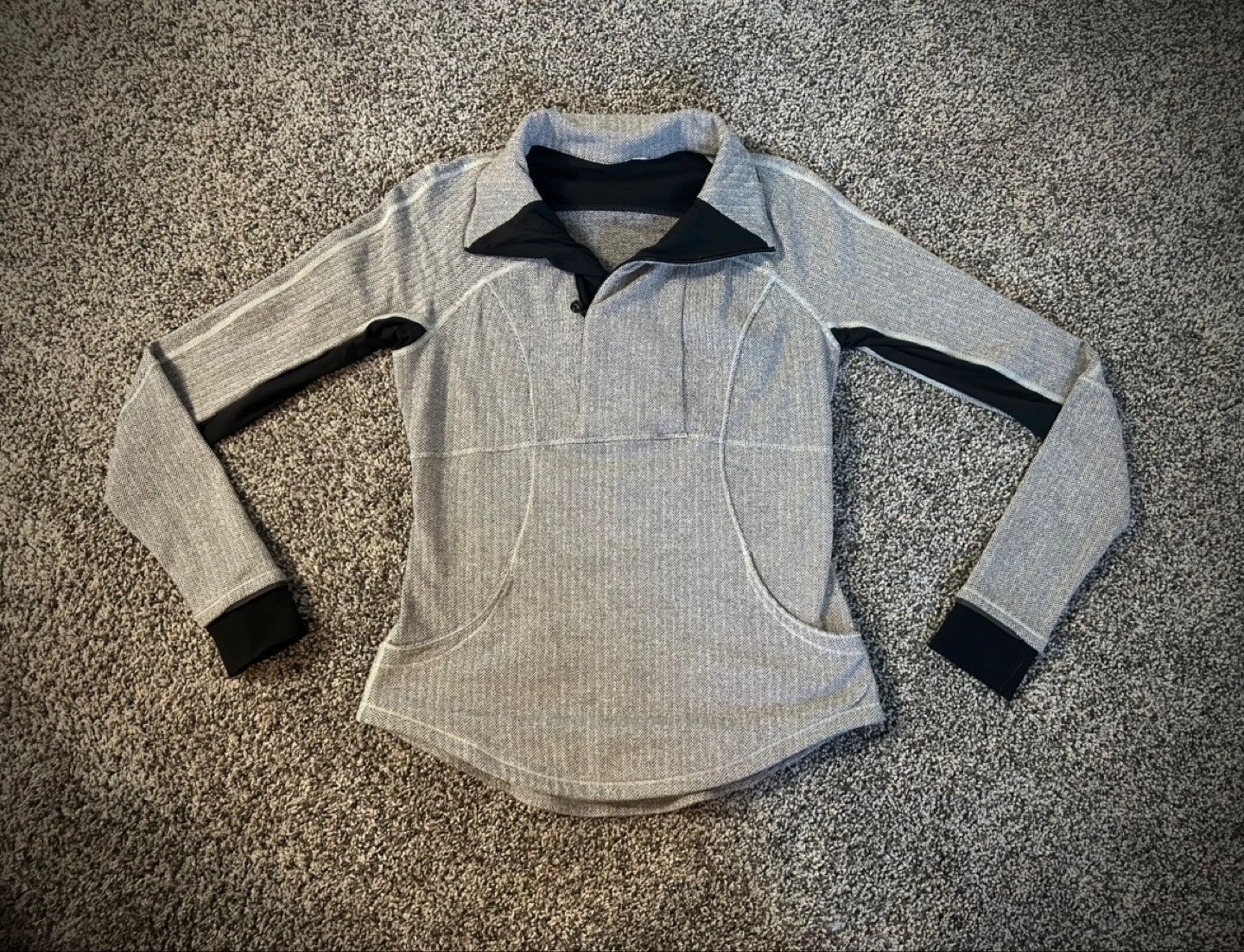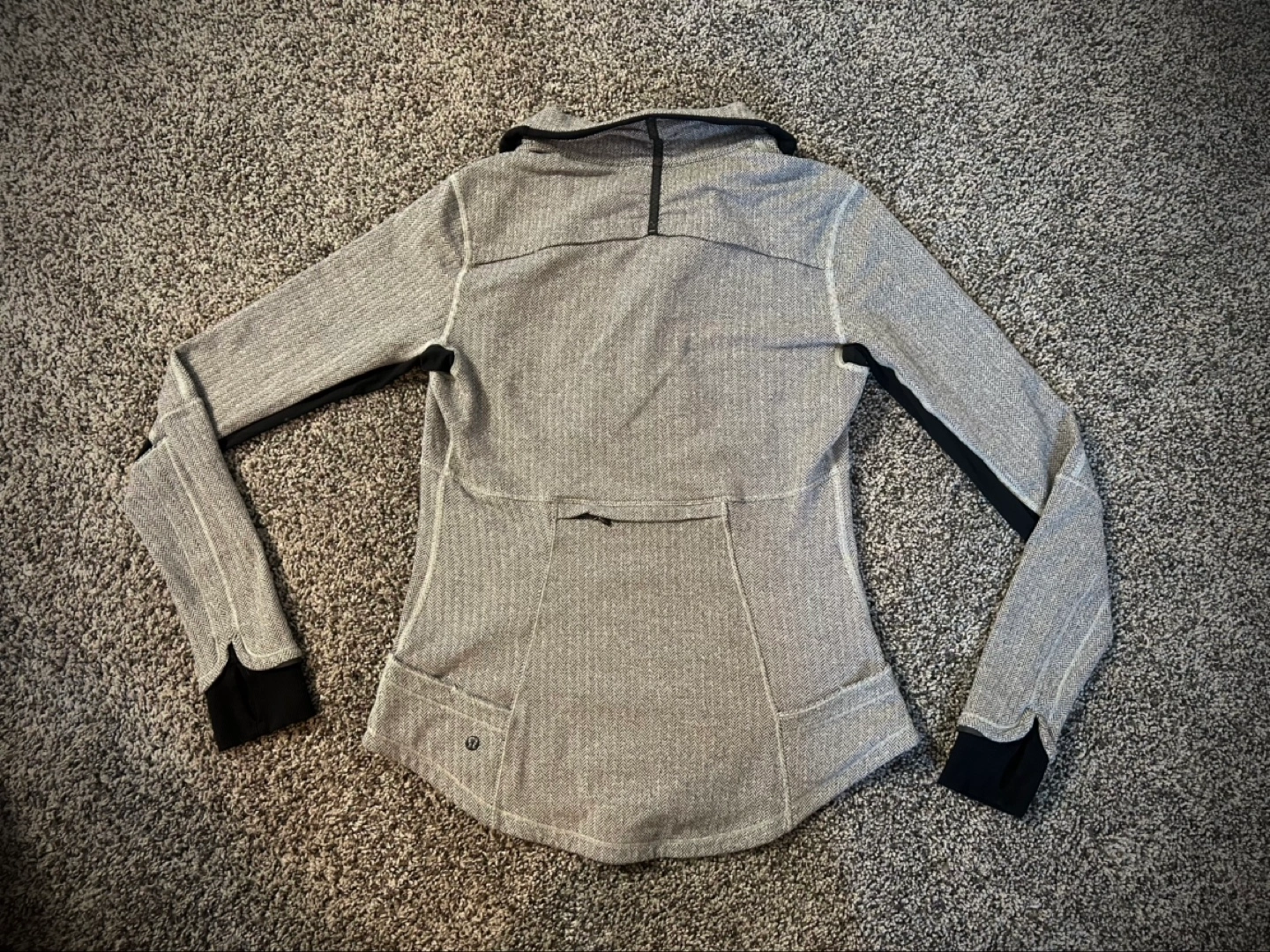 80Grey and black herringbone pattern. Long sleeves, half-zip closure. Small pockets. Great for layering. Zipper pocket on back. Rosemont