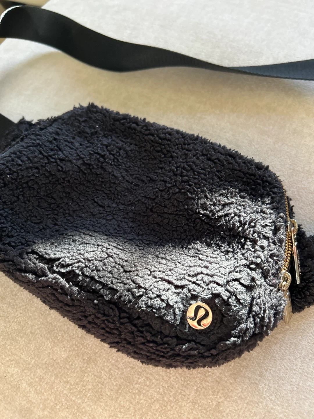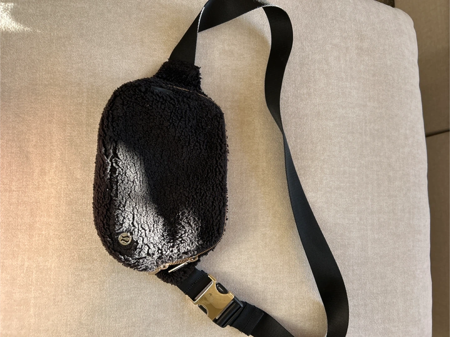 32Selling a Lululemon belt bag in black fleece material! It's in great condition and ready for a new home. Perfect for carrying your essentials with an adjustable strap while keeping your hands free.