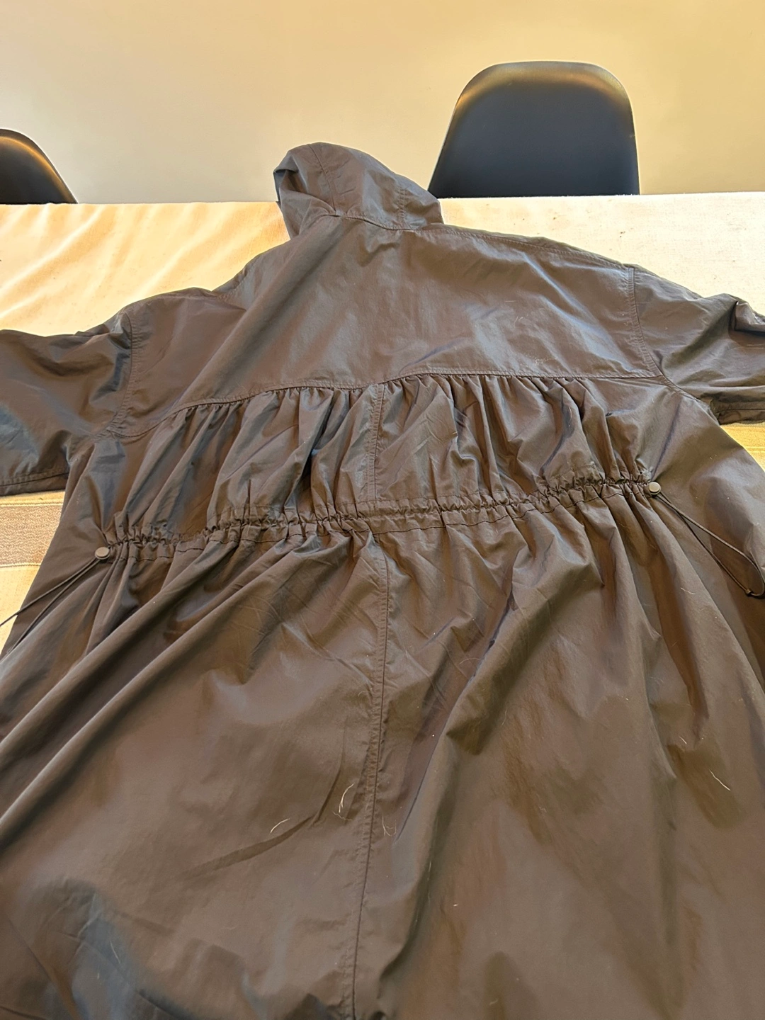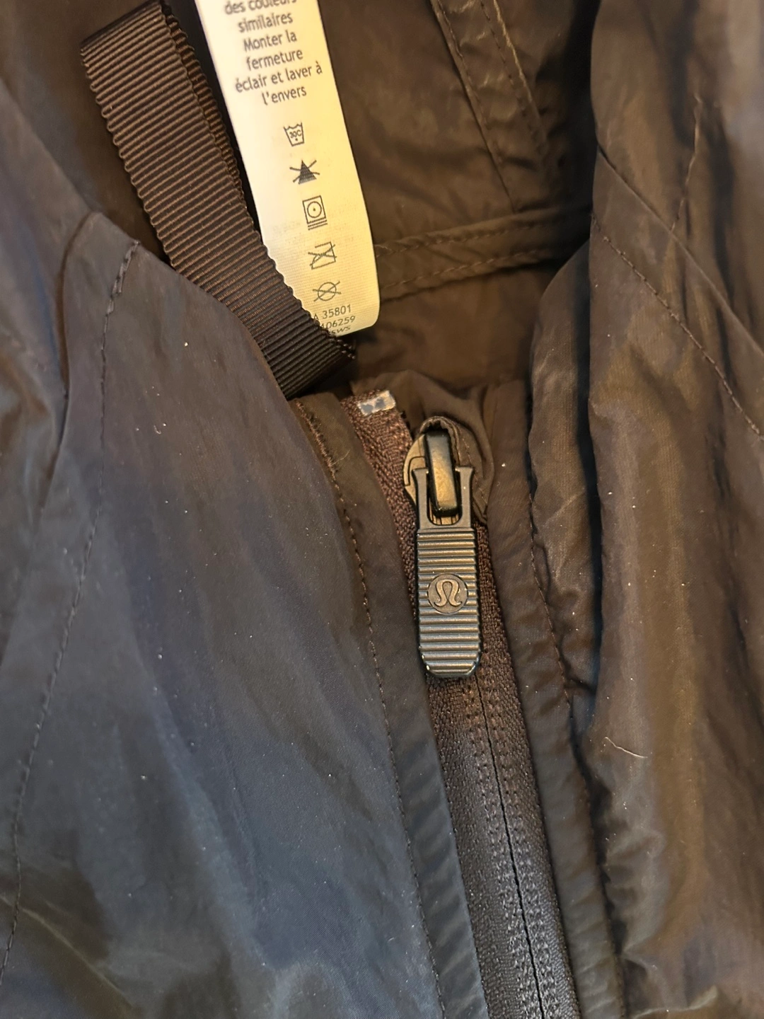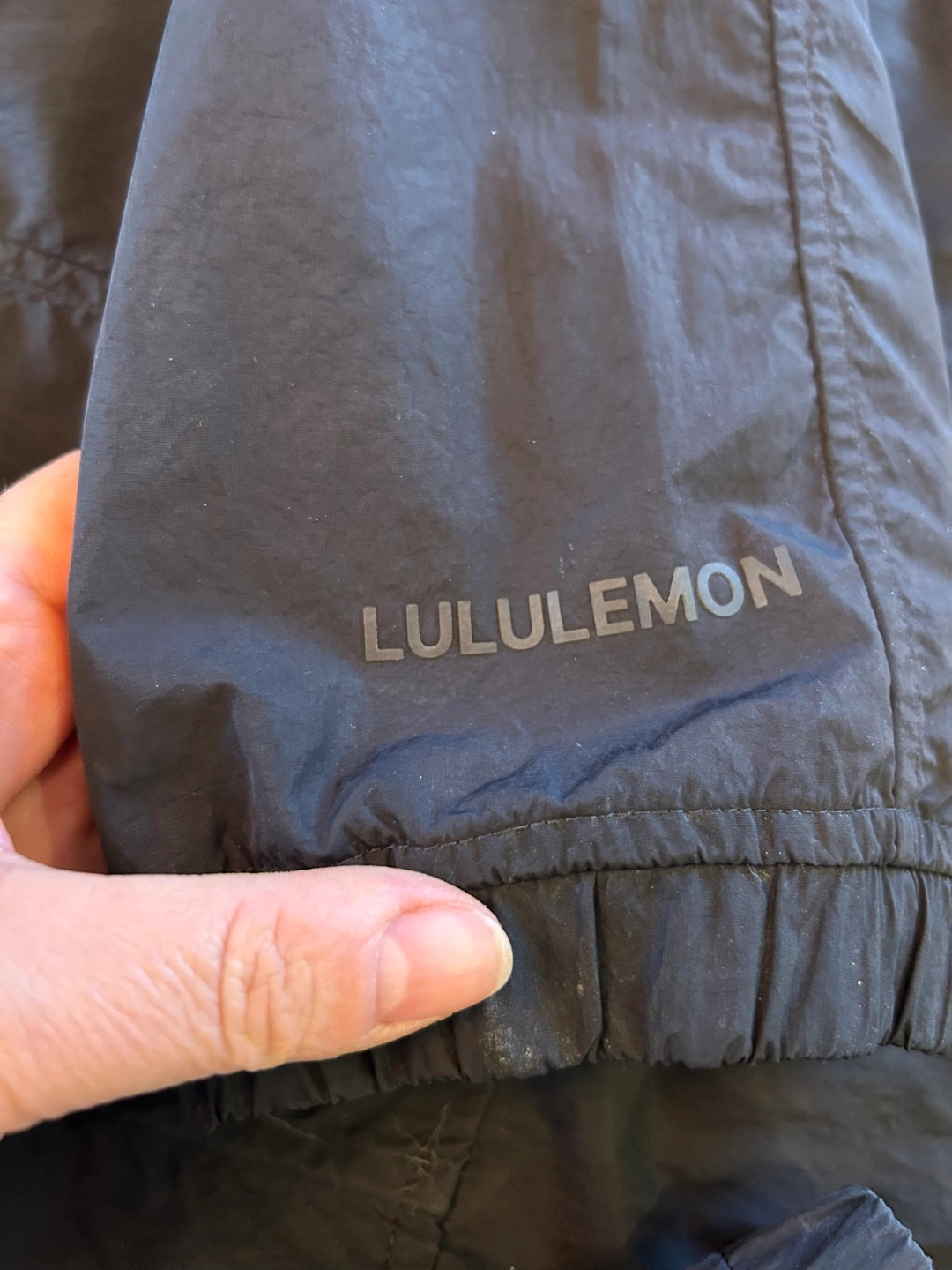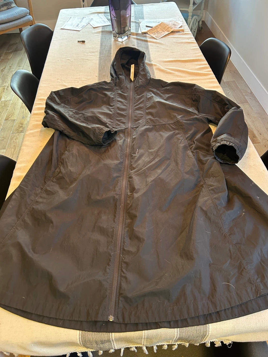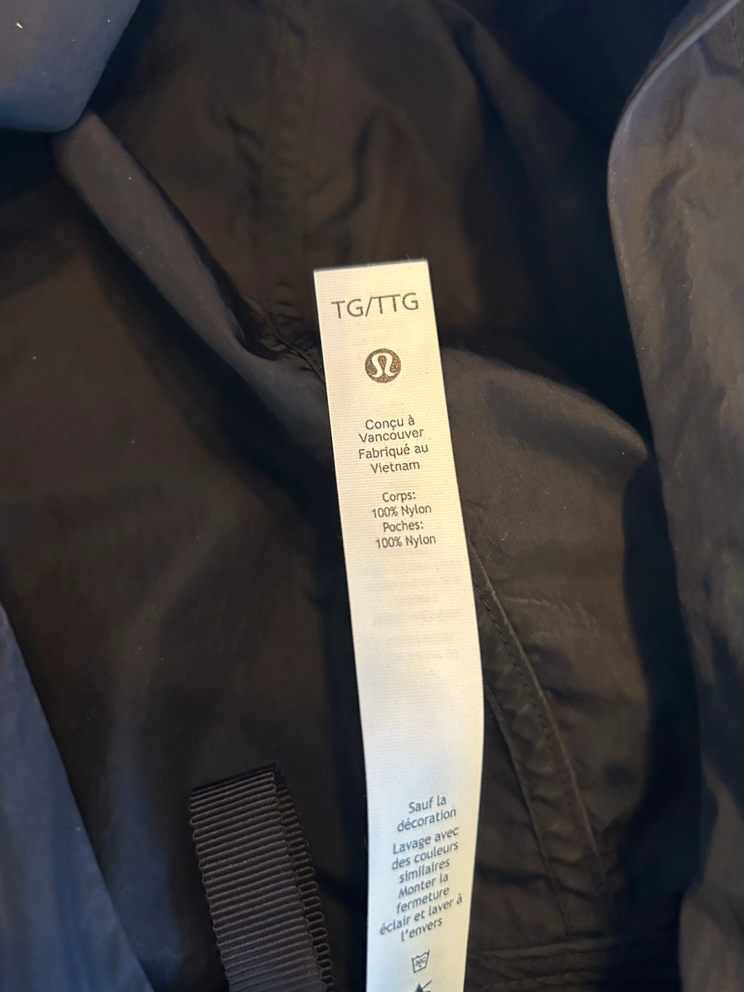 28Lululemon black hooded raincoat. Long length, cinched waist. 100% nylon. Size TG/TTG. Excellent condition. This is not insulated or waterproof. I will meet you at the Loblaws at Dundas street West and Scarlett Rd anytime after 6 PM or on the weekends.
