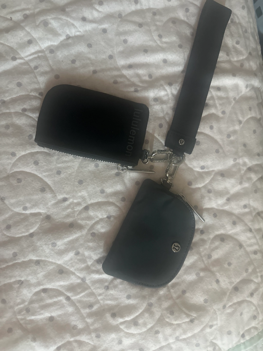 Black Lululemon key ring wallet. Includes a card holder and a small coin purse. Attaches to keys with a removable strap.