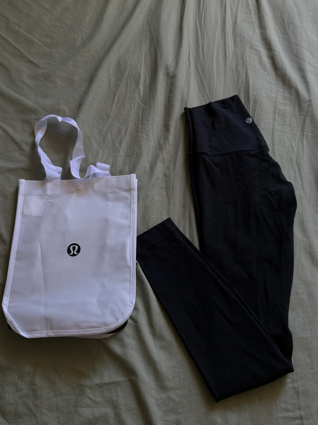 Black Lululemon leggings. High-waisted, form-fitting. Pair with a matching white Lululemon tote bag. Perfect for the gym or everyday wear.