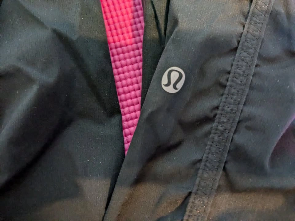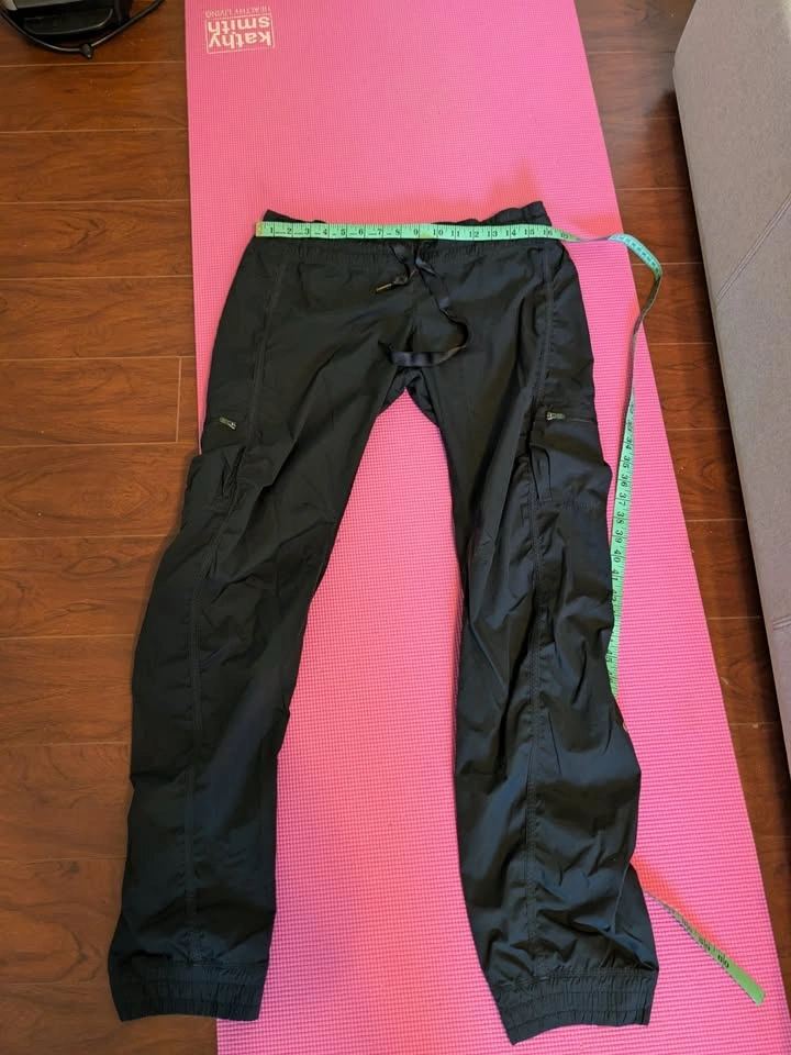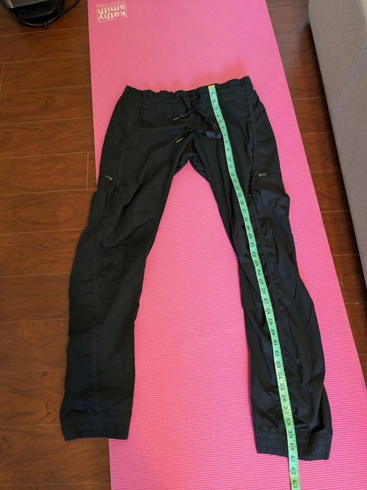 Lululemon black training pants. Drawstring waist. Side pockets. Elastic cuffs. Excellent for working out. Forgot the size, but the waist is elasticated and can be fit in sizes 4 to 8