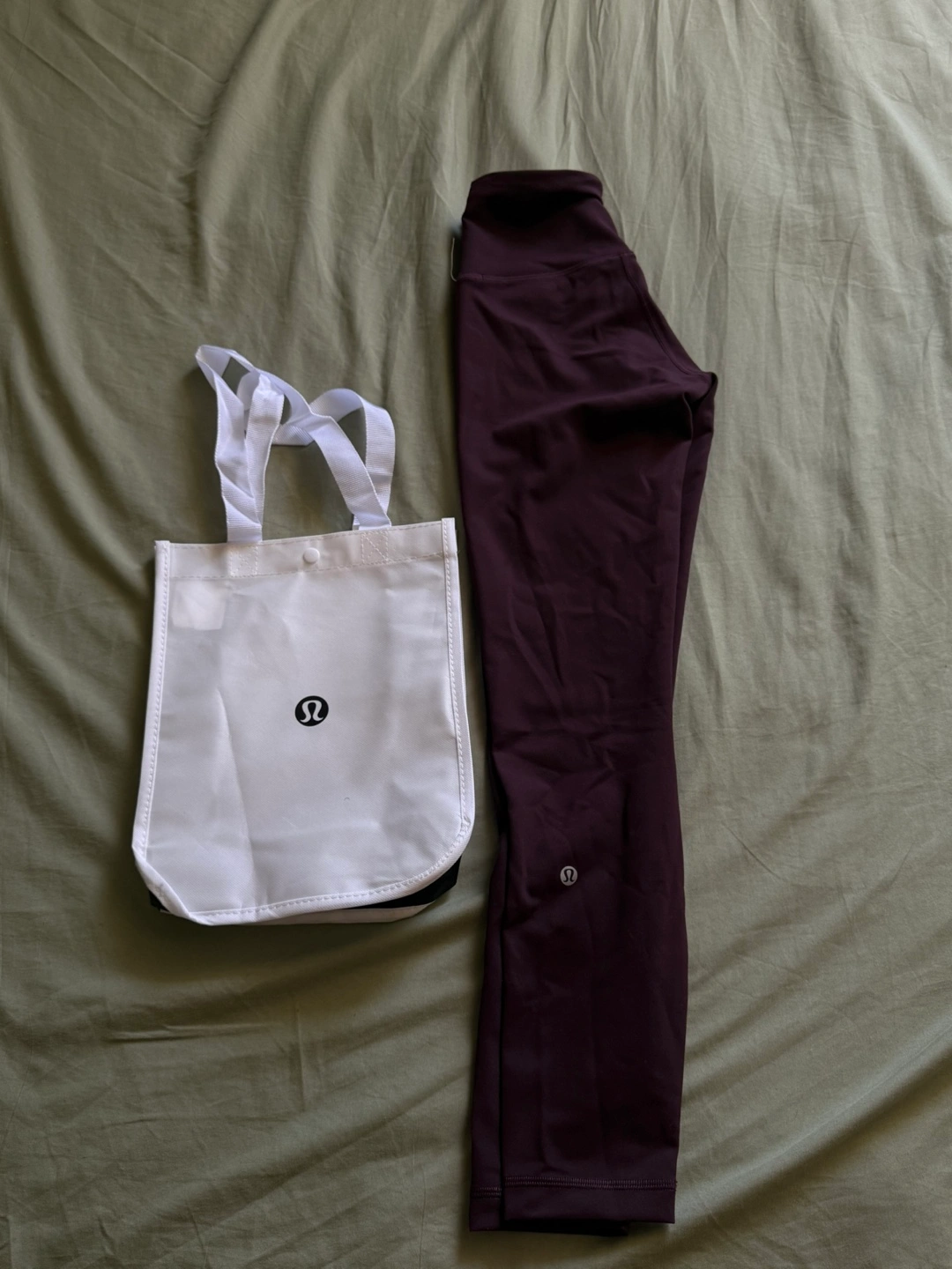 Burgundy Lululemon leggings. 7/8 length. Comes with a white Lululemon tote bag.