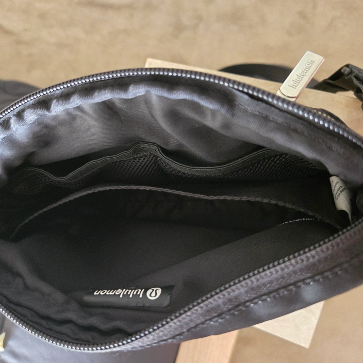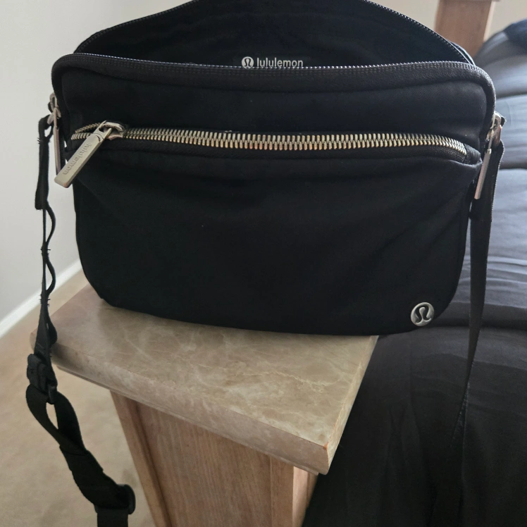 black Lululemon crossbody bag with adjustable strap lots of pockets inside and a zip pocket at the front