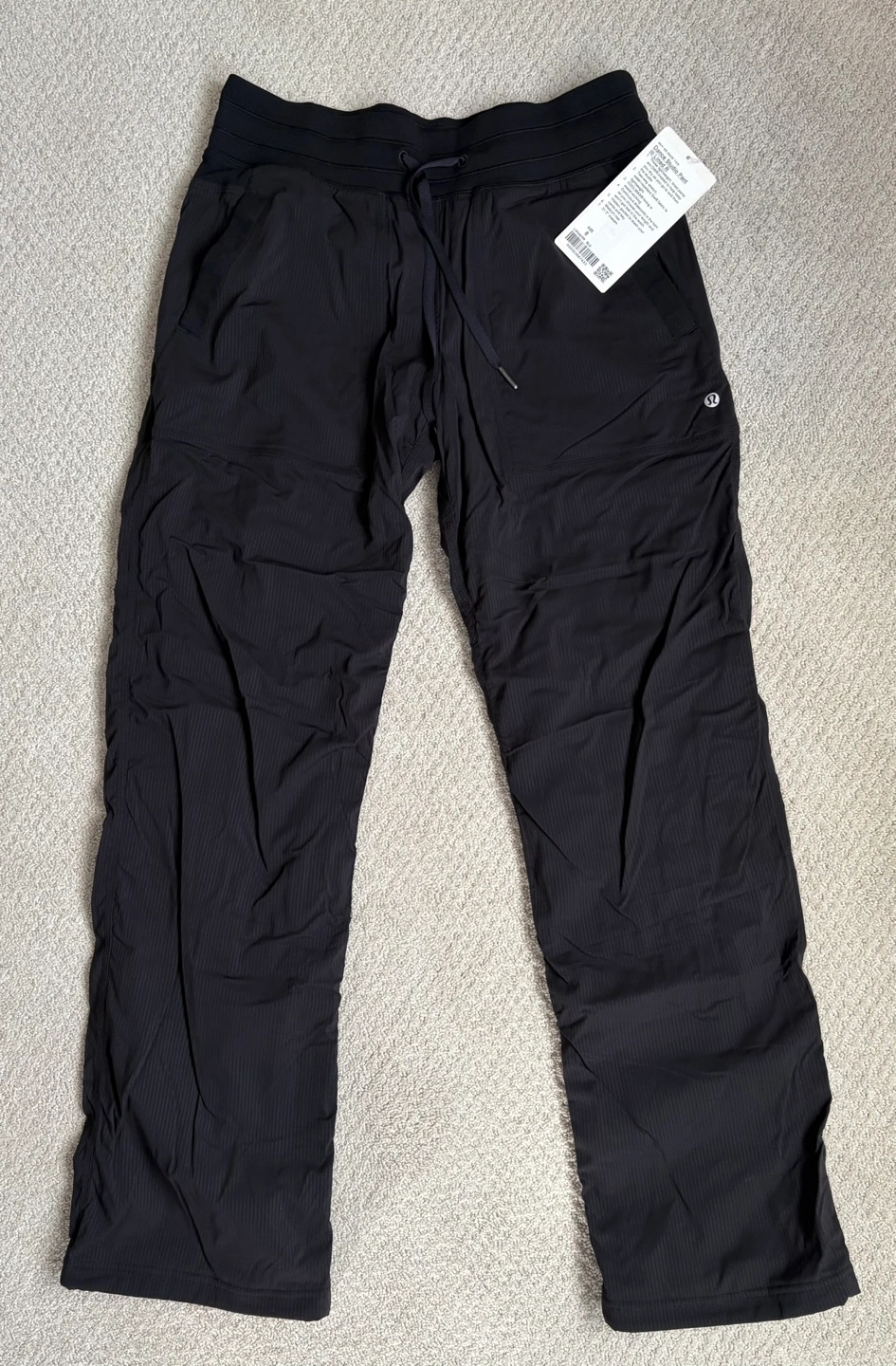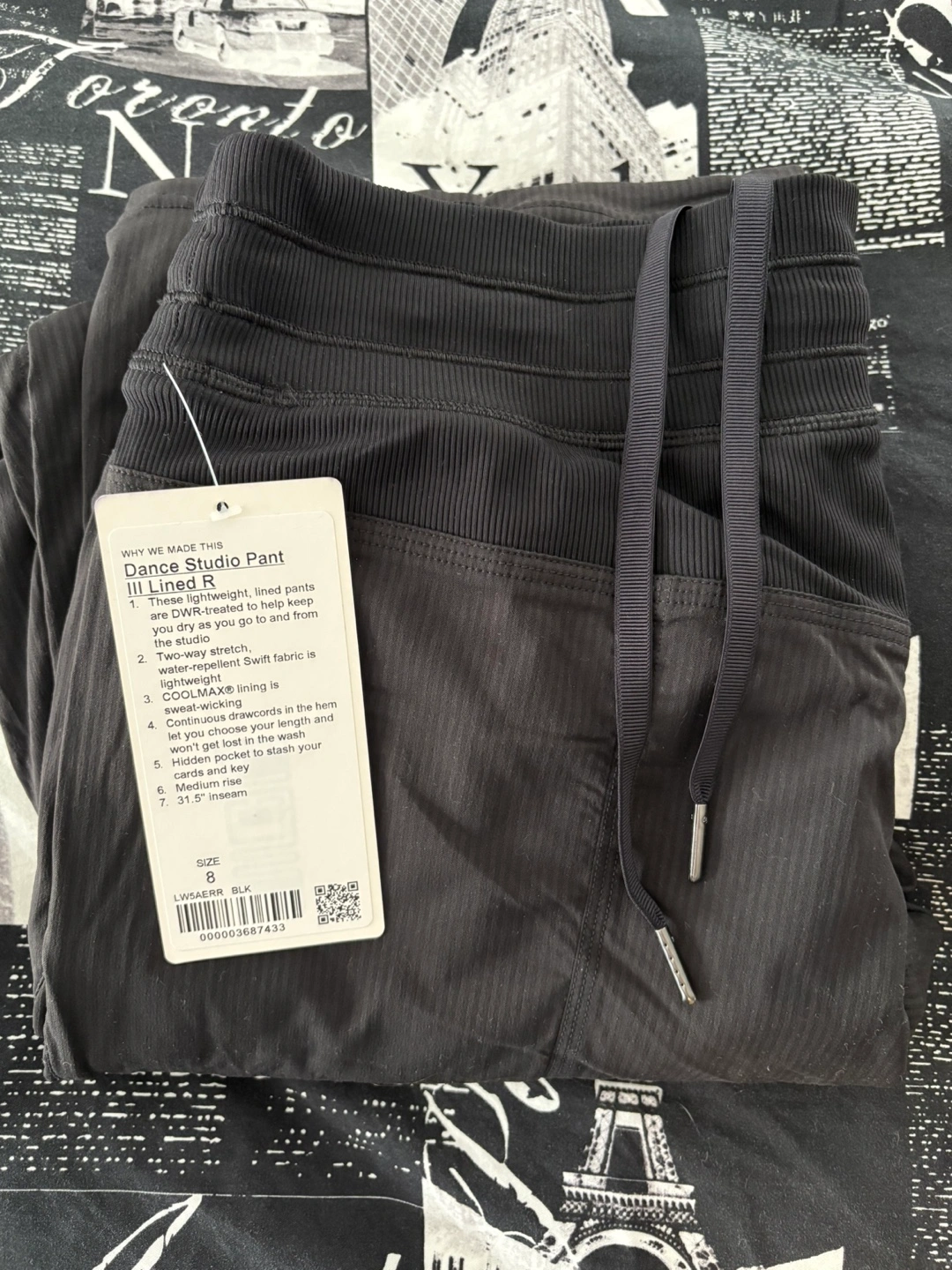 83Lululemon Dance Studio Pant III Lined. Lightweight, lined pants. Size 8. Black. Two-way stretch, water-repellent fabric. COOLMAX® lining. Hidden pocket. Drawstring waist.