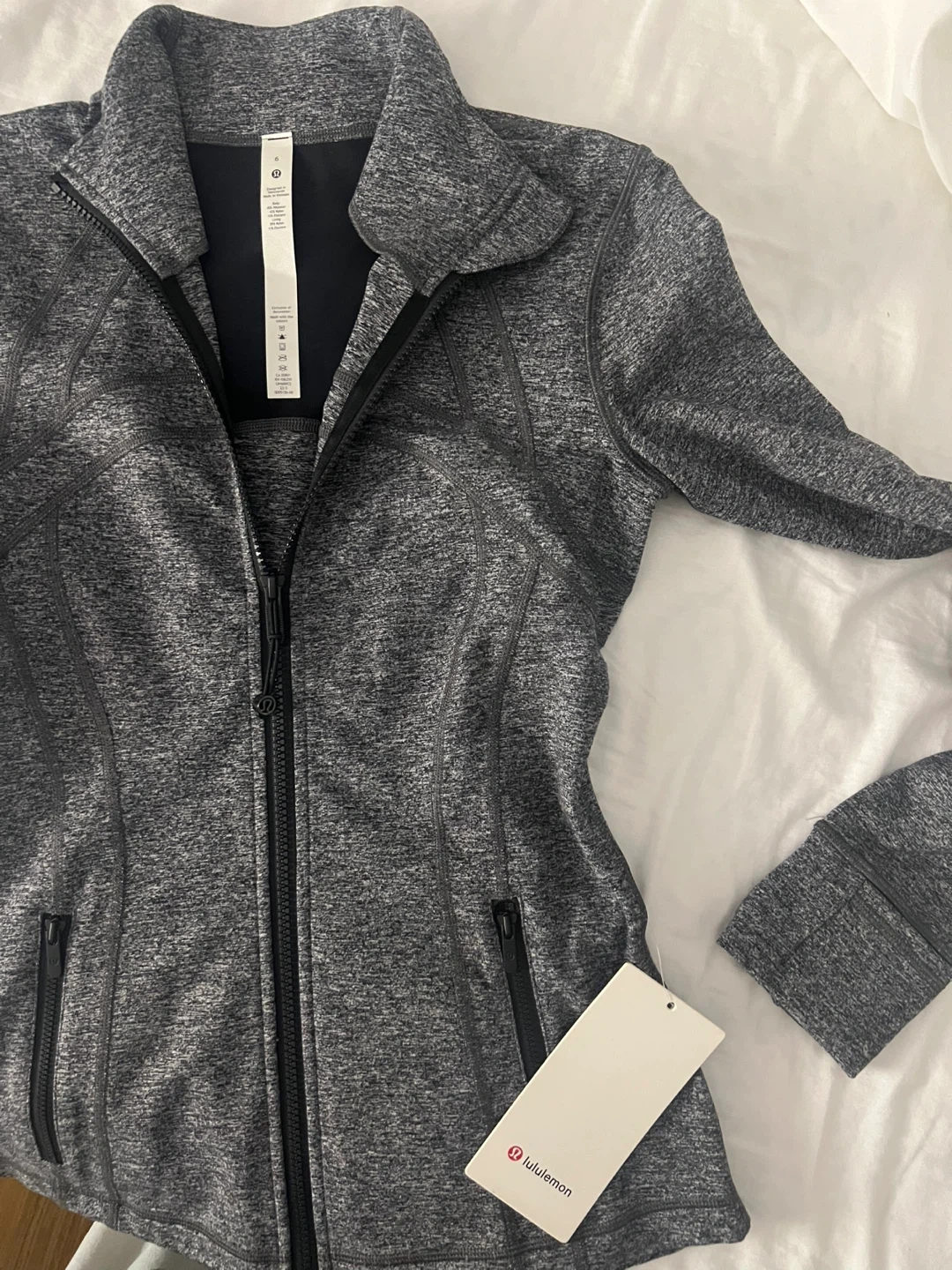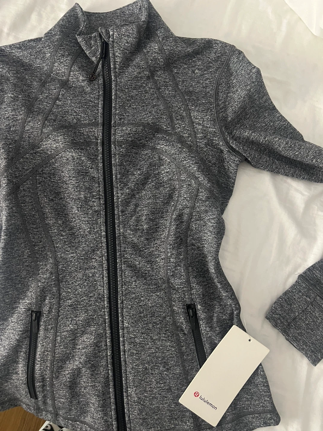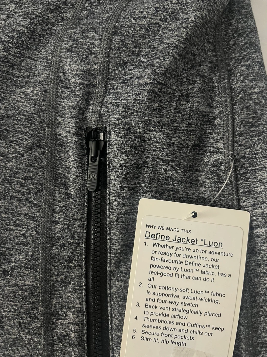 15Never worn, brand new, tag is attached. This Lululemon Define Jacket is made with Luon fabric, which is supportive, sweat-wicking, and provides four-way stretch. It features a slim fit, hip length, thumbholes and cuffins to keep sleeves down and chills out, and secure front pockets. It also has a back vent strategically placed to provide airflow, perfect whether you're up for adventure or ready for downtime