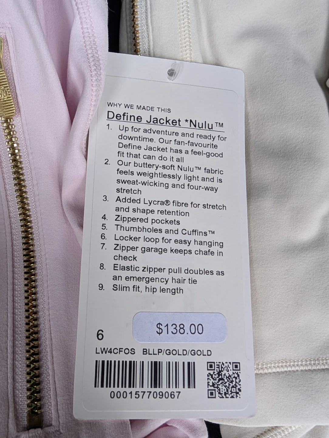 571Selling a Lululemon Define Jacket made with Nulu fabric! This fan-favourite jacket has a feel-good fit that can do it all. The buttery-soft Nulu fabric feels weightlessly light and is sweat-wicking with four-way stretch. It has added Lycra fibre for stretch and shape retention. It also has zippered pockets, thumbholes and Cuffin, a locker loop for easy hanging, and a zipper garage keeps chafe in check. The elastic zipper pull doubles as an emergency hair tie. Slim fit, hip length. Originally bought for $138