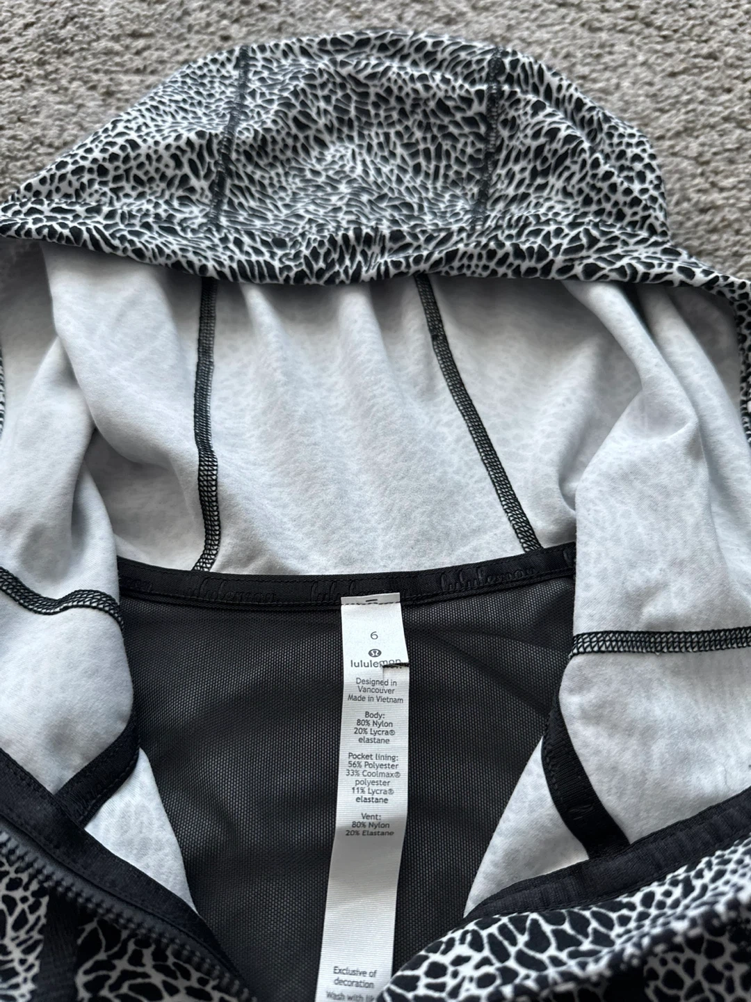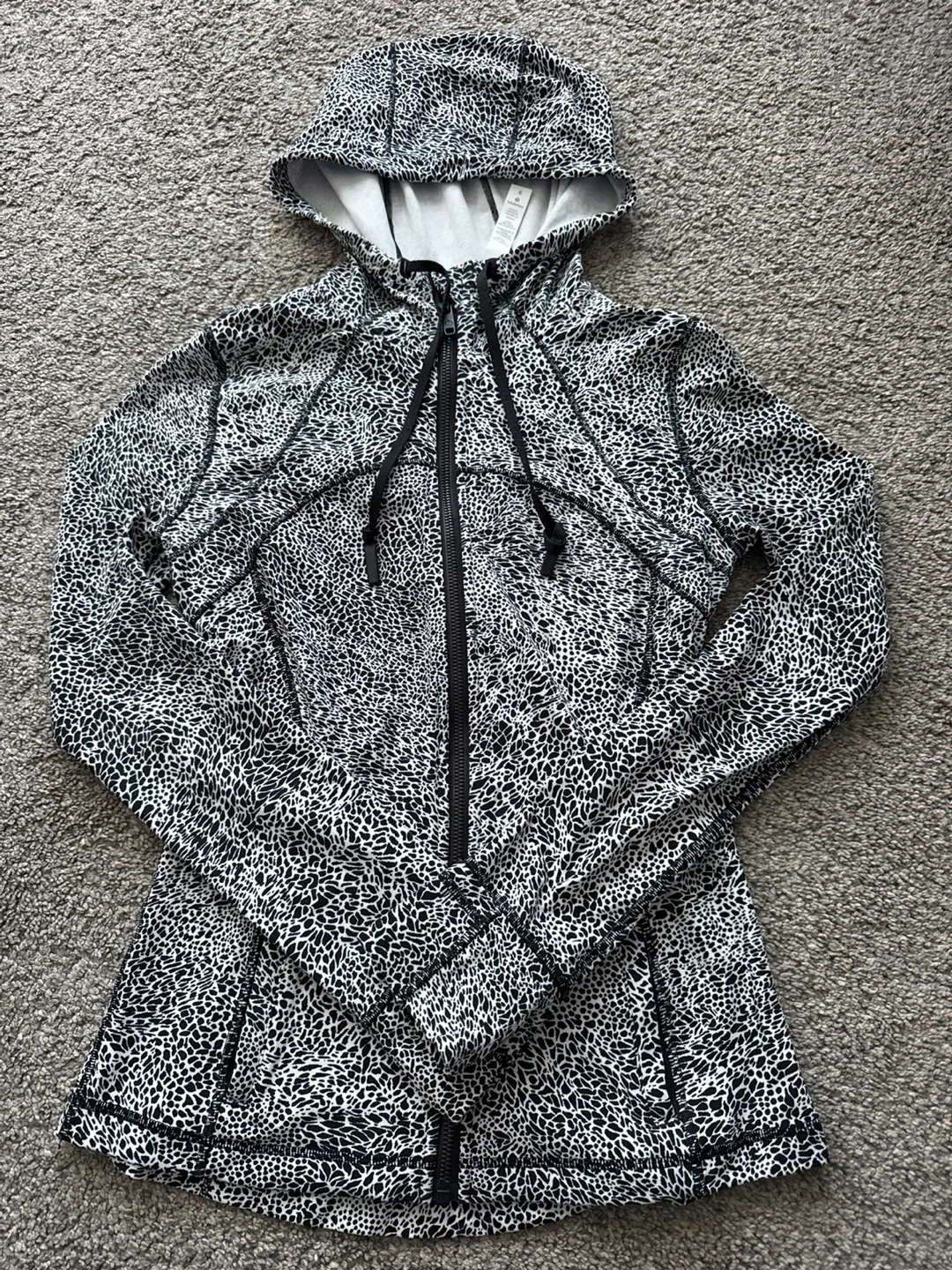 23Selling a Lululemon Define Jacket in size 6. It's in great condition and features a black and white pattern. The jacket is made of 80% nylon and 20% elastane for the body, and the pocket lining is 56% polyester and 44% elastane. The lining is 89% lycra elastane and 11% lycra elastane