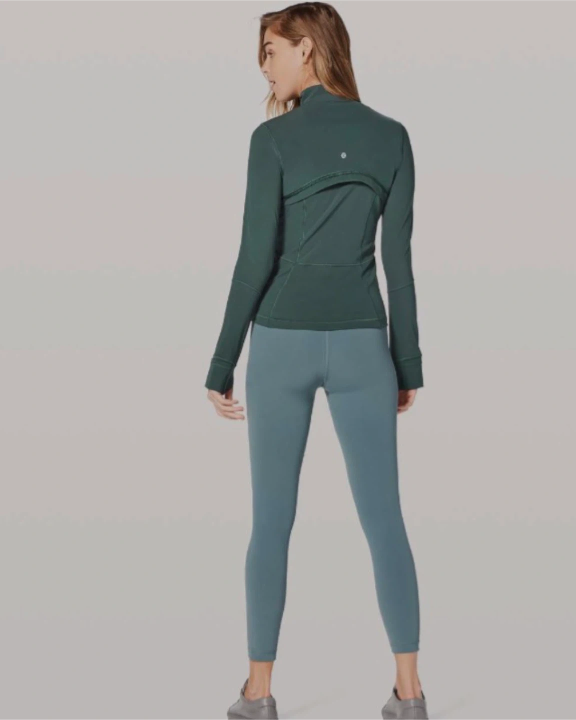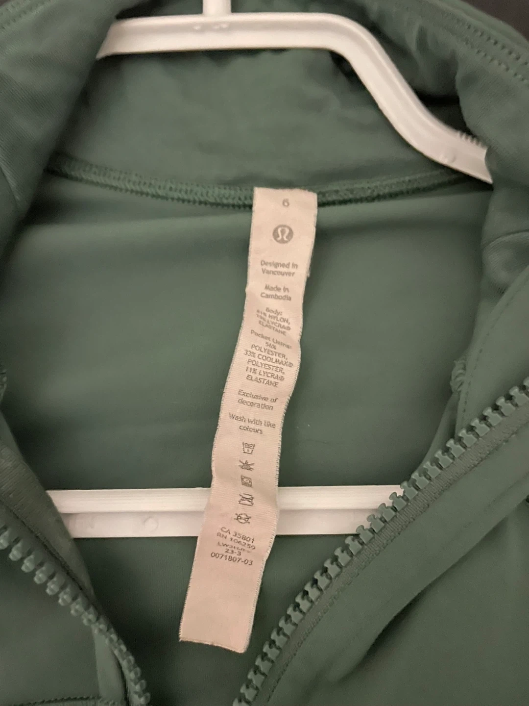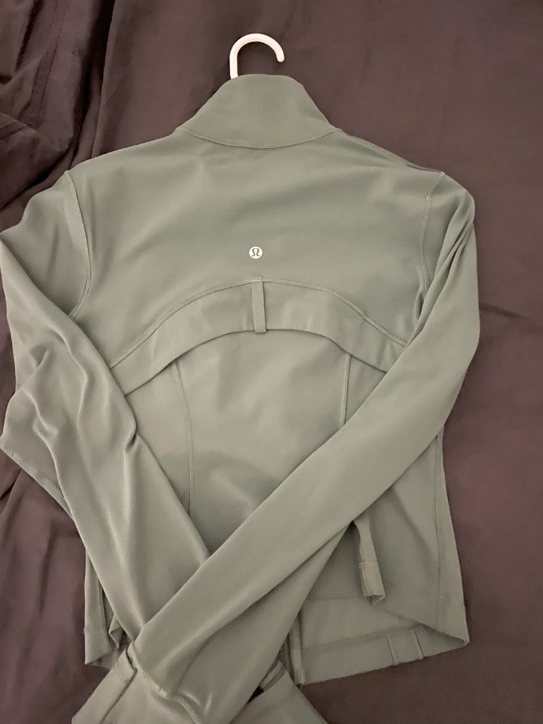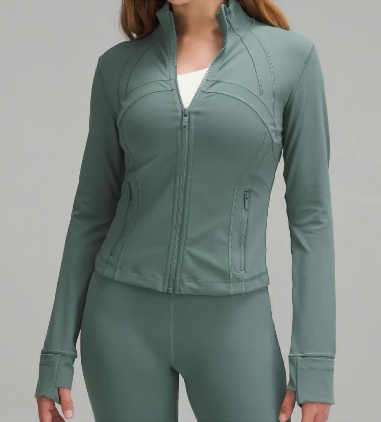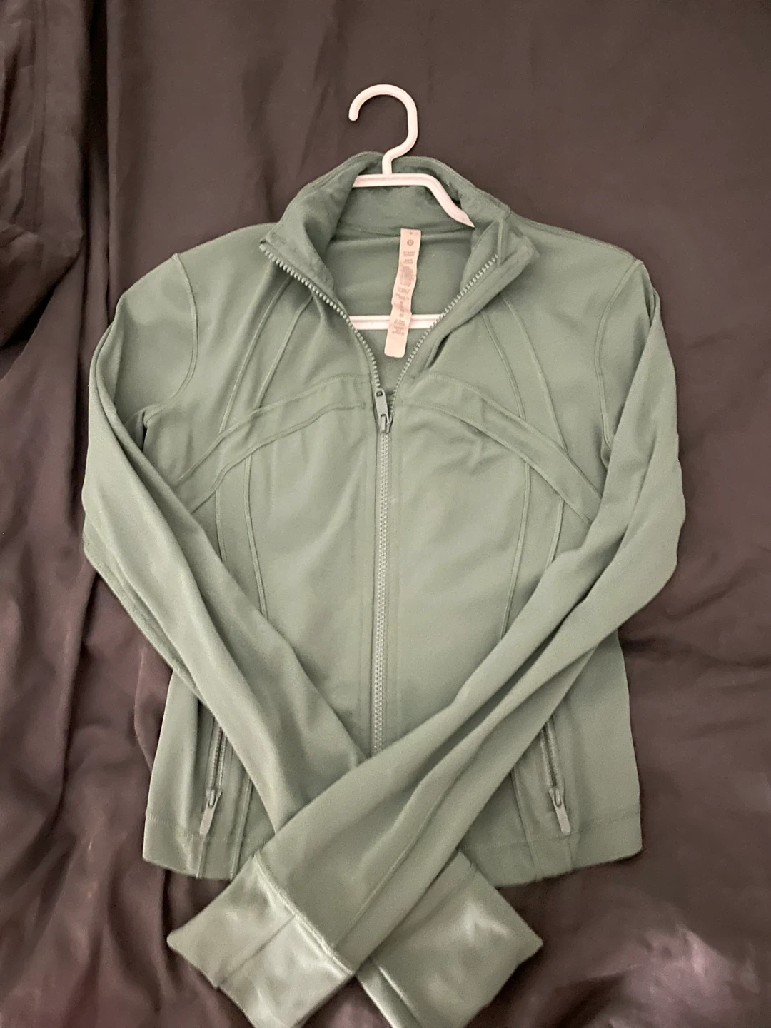Lululemon Define Jacket in a lovely green colour! It's a size 6 and in great condition. The material is a blend of nylon, lycra elastane, and coolmax polyester. Perfect for workouts or just running errands