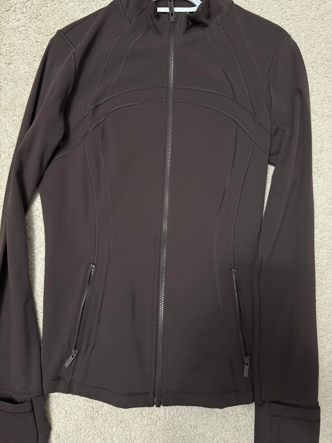 Selling a Lululemon Define Jacket in size 8 and 12. It's in great condition and perfect for workouts or everyday wear. The jacket is a lovely dark brown colour and a black colour. The black is a size 8 and the brown is a size 12!