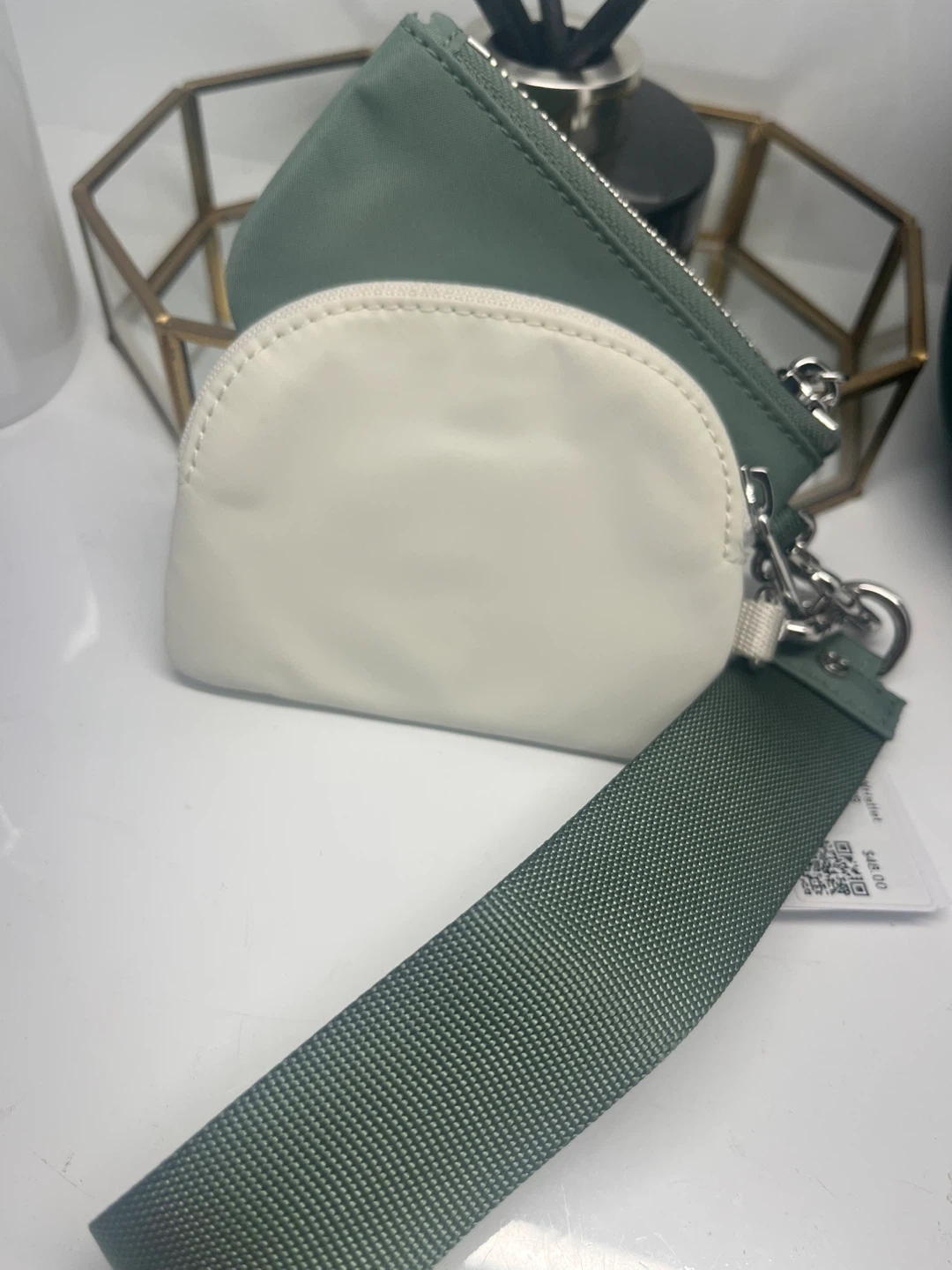 Cute Lululemon two-tone coin purse set! It features a cream-coloured half-moon shaped pouch attached to a green rectangular pouch. Perfect for keeping your essentials organized! Retails for $55 after tax.