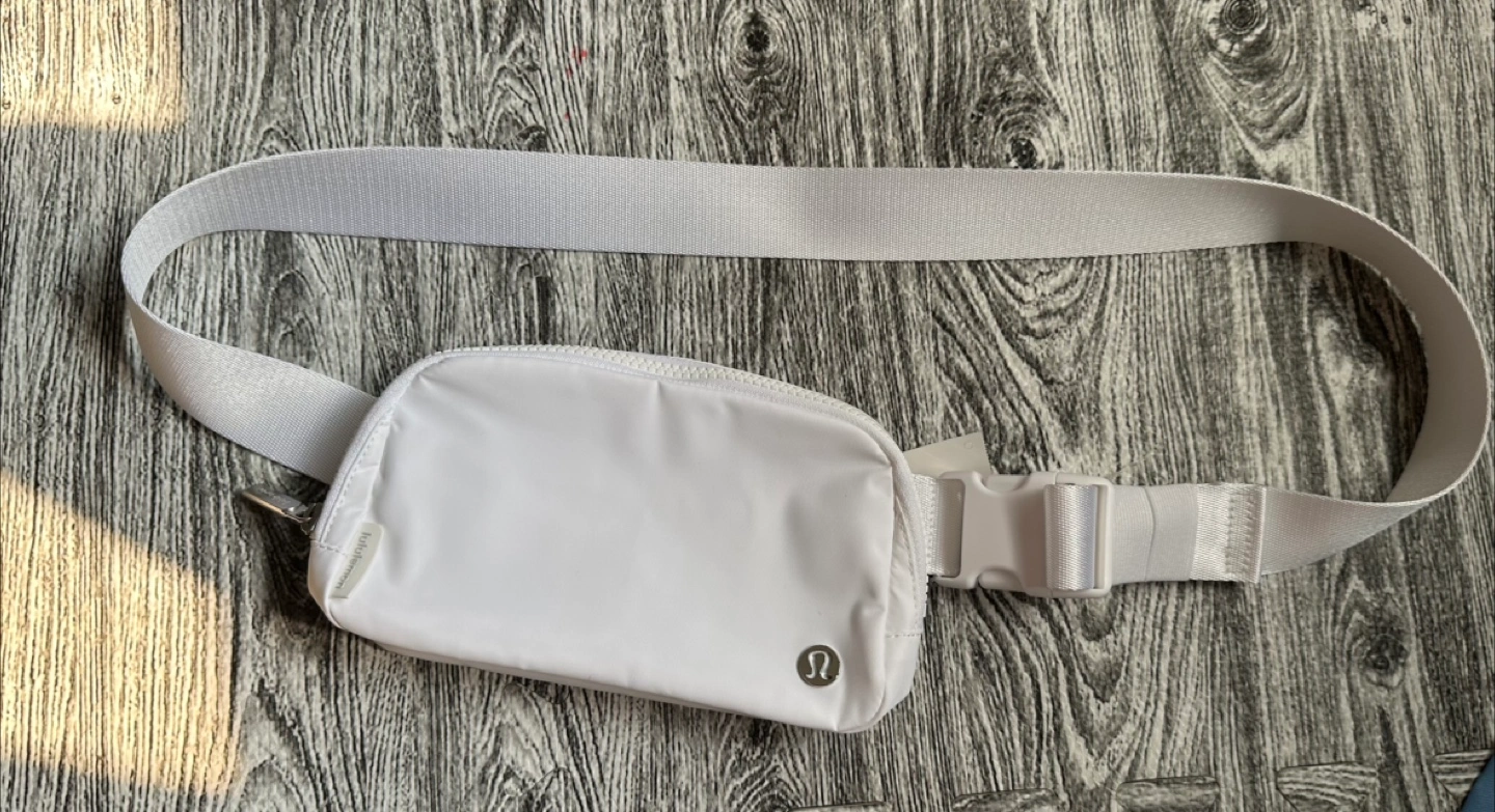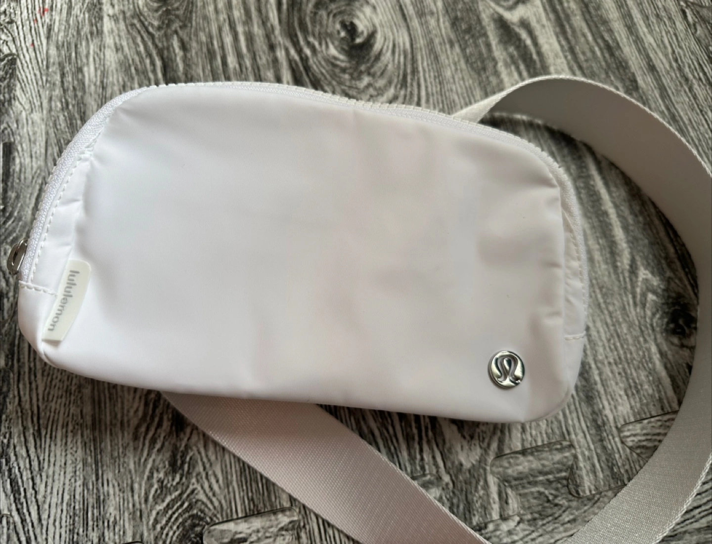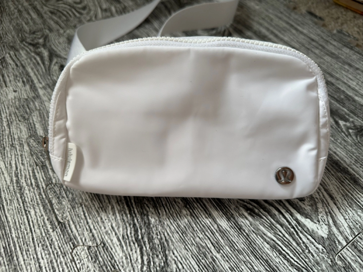 A simple, white, crossbody bag. Comes with a long adjustable strap. The bag itself features a zipper closure. Perfect for carrying essentials while enjoying a walk in nature, allowing you to feel at peace.