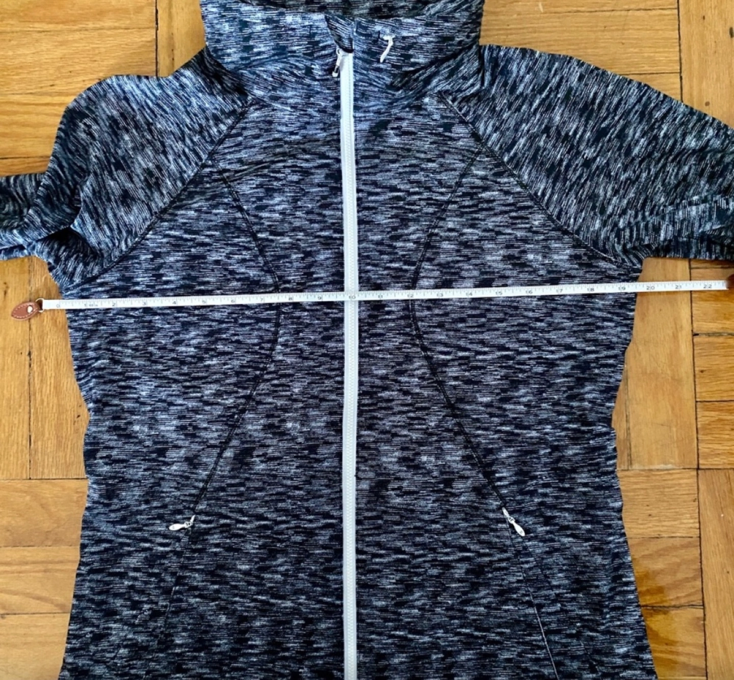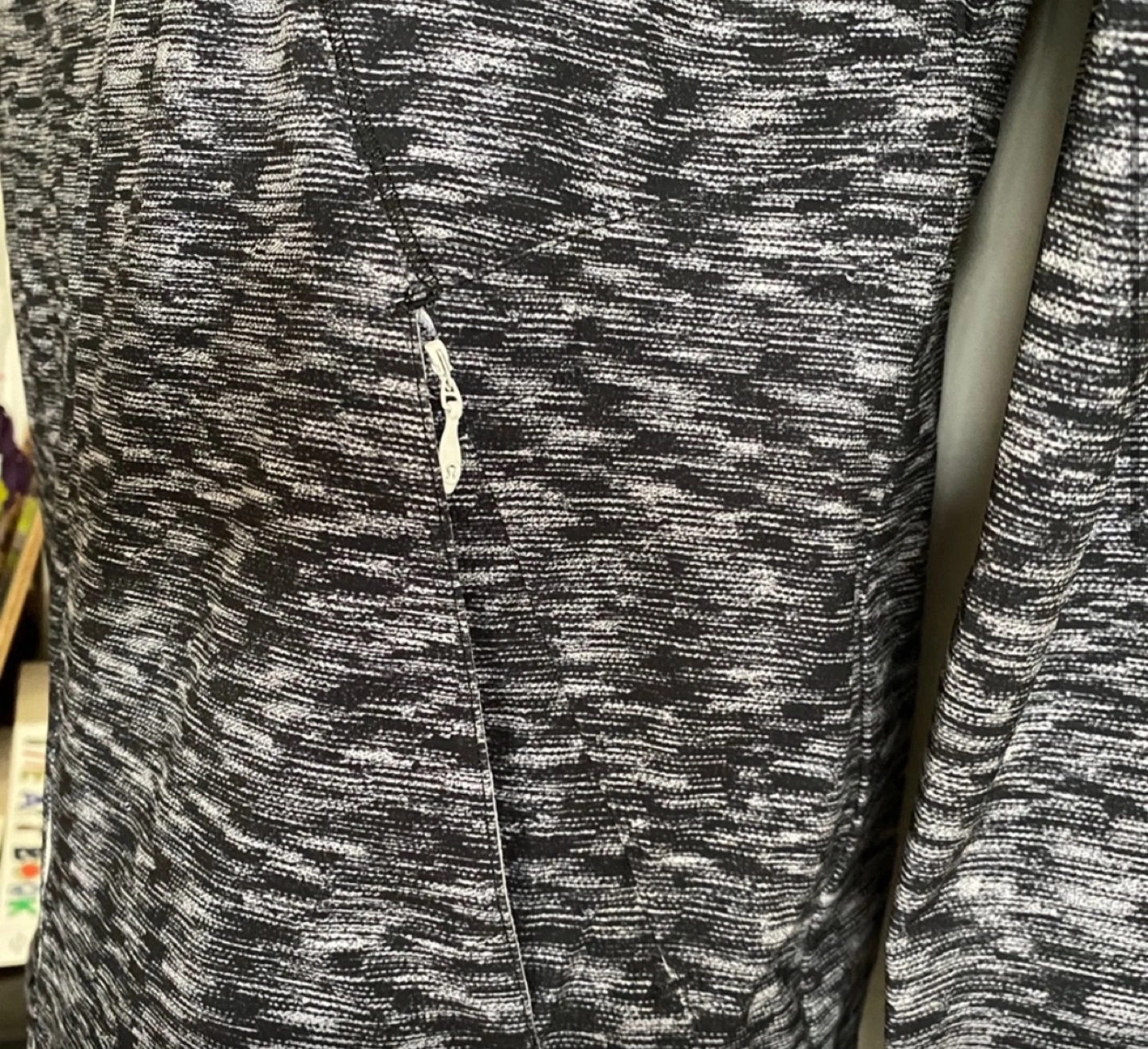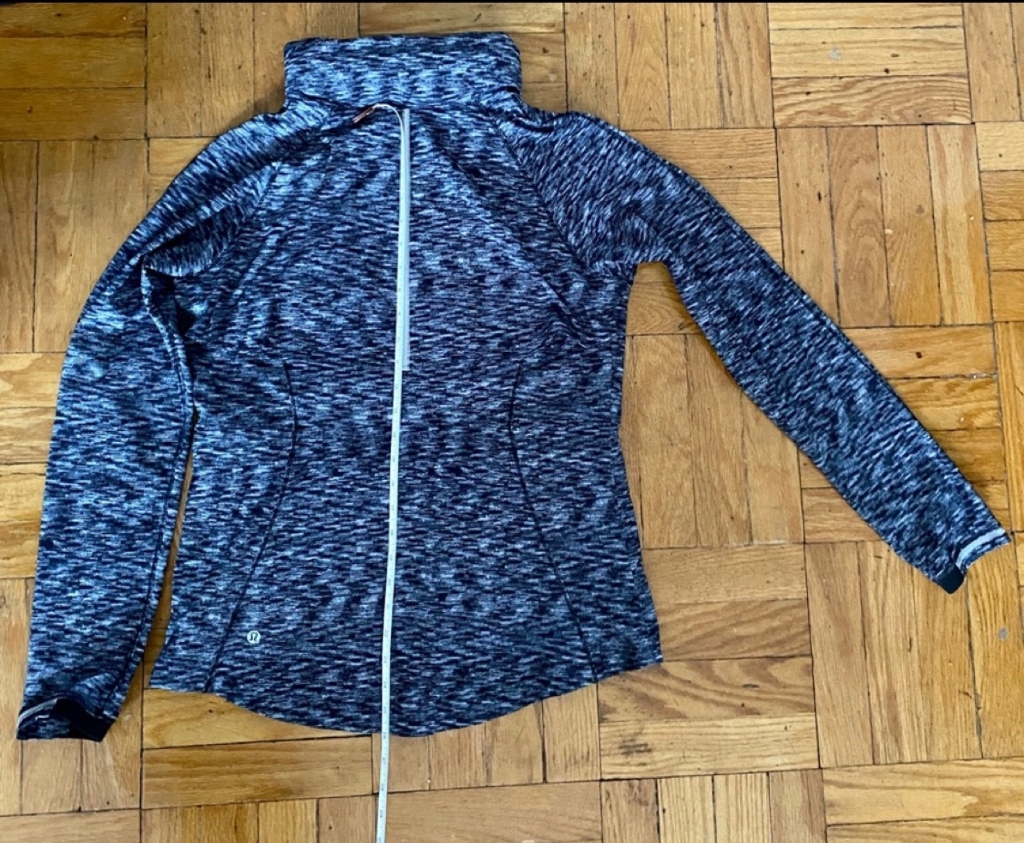 Women's Lululemon Go The Distance Jacket. Size 8. Full zip. Long sleeves. Black and white mottled pattern. Soft and comfortable material. Perfect for layering or wearing on its own.