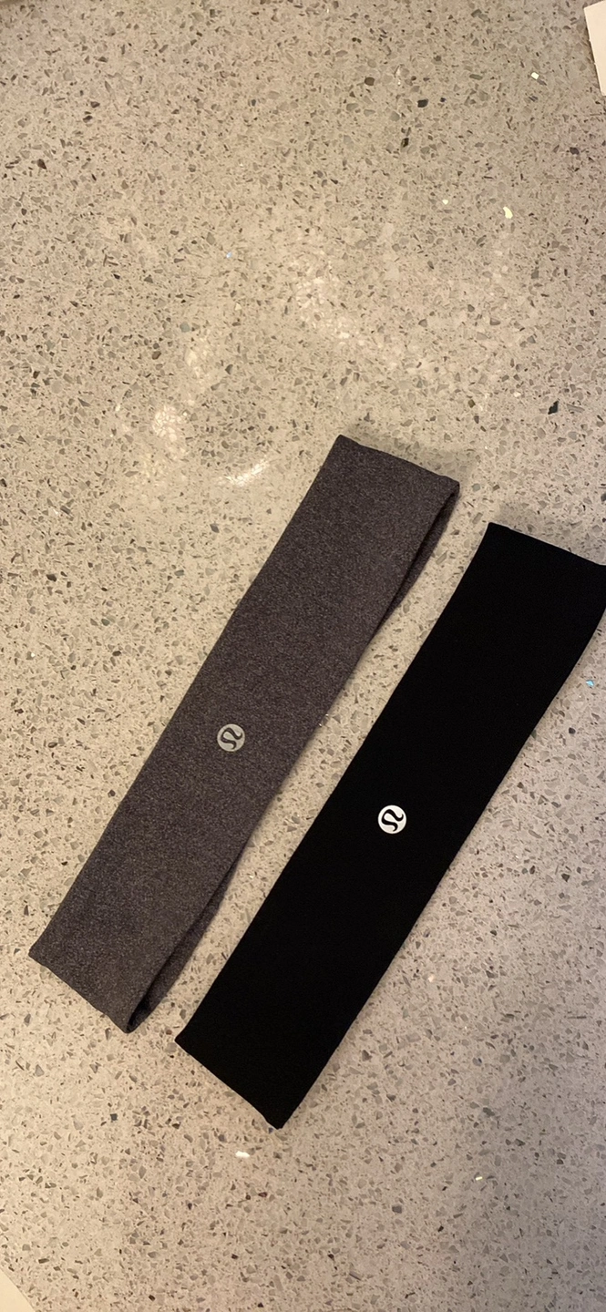Two Lululemon headbands in black and grey. Both have the Lululemon logo. One is black and the other is grey.