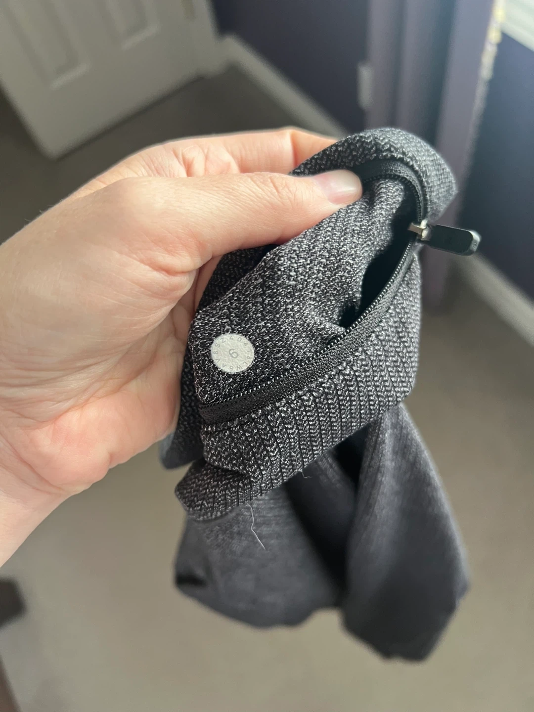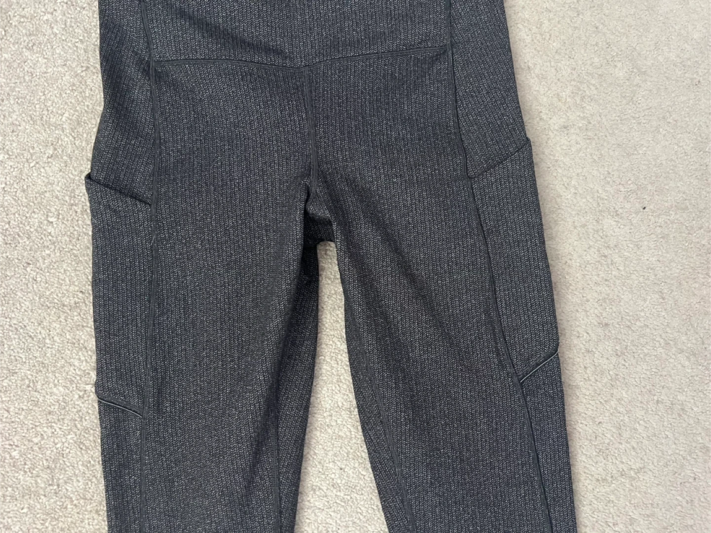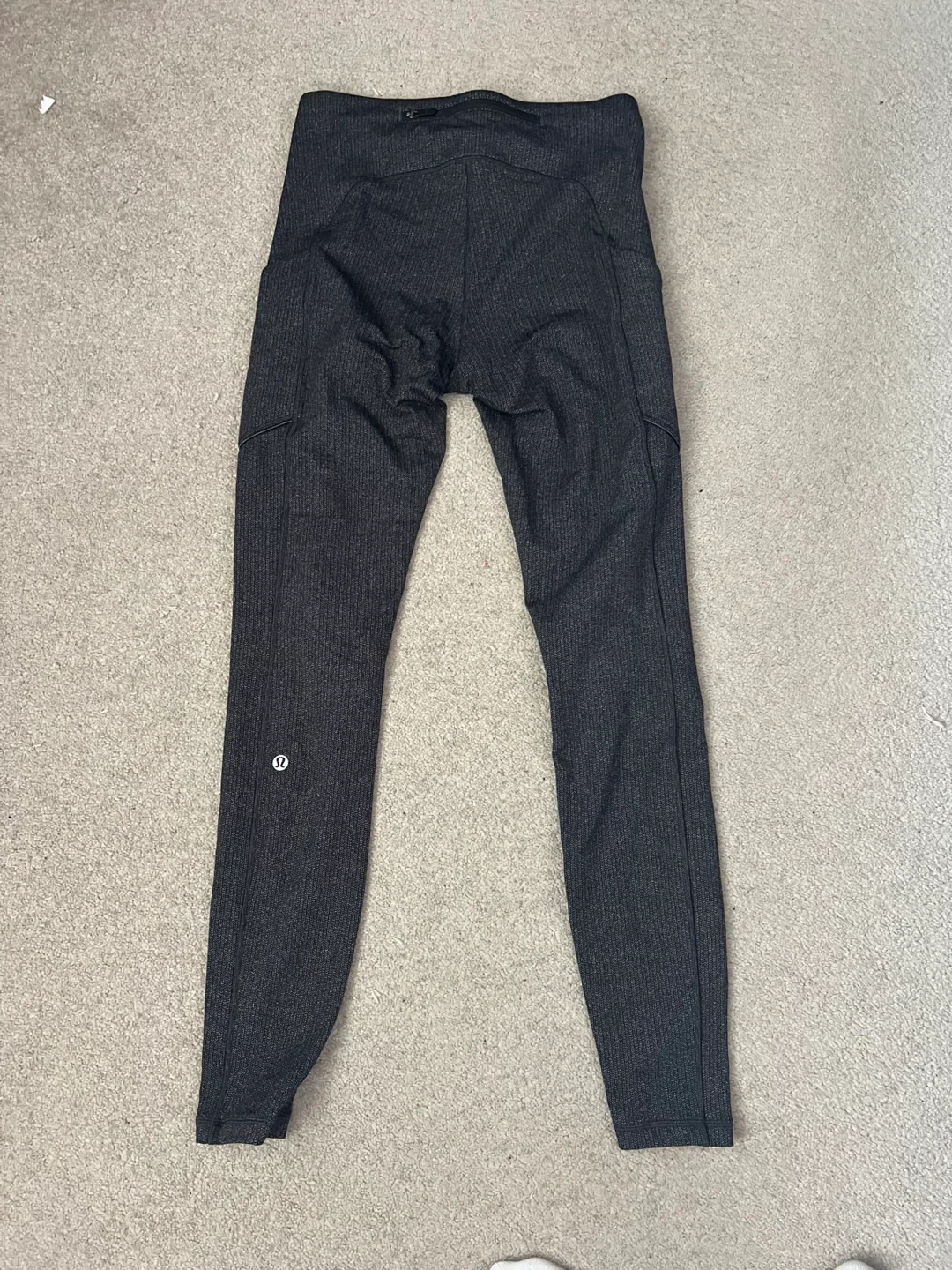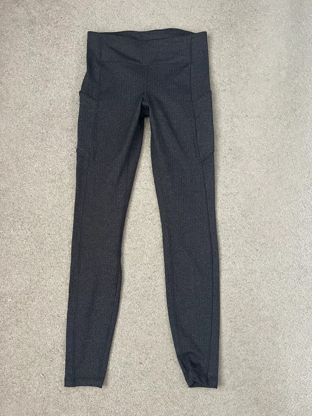 Selling a pair of Lululemon leggings in a heathered grey colour. They are a size 6 and in great condition. These leggings have convenient pockets on the sides, perfect for your phone or keys. The Lululemon logo is visible on the back of the leg. They're super comfy and great for workouts or just lounging around!