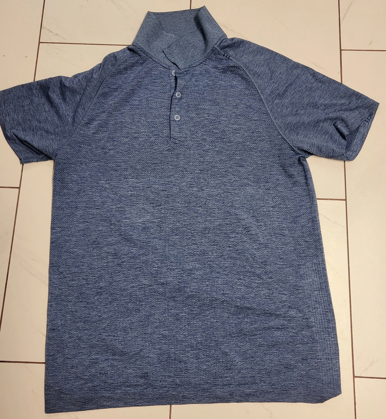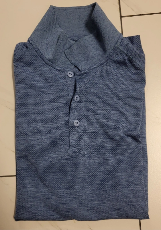 201Men's short sleeve polo shirt. Blue with a textured pattern. Has a button up closure.