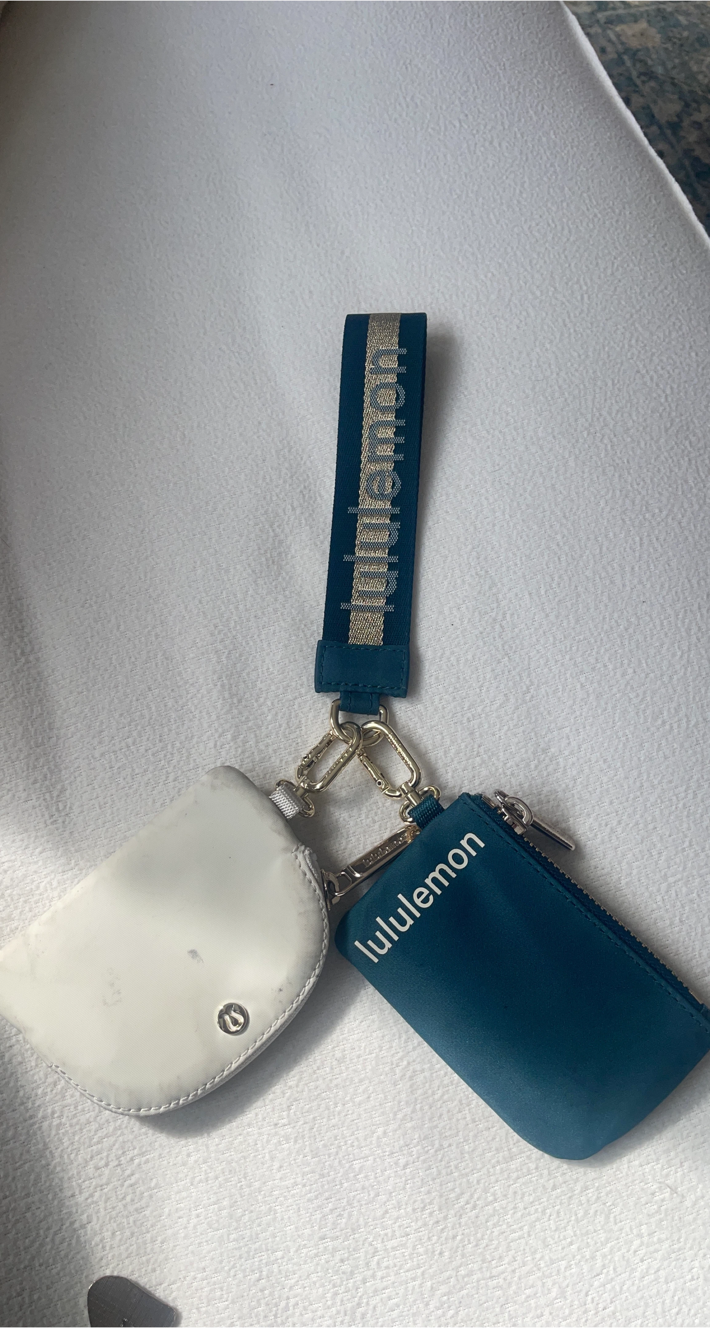 22Selling a Lululemon set that includes a white pod and a teal pouch, perfect for keeping your essentials organized! The pod has a few marks on it, but overall it's in good condition. The pouch is in great shape and ready to go. Great for keys, cards, or small accessories