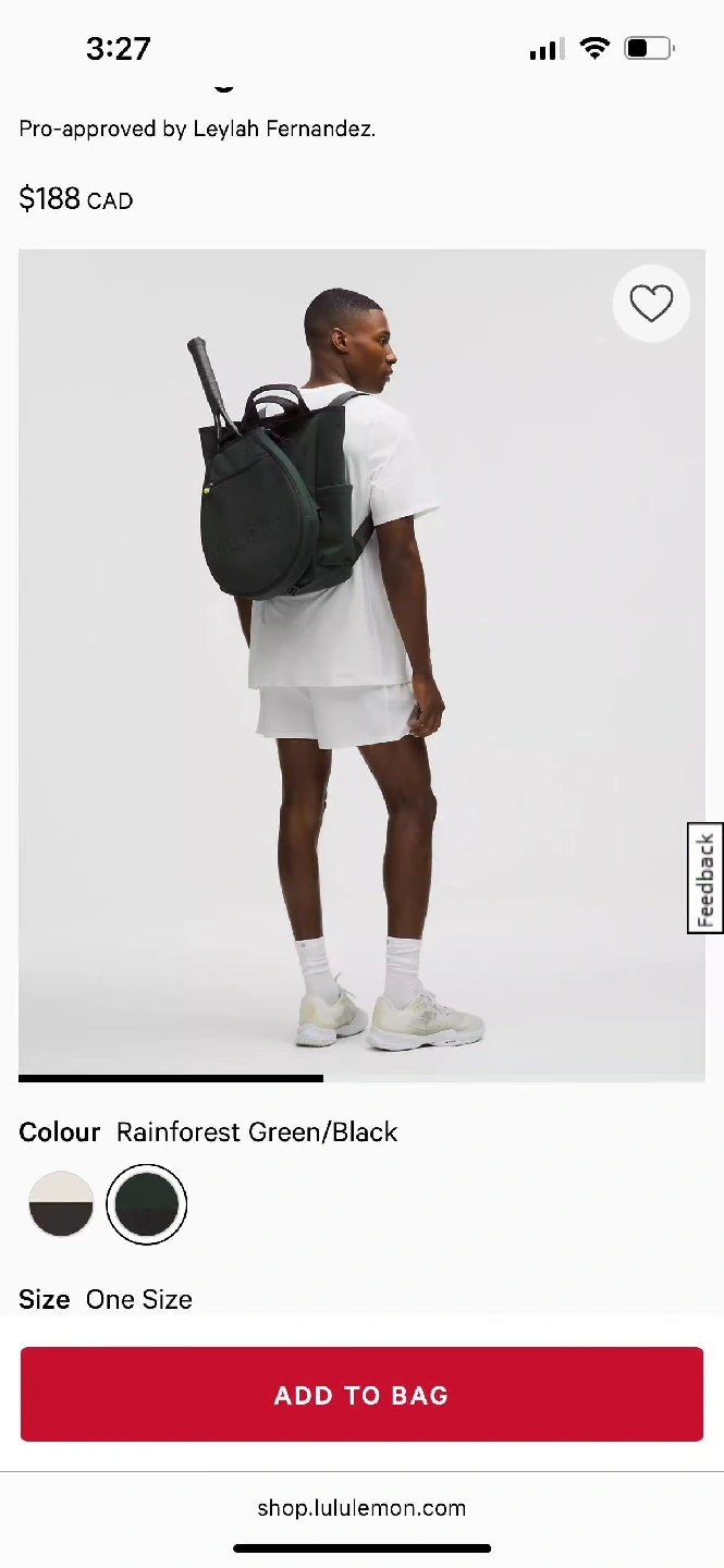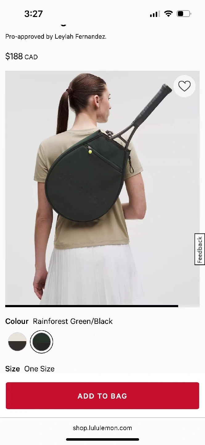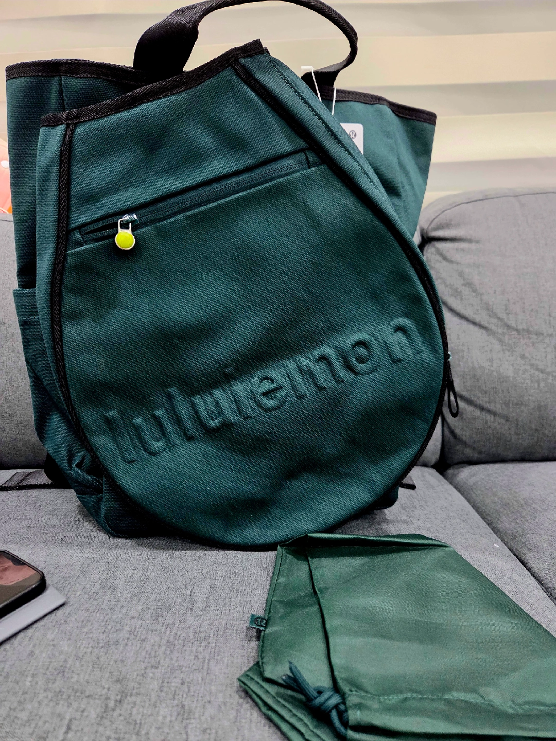 60Selling a Lululemon Racket Bag 19L in the Rainforest Green/Black colour. It's in great condition and ready for your tennis gear! Originally bought for $188 CAD. It's pro-approved by Leylah Fernandez!