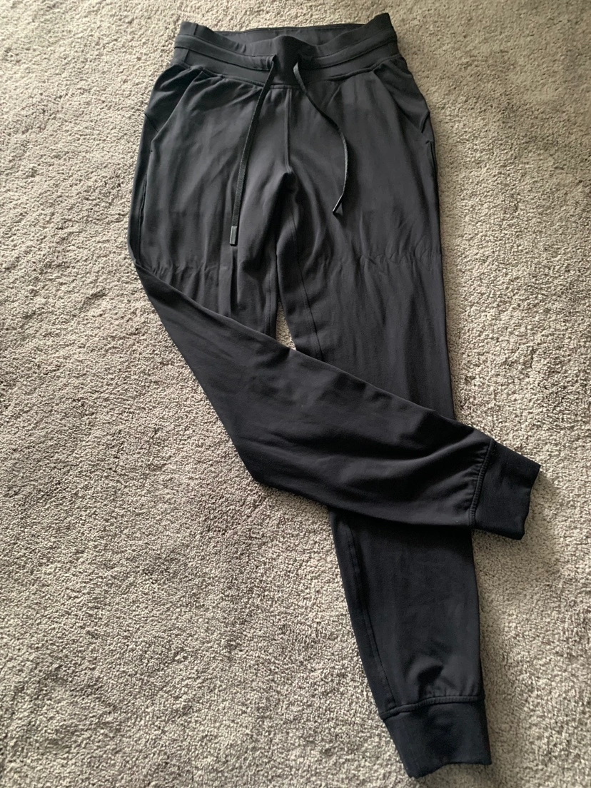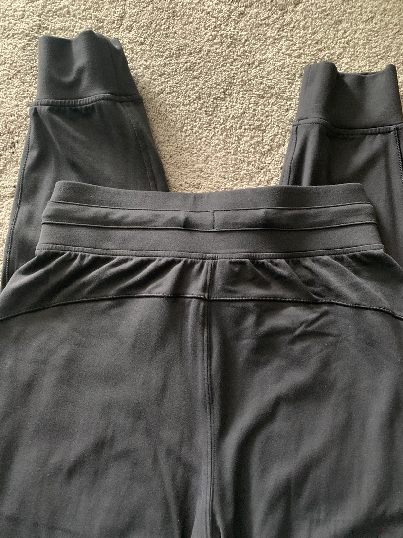 10Worn twice. Black joggers with a drawstring waistband and side pockets.
