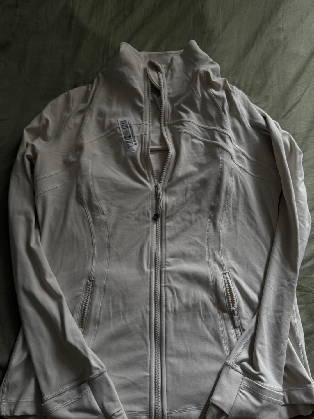 Light beige zip-up jacket. Long sleeves, pockets. Great for layering.