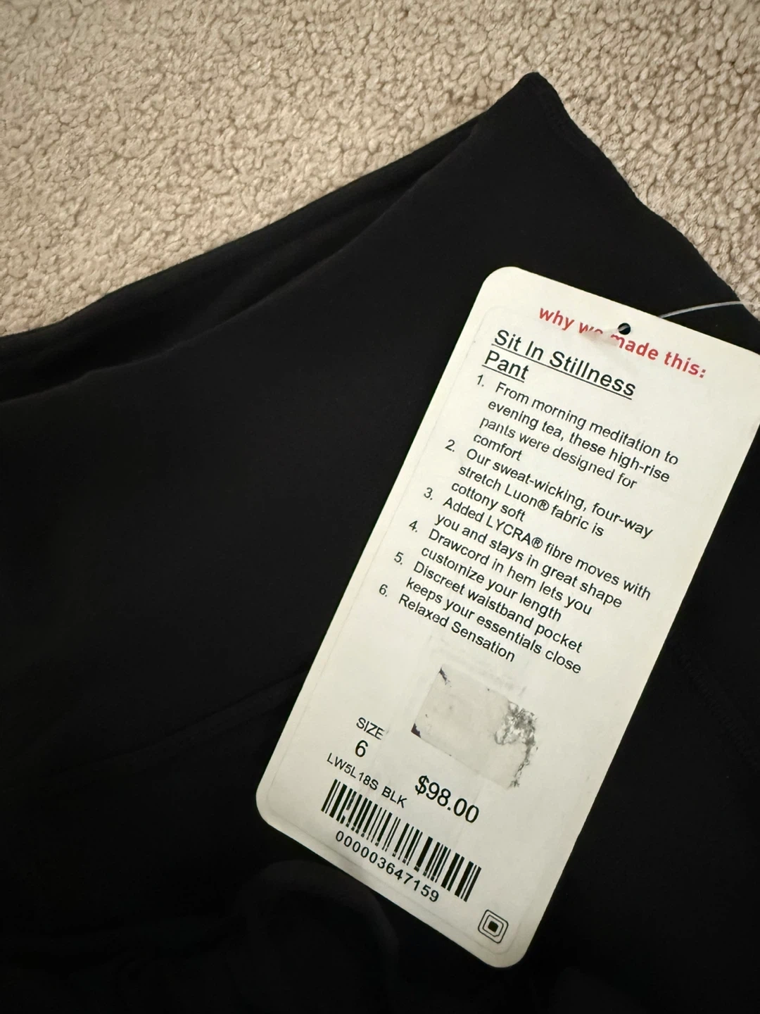 46Selling a pair of Lululemon Sit In Stillness pants in black, size 6! These high-rise pants are designed for comfort, whether you're enjoying evening tea or morning meditation. They're made with sweat-wicking, four-way stretch Luon® fabric, which feels soft against the skin. The added LYCRA® fibre allows for great movement and shape retention. You can customize the length with the drawcord in the hem, and there's a discreet waistband pocket to keep your essentials close