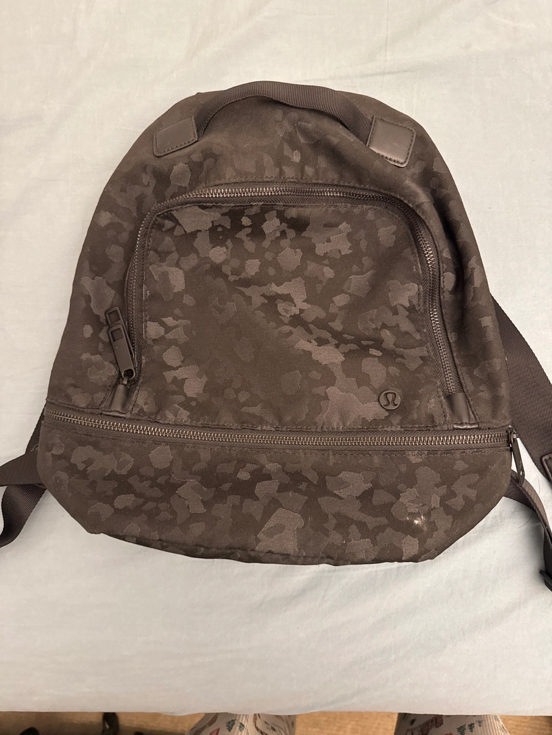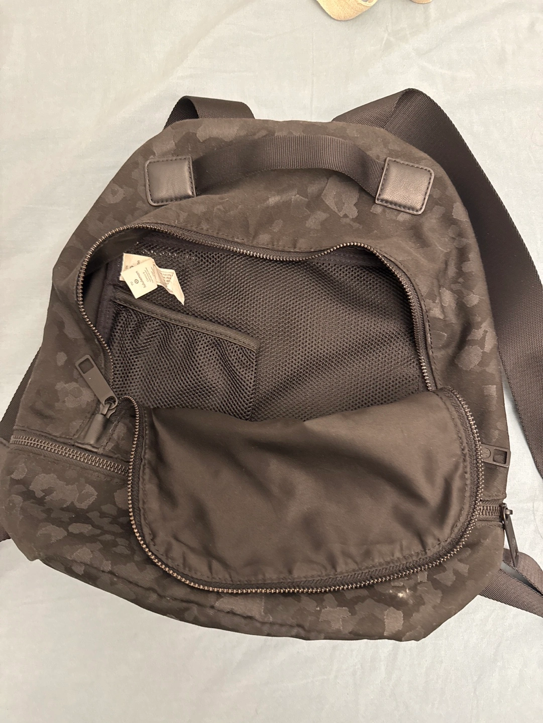 41Black backpack with a camouflage pattern. Has a zippered pocket on the front and a zippered pocket on the inside. Several pockets and a mesh pocket on the inside.