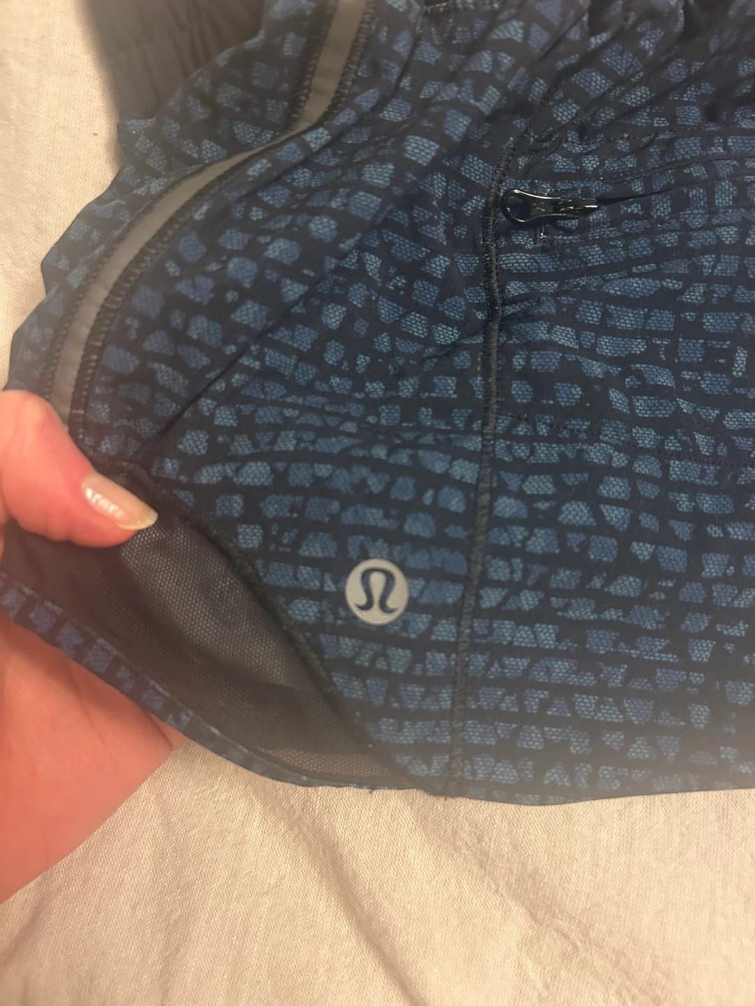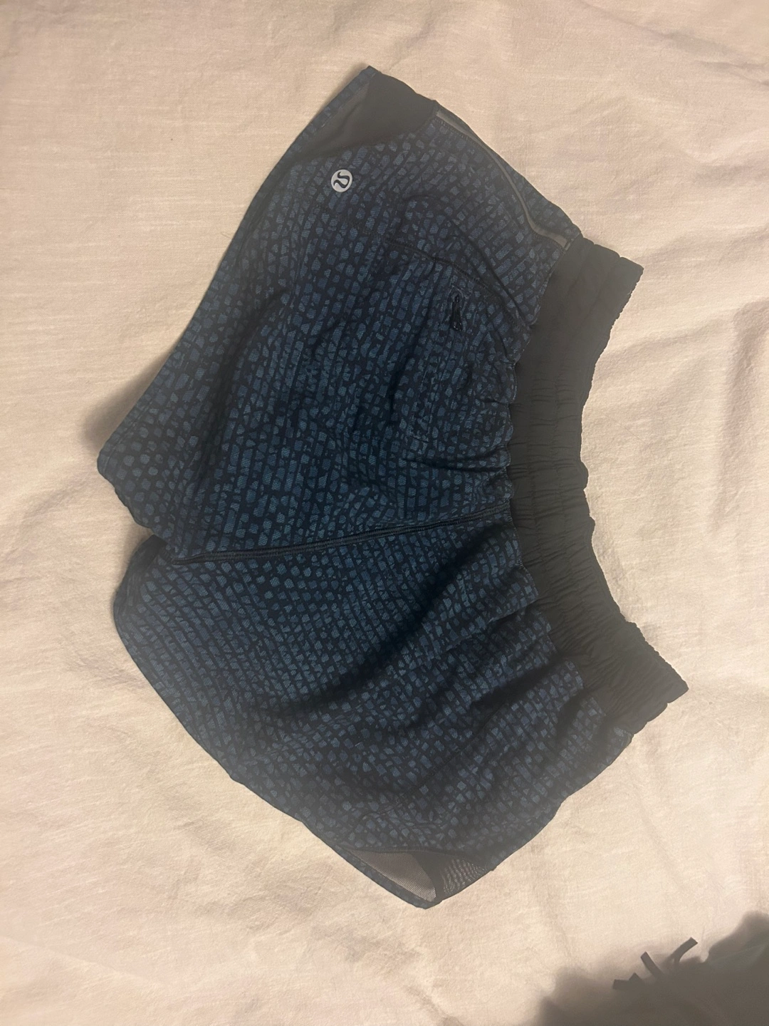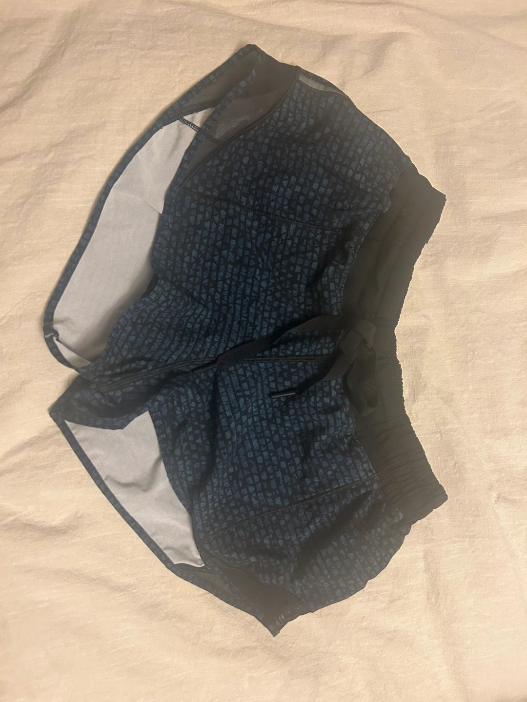 478Lululemon Speed Up shorts, size 8. Blue patterned fabric. Mesh inserts. Drawstring waist. Small inner pocket.