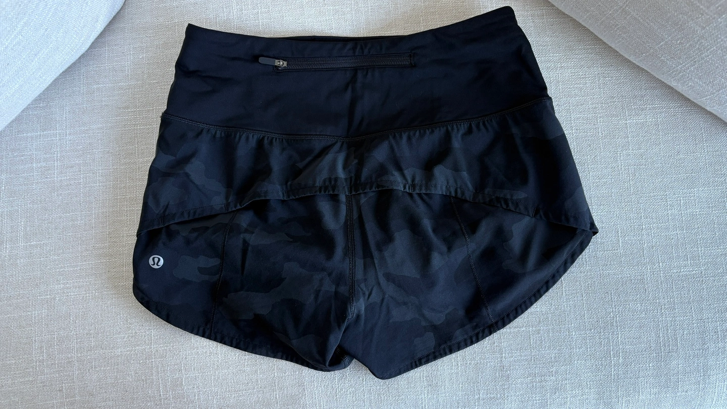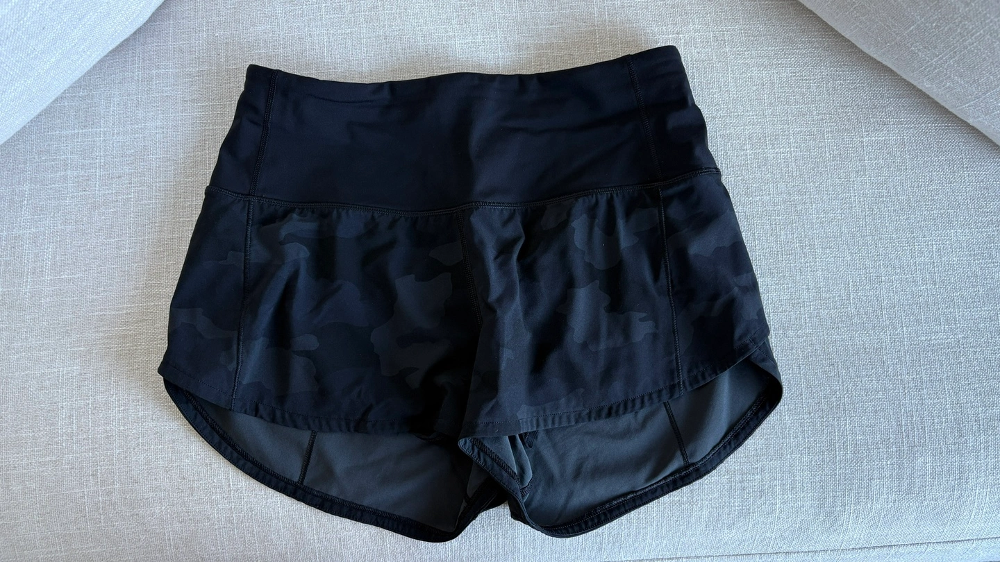 21Lululemon Speed Up Lined Shorts Black camo Size 4