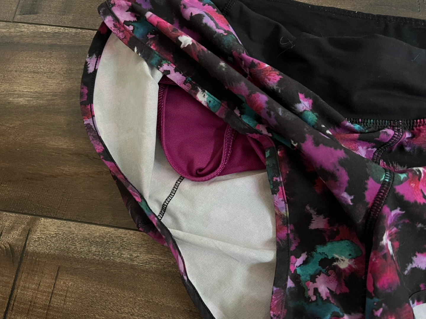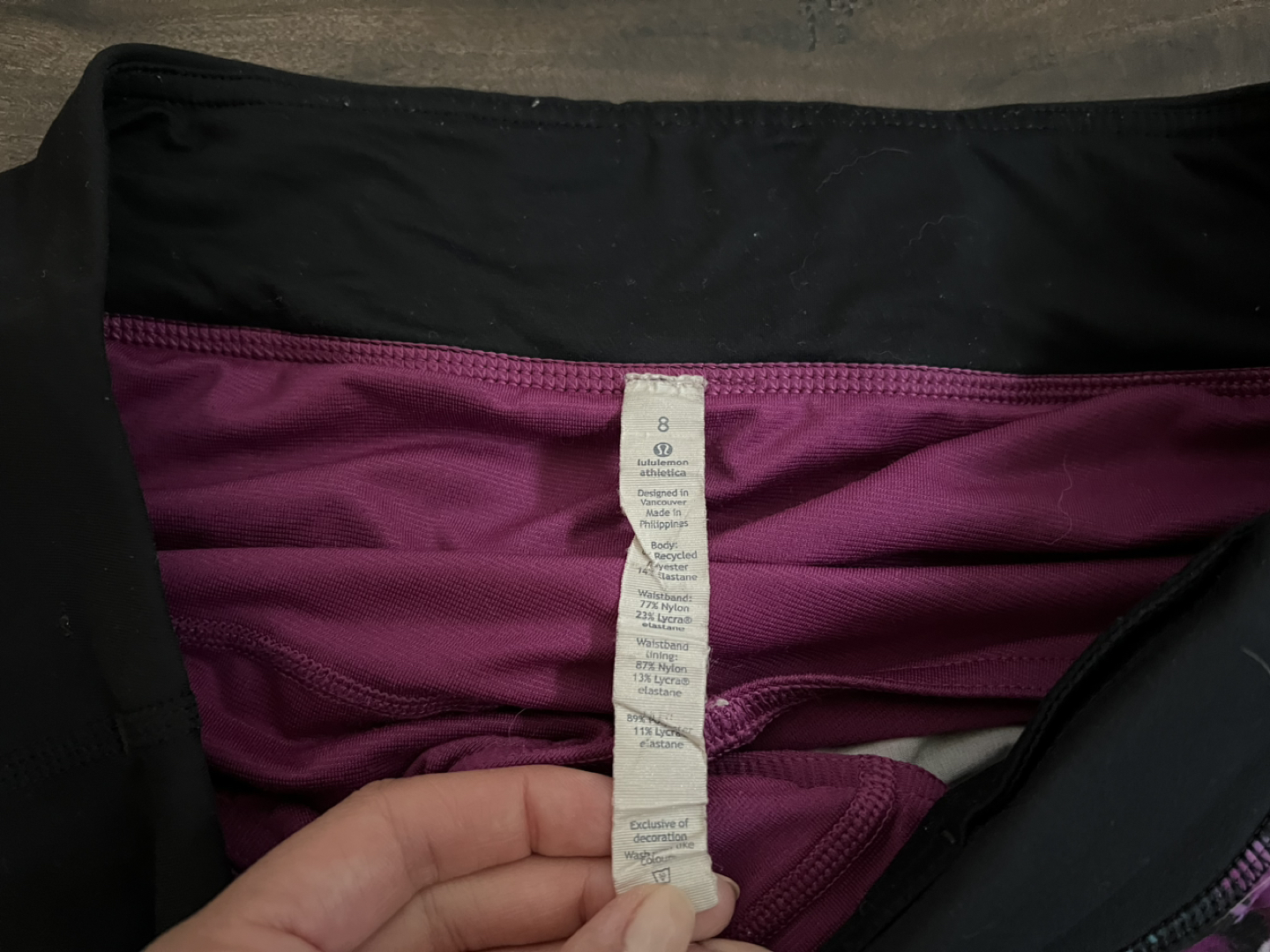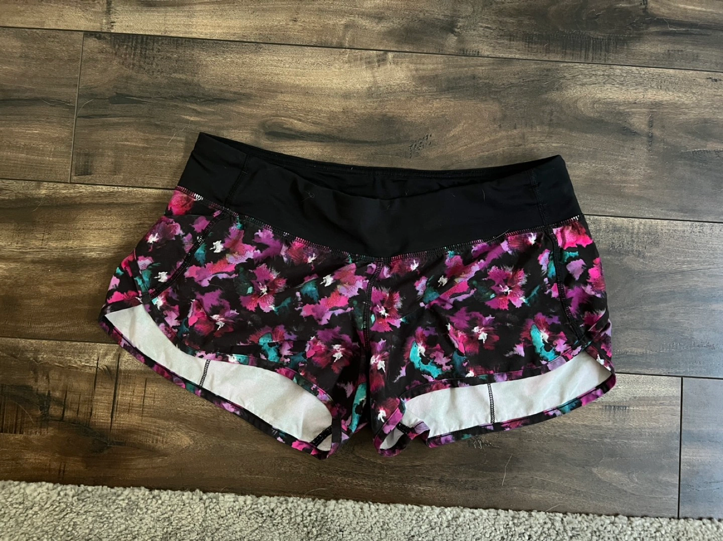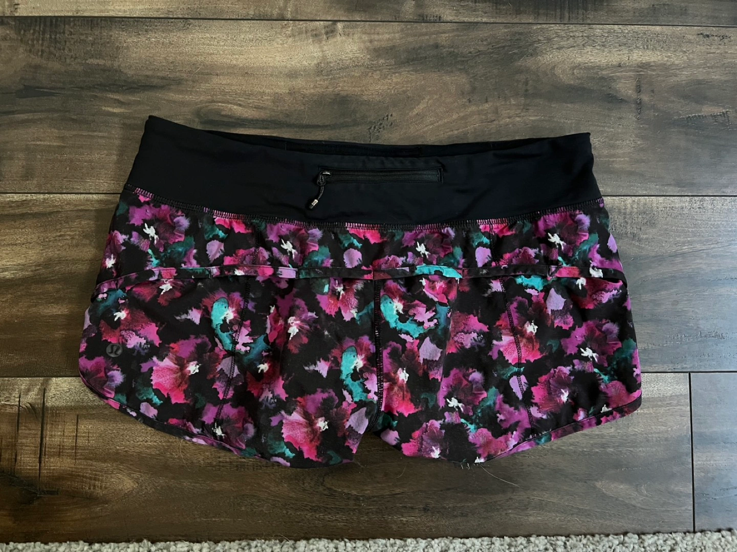 43Size 8, 2.5” inseam, lined, low rise Zipper back pocket on waistband Fits mid-rise on a size 6 person.