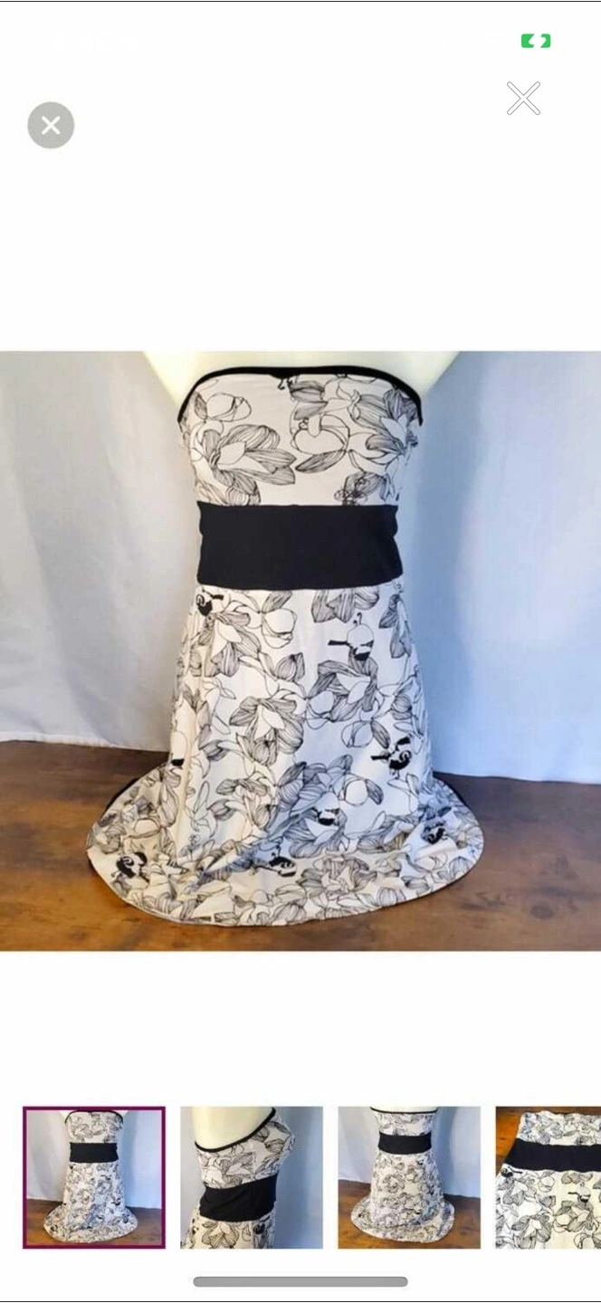 10Beautiful strapless dress. Features a black midsection. A lovely dress to wear out to a nice dinner and enjoy the evening.