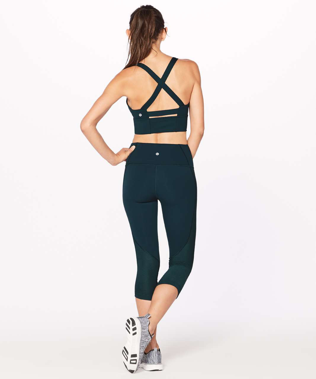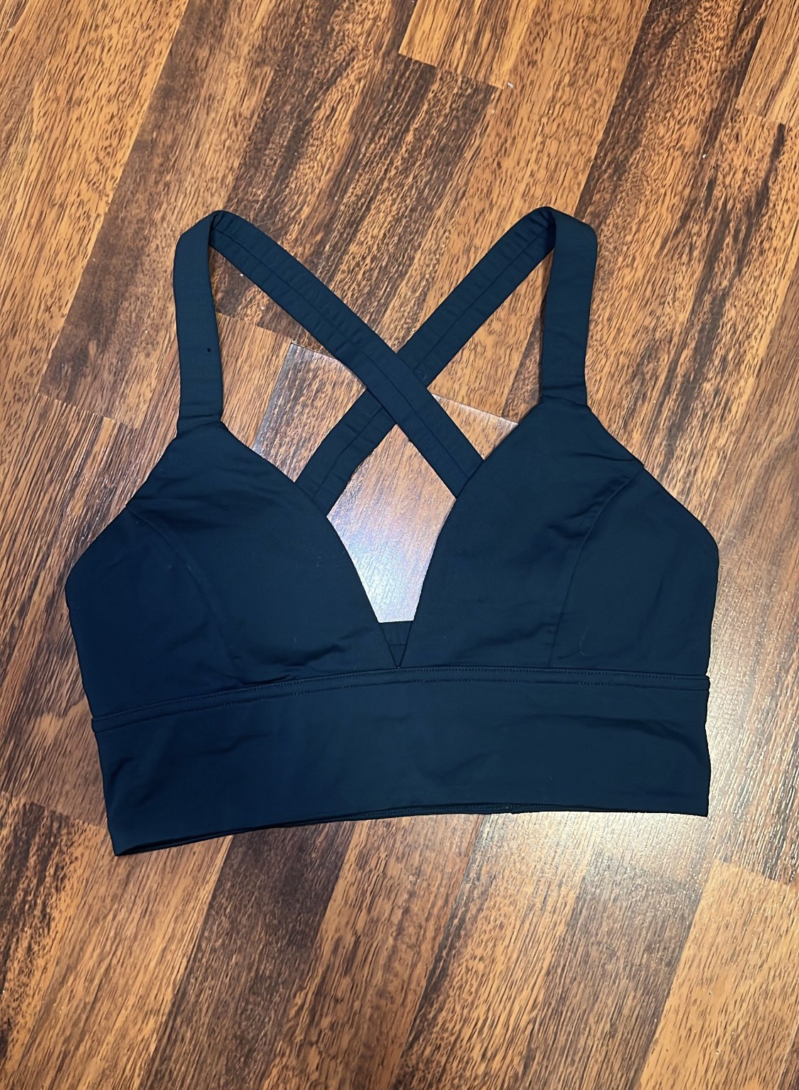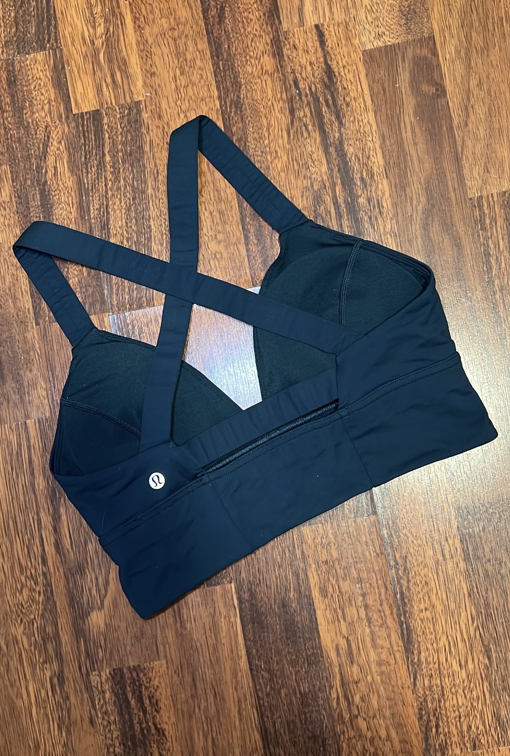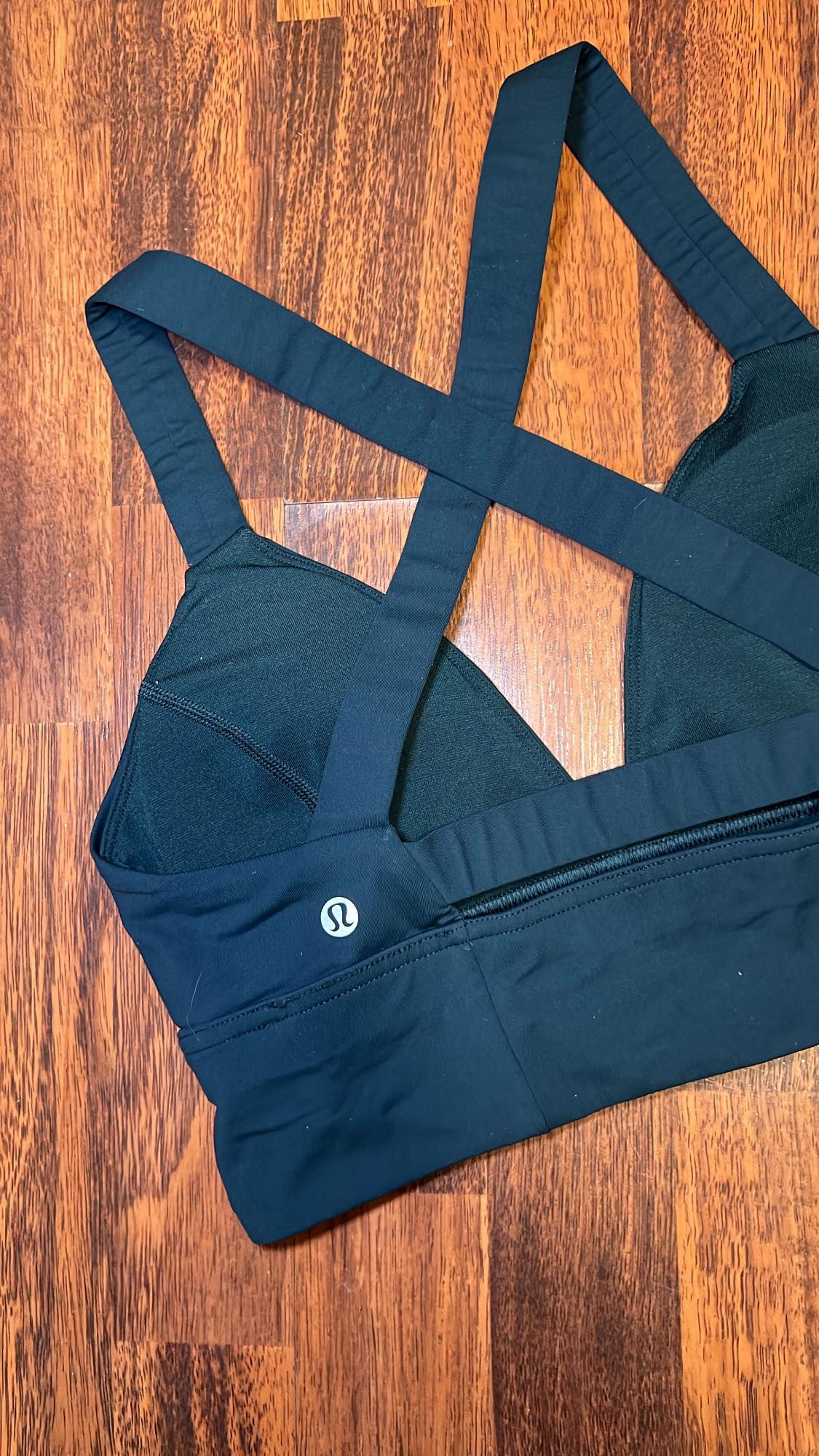 150Lululemon Sweat Your Heart Out Bra. Bra with a deep V neckline and an open back to keep you cool during low-impact, high-sweat activities. Removable cups for a little extra coverage. This bra is intended to provide light support for an A/B cup. Worn once. Size 8.
