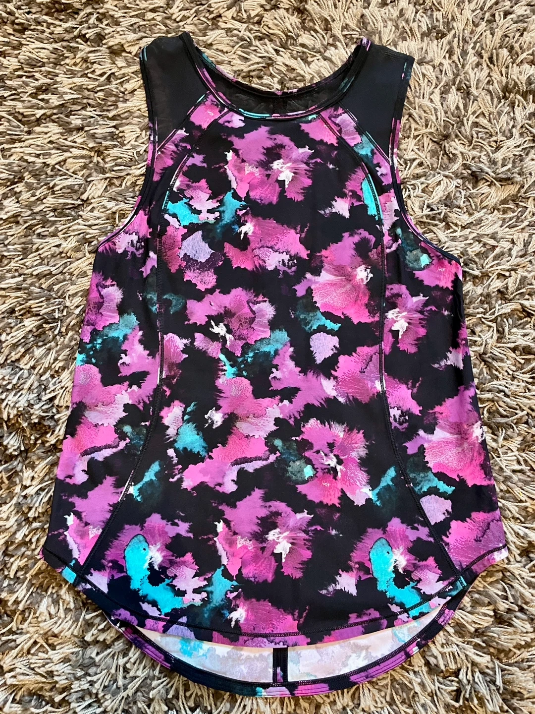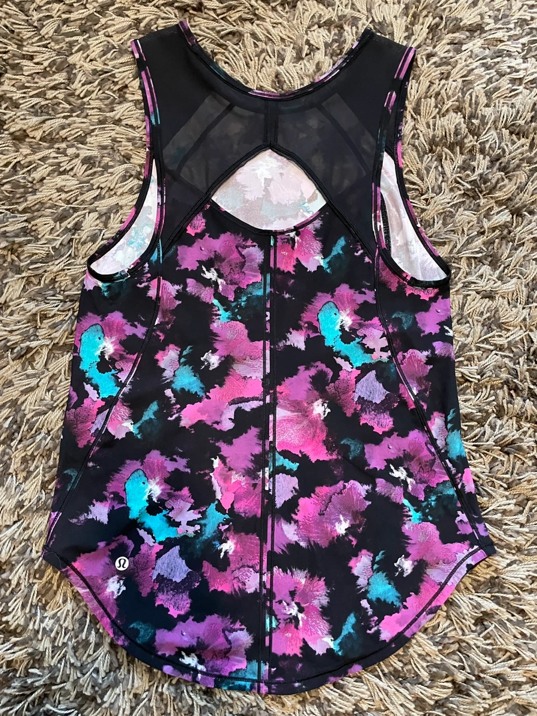 60Selling a Lululemon tank top in size 6. It has a pretty floral pattern with black accents. The back has a mesh design detail. Great for workouts or casual wear!