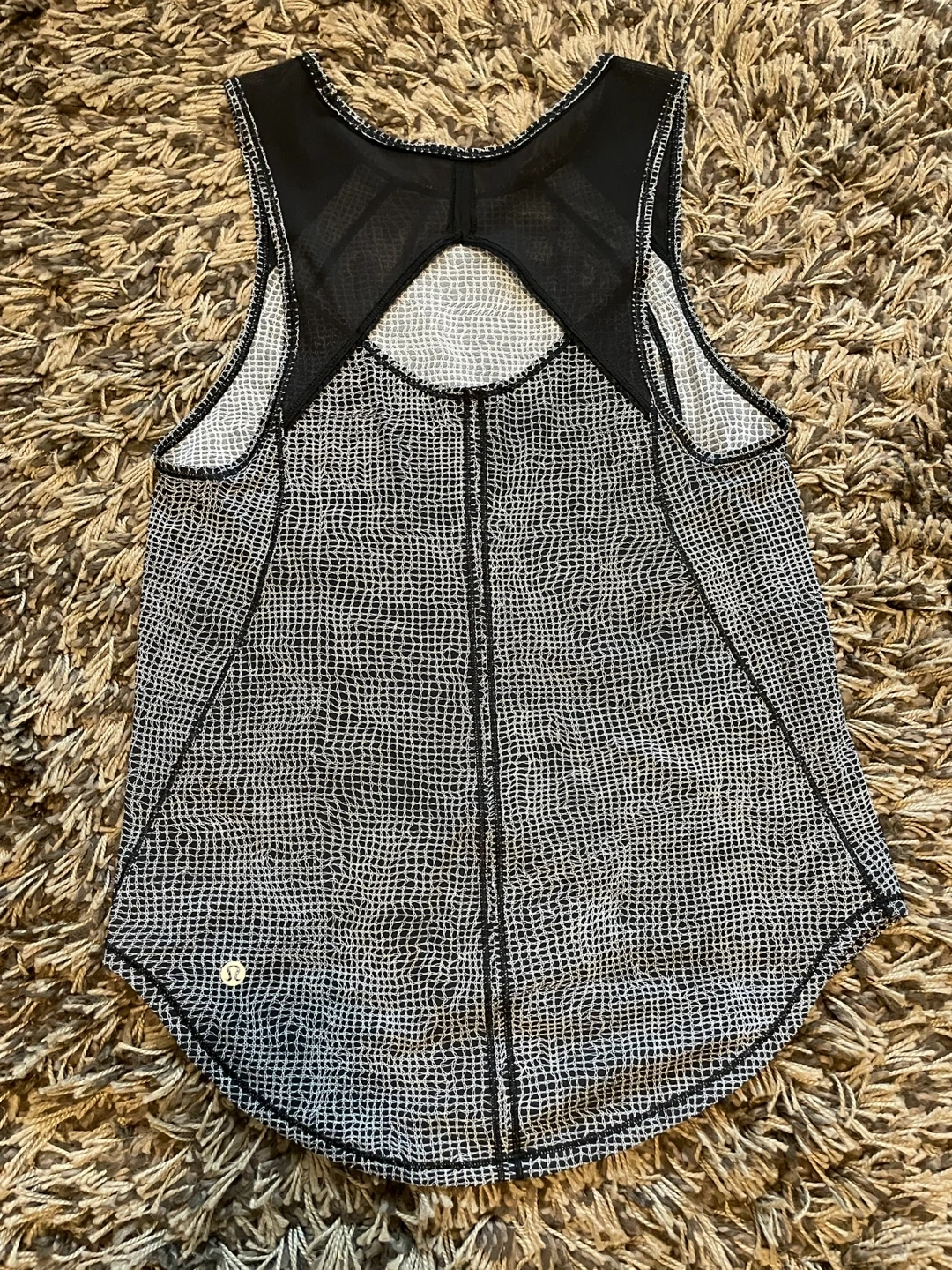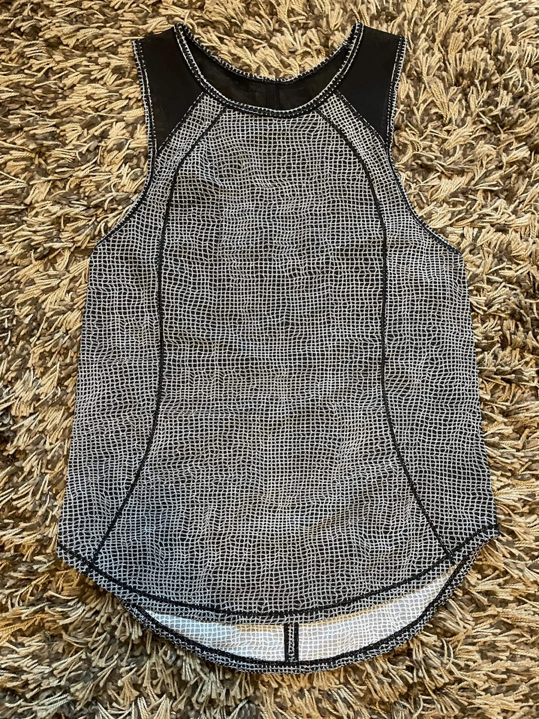 60Selling a Lululemon tank top in great condition! It's a size 6 and features a unique black and white pattern with black mesh detailing on the upper back. Perfect for workouts or casual wear!