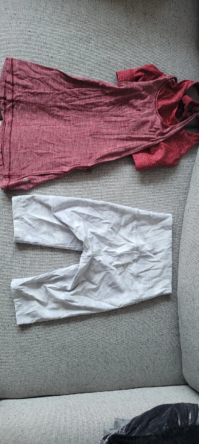 65Selling a Lululemon top and leggings set. Both items feature the Lululemon logo. The top is a dark rose sport bra and tank combo, and the shorts are a light grey camo pattern. Great for workouts or casual wear!