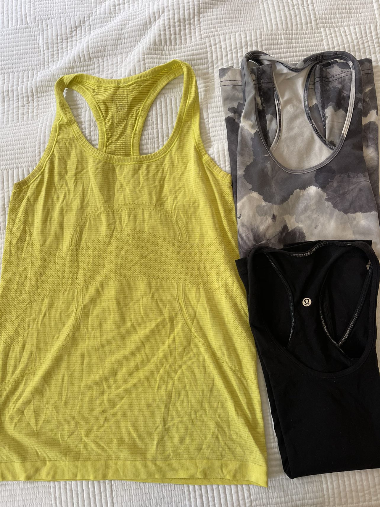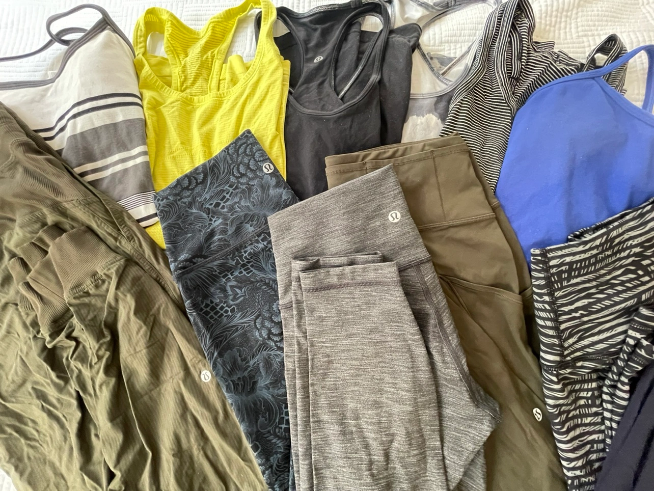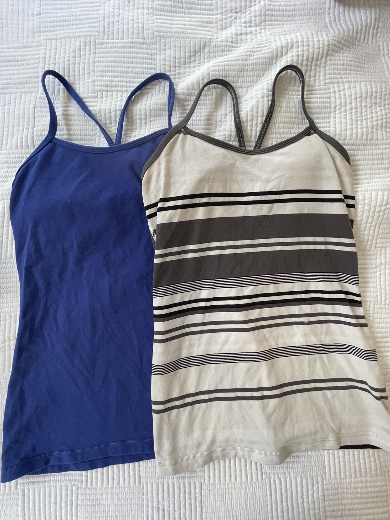TOPS: - Spaghetti razor backs: 2 for $10, size 6 - Razor backs: 3 for $15, size 6 BOTTOMS: - $10 each for quarter length pants (grey, black and blue, black and grey), size 6 - $20 for dark green Dance Studio Pants (full length), size 8 - $15 for dark green quarter length, size 8