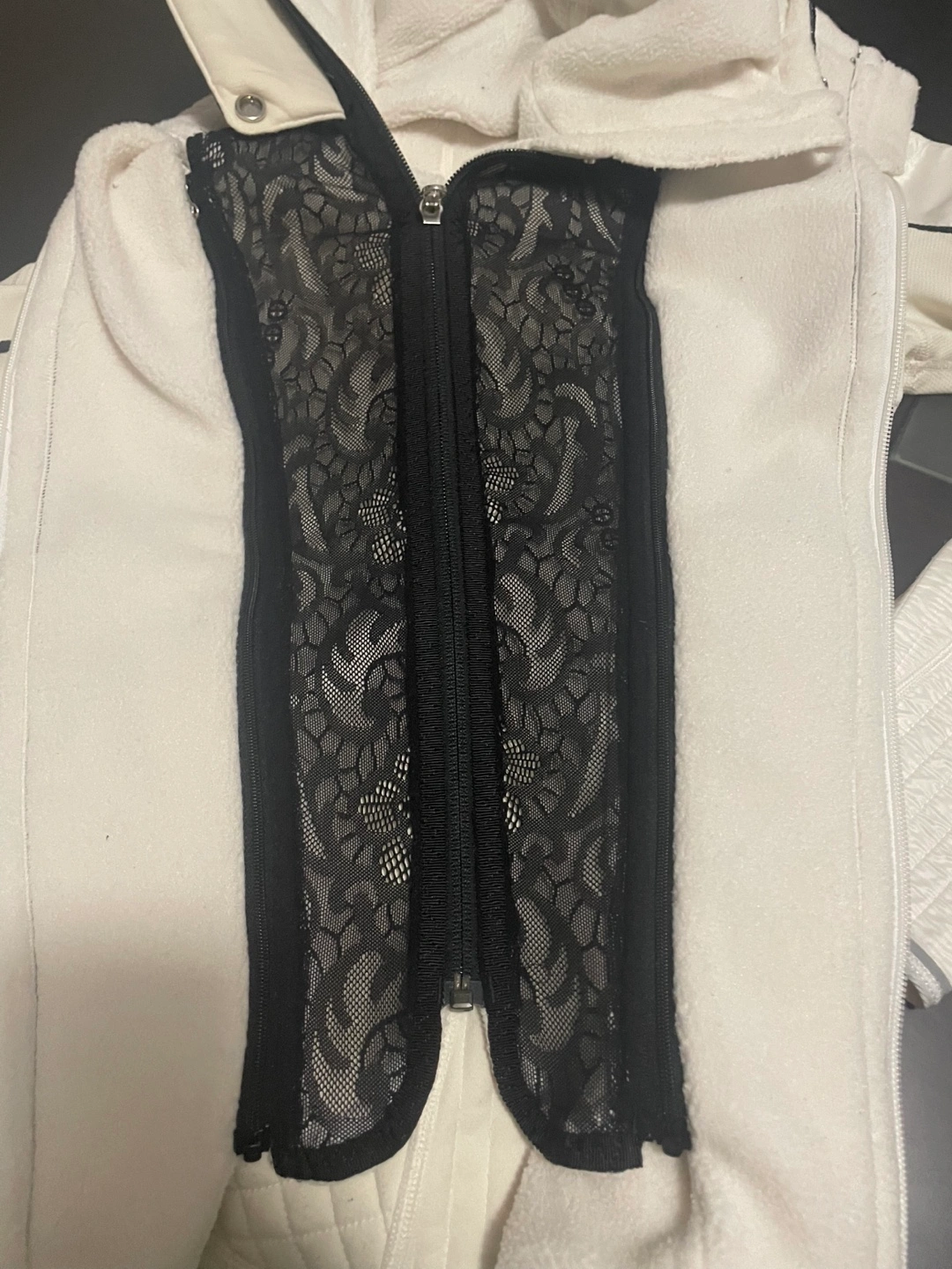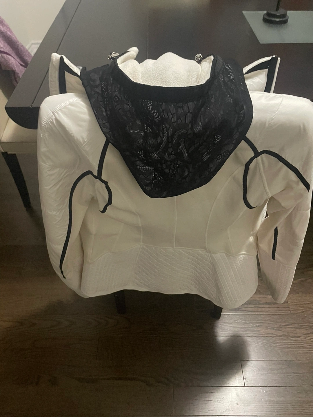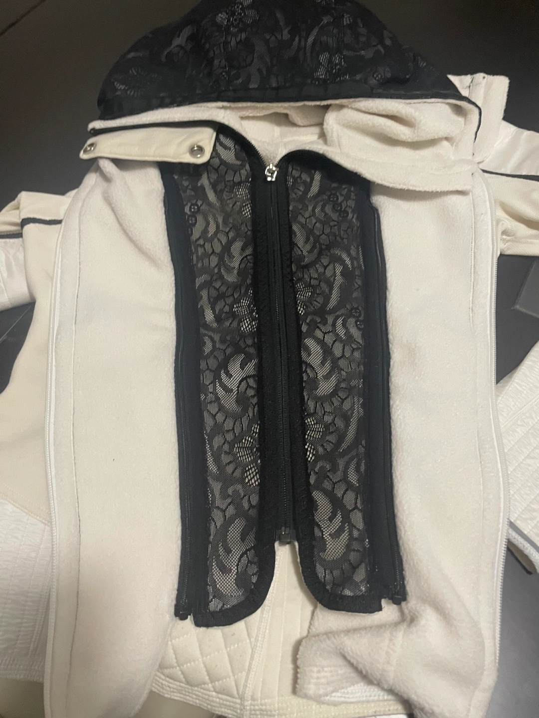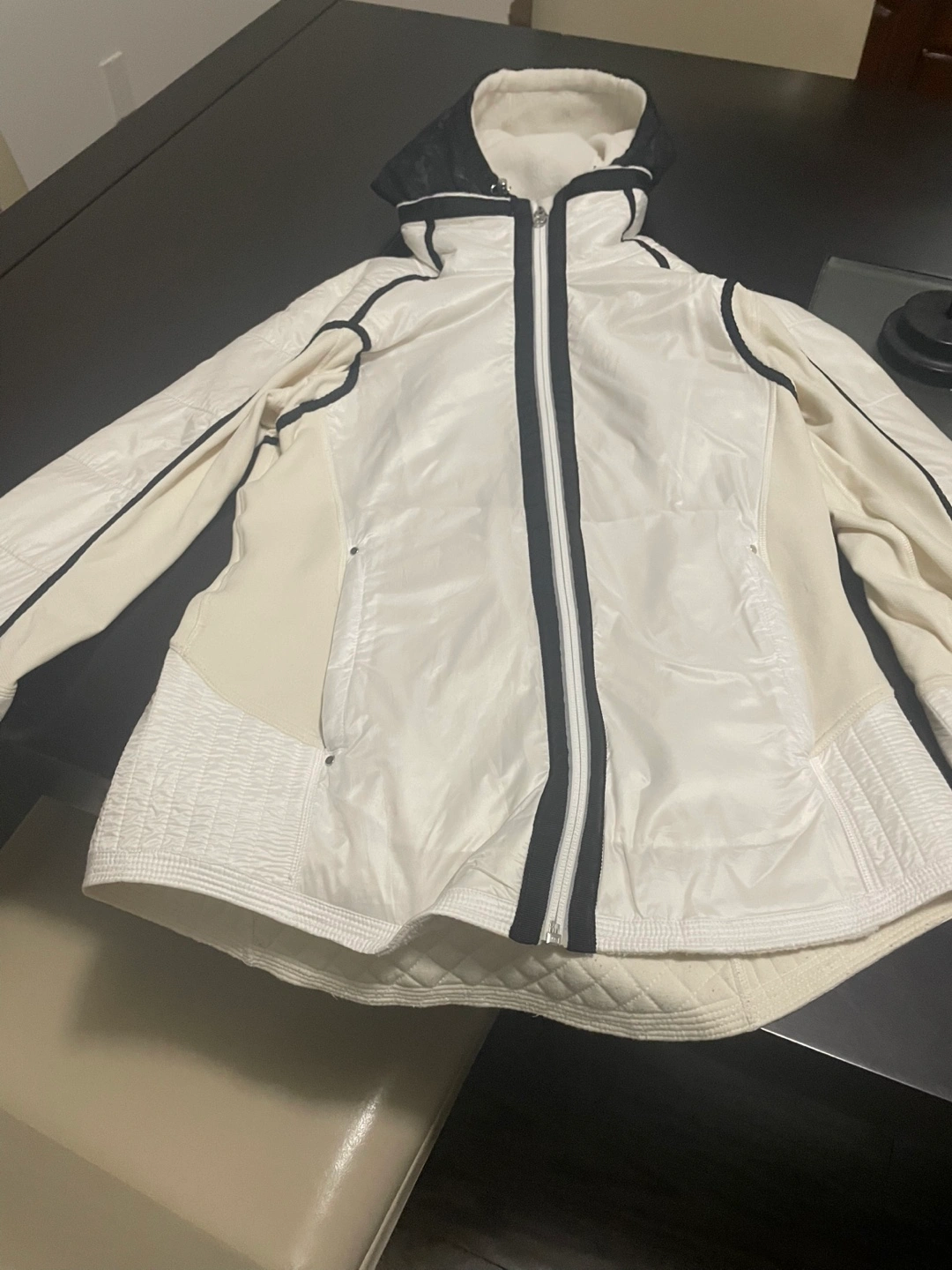 Selling a Lululemon jacket in white/cream. It's in great shape and ready for a new home! The jacket features a unique design with black lace detailing and quilted accents. Perfect for layering or wearing on its own during fall or cooler weather. Hood and lace front both can be removed leaving the jacket only.